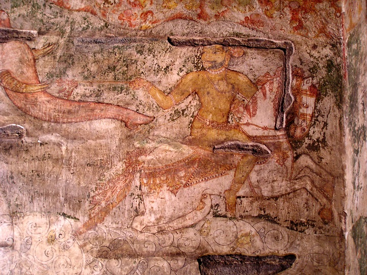 துதிக்கையை முன்னுக்கு நீட்டியவாறு விரைந்து தாவும் யானையின் முன் குதிரையொன்று நான்கு கால் பாய்ச்சலில் முன்னேறுவதைச் சோழ ஓவியர்கள் படம்பிடித்துள்ளனர். குதிரையின் முன்கால்கள் தாவலில் வளைந்திருக்க, பின்கால்கள் நீர்ப்பெருக்கிலிருந்து விடுபடும் நிலையில் உந்துகின்றன. அதன் அடர்த்தியான வாலைச் சுற்றி அதன் தொடக்கத்தில் தொங்கல்களுடன் ஓர் அலங்காரச் சுருள்.