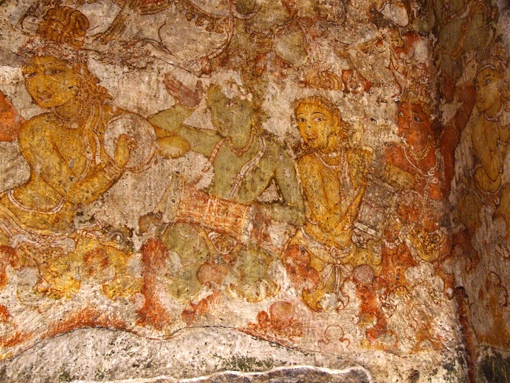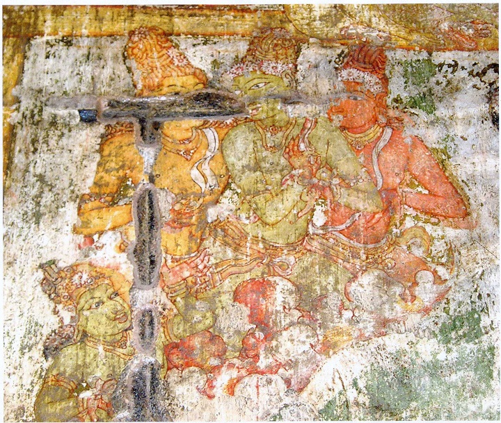 மூவரில் மஞ்சள் வண்ணர் வலக்கையிலும் பச்சை வண் ணர் இடக்கையிலுமாய் நன்கு மலர்ந்த தாமரைப்பூக்களை ஏந்தியுள்ளனர். வியப்பு முத்திரையிலுள்ள சிவப்பரது இடக்கை வினாக்களும் விளக்கத் தேடலுமாய்ப் பிறந்திருக்கும் அவரது பார்வையோடு ஐக்கியமாகிப் பொருள் பொதிந்த கோலம் கொண்டுள்ளது. பச்சை வண்ணரின் வலக்கை சின்முத்திரை காட்ட, அதற்குக் காரணமானவர் போல் மஞ்சளழகர் காட்சி தருகிறார். வாய்ப்பகுதி சிதைந்திருந்தாலும் அவரது நெற்றிப் பகுதியும் கையமைப்பும் உடன்கூட்டத்தாரின் மெய்ப்பாடு களும் உரையாடுபவர் இவரே என்பதை மிக நயமாகச் சுட்டி விடுகின்றன.