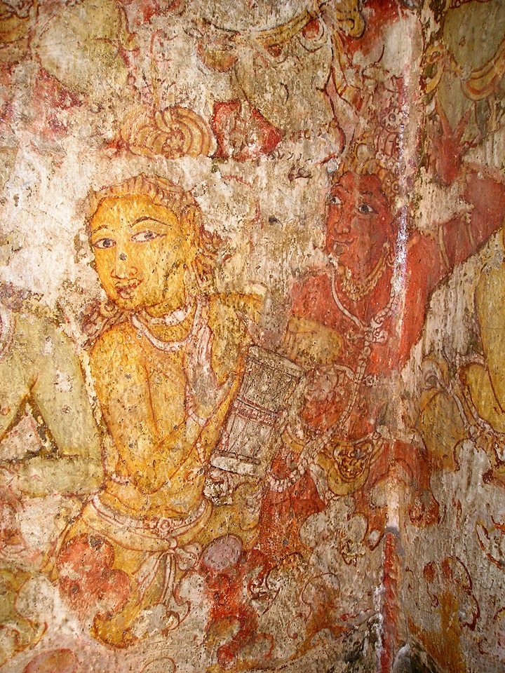 ஆடற்கலைஞர்களை அடுத்த ஆடவர் மூவரும் இசைக் கலைஞர்கள். முதலாமவர் ஆடிக்கொண்டே இலைத்தாளங் களை இயக்குகிறார். நெற்றிப்பட்டம் தழுவிய சடைமகுடரான அவரது மார்பில் வஸ்திர முப்புரிநூல். கழுத்தில் சரப்பளி. கைகளில் வளைகள் அடுக்கியுள்ள அவருக்கும் கங்கணங்க ளில்லை. செவிக்குண்டலங்களை அடையாளம் காணமுடியா அளவிற்கு மகுடம் மீறிய சடைப்புரிகள் அடர்ந்து தொங்கு கின்றன. இடுப்பில் அரைப்பட்டிகையுடன் சிற்றாடை. இடைக் கட்டின் முடிச்சுத்தொங்கல்கள் இடப்புறம் தெரிகின்றன. அவரது இடைநெளிவும் உடல் ஒருக்கணிப்பும் வலச்சாய் வாய்த் திரும்பிய முகமும் அவரை ஆடலில் தேர்ச்சி பெற்ற இசைக்கலைஞராக அறிமுகப்படுத்துகின்றன. மெய்ப்பாட்டு அலைகள் முத்தமிடும் கரை போலக் கனவுகள் சுமந்த விழி களில் அந்த இளமுகமே புத்தழகு பெற்றுவிடுகிறது. மிகச் சிறந்த கலைஞர் அவரென்பதை அவரது பார்வைப் பின்னல்களே பக்குவமாய் விளக்கிவிடுகின்றன. சோழ ஓவியர்கள் சிகர உச்சி யைத் தொட்டிருக்கும் இந்தக் கலைஞரின் படப்பிடிப்பு, தமிழ் நாட்டுக் கலைவரலாற்றின் காலமுத்திரை.