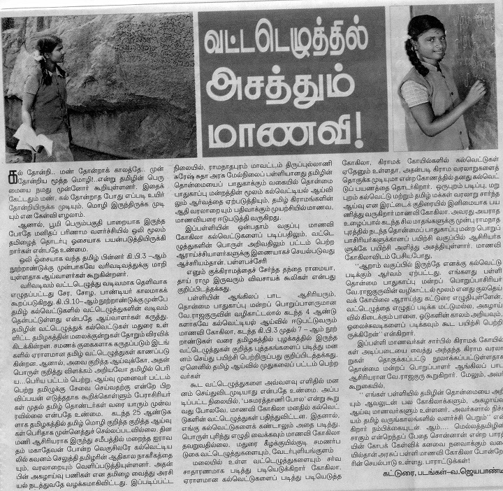 12. 12. 2018 தினமணி மகளிர் மணி இதழின் முதல் பக்கத்தில் 'வட்டெழுத்தில் அசத்தும் மாணவி' என்ற தலைப்பில் திரு. வ. ஜெயபாண்டி எழுதியிருந்த கட்டுரையை நீயும் படித்திருப்பாய் என்று நம்புகிறேன். திருப்புல்லாணி அரசு மேனிலைப்பள்ளியில் ஒன்பதாம் வகுப்புப் பயிலும் மாணவி செல்வி இரா. கோகிலா வட்டெழுத்துக் கல்வெட்டுகளைப் படிப்பதிலும் ஊரகக் கோயில்களின் வரலாற்றைத் தொகுப்பதிலும் கொண்டிருக்கும் ஆர்வம் குறித்த கட்டுரை அது. இந்த இளம் வயதிலேயே ஆசிரியர்களுக்கும் கோகிலா கல்வெட்டுப் பயிற்சி அளிப்பதாகவும் இதற்கெல்லாம் காரணர் அப்பள்ளியின் தொன்மை மன்றப் பொறுப்பாளரும் ஆங்கிலப் பாட ஆசிரியருமான திரு. வே. ராஜகுரு என்றும் அவரது வழிகாட்டலில் பள்ளி மாணவர்கள் பலர் ஊரக வரலாறுகளைத் தொகுத்து நூல்களாக்கியுள்ளதாகவும் திரு.ஜெயபாண்டி தம் கட்டுரையில் குறிப்பிட்டுள்ளார். இவ்வரிய செய்தியைப் பகிர்ந்துகொண்டதுடன், கட்டுரையாளர் தம் பதிவை நிறைவு செய்திருந்தால் இம்மடலுக்கு இடமிருந்திருக்காது. நாமும் தமிழ்நாட்டு வரலாற்றிற்கு வளம் சேர்க்கும் தொண்டாக அதைக் கருதித் தமிழ்நாட்டில் வரலாற்றாய்வுப் பணியில் ஈடுபட்டுள்ள அனைத்து ஆய்வாளர்களின் சார்பிலும் திரு. வெ. ராஜகுரு, வட்டெழுத்துச் செல்வி கோகிலா, திரு. ஜெயபாண்டி மூவருக்கும் நம் உளம் கனிந்த பாராட்டுக்களையும் வாழ்த்துக்களையும் தெரிவித்து மகிழ்ந்திருப்போம். உளம் களிக்க வைக்கும் இந்தச் சிறப்புச் செய்தியை உள்ளடக்கிய கட்டுரையை வெளியிட்டு, மேனிலைப்பள்ளி ஒன்றின் தொன்மை மன்றம் ஆற்றிவரும் அரும்பணியை நாடறியச் செய்திருக்கும் தினமணி நாளிதழுக்கும் நம் உளமார்ந்த பாராட்டைப் புலப்படுத்தி நிறைந்திருப்போம். ![]() ஆனால், நற்செய்தியைக் கட்டுரையாக்கிய திரு. ஜெயபாண்டி, தமிழ்நாட்டுக் கல்வெட்டியல் வரலாறு பற்றி அறியாதநிலையில், தம் கட்டுரையில் பிழையான சில செய்திகளையும் தவறான சில கூற்றுகளையும் பதிவு செய்திருக்கிறார். அவை குறித்து உரிய சான்றுகளுடன் தினமணி நாளிதழின் ஆசிரியர் திரு. கி. வைத்தியநாதனுக்கு மின்னஞ்சலில் ஒரு மடல் அனுப்பியதுடன், 'ஆசிரியரின் நேரடிப் பார்வைக்கு' என்ற குறிப்புடன் அதே மடலின் படியை விரைவஞ்சலிலும் அனுப்பியுள்ளேன். ஓர் அருஞ்செயலைப் பாராட்டிப் பதிவுசெய்வது போற்றத்தக்கதே. ஆனால், அது காரணமாகப் பிழையான தரவுகளை, தவறான கருத்துக்களை முன்னிருத்துவது சரியன்று. தினமணி என் மடலைப் பதிப்பிக்குமா என்பதறியேன். அதனால்தான், திரு. ஜெயபாண்டியின் தவறான மொழிவுகளையும் அவற்றுக்கான என் பதிவுகளையும் உன்னுடன் பகிர்ந்து சற்றே ஆறுதல் காண்கிறேன். 1. ஒலி ஓசையாக வந்த தமிழ் கி. பி. 3ஆம் நூற்றாண்டுக்கு முன்பாகவ
