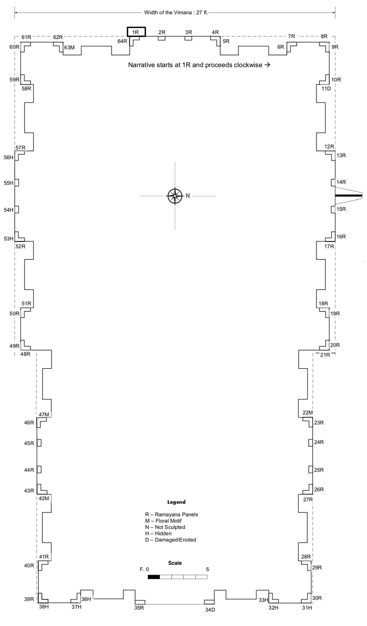 இவற்றுள் ஒவ்வொரு பகுதியிலும் அமைந்துள்ள பாதங்களும் அவற்றில் சித்தரிக்கப்பட்டுள்ள காட்சிகளும் கீழே கொடுக்கப்பட்டுள்ளன. பகுதி 1 (விமானம் - மேற்கு) இராமாயணக் கதை துவங்கும் விமான மேற்குச் சுவரின் சாலைக் கோட்டத்தின் கீழ் அமைந்துள்ள வேதிபாதம் முதல் அதே சுவரின் வடக்கு கர்ணப்பத்தியில் அமைந்துள்ள வேதிபாதம் வரையிலான 8 பாதங்களிலும் இராமாயணக் காட்சிகள் காண்பிக்கப் பட்டுள்ளன. இவை இராமனின் பிறப்புக்கு முன் தேவலோகத்தில் நடைபெறும் சில நிகழ்வுகள், தசரதரின் வேள்வி, இராமனின் பிறப்பு மற்றும் இளமைப் பருவ நிகழ்வுகளைச் சித்தரிப்பதாக அமைந்துள்ளன. கதையின் துவக்கத்தில் பிரம்மன் தாமரை மலரில் அமர்ந்தபடி தேவர்களுக்கும் முனிவர்களுக்கும் இராமன் கதையை எடுத்துரைக்கும் காட்சி இடம் பெற்றுள்ளது (எண் 1). அமர்ந்த நிலையில் பிரம்மனின் இருபுறங்களிலும் காண்பிக்கப்படும் நான்கு முனிவர்கள் அவரது புதல்வர் களான சனத்குமாரர்களாகலாம். இதற்கடுத்து அமைந்துள்ள இரண்டு பாதங்களும் (எண் 2 & 3) ஒரே காட்சியின் இரு பகுதிகளாக அமைந்துள்ளன. பிரம்மனும் இரு தேவர்களும் விஷ்ணுவைச் சந்தித்ப்பதை இவை காட்சிப்படுத்துகின்றன. கருட அணுக்கராகக் காட்டப்படும் விஷ்ணு கருடனுடனான உரையாடலில் ஈடுபட்டிருக்கிறார். இதற்கடுத்த காட்சி விஷ்ணு பாற்கடலில் பள்ளி கொண்டிருக்க, பூதேவியும் தேவர்களும் முனிவரும் அவரிடம் வேண்டுகோள் விடுப்பதைச் சித்தரிக்கின்றது (எண் 4). இராவணனின் தொல்லைகளை அடக்க பூமியில் அவதரிக்குமாறு அவர்கள் விஷ்ணுவை வேண்டும் காட்சியாக இதனைக் கருதலாம். இதற்கடுத்து அமைந்துள்ள பாதத்தில் சிற்பிகள் தயரதனின் வேள்வியை செதுக்கியுள்ளனர். பத்து கதாபாத்திரங்களுடன் விரிவாகப் படமாக்கப்பட்டிருக்கும் இக்காட்சியில் வேள்வித்தீயிலிருந்து பூதம் தோன்ற, மன்னர் அது கொடுக்கும் பிண்டத்தை வாங்கும் நிலையில் காட்சியளிக்கிறார் (எண் 5). அடுத்த காட்சி அந்தப்புரத்தில் கவரிப் பெண்கள் சூழ அரசர் ஆசனத்தில் அமர்ந்து பூதம் கொடுத்த பிண்டத்தைத் தமக்கு எதிரே அமர்ந்திருக்கும் தேவியர்க்கு அளிப்பதைக் காட்டுகிறது (எண் 6). இதற்கடுத்த பாதத்தில் மூன்று தேவியர்க்கும் மகப்பேறு உண்டாகி பிள்ளைப்பேறு முடிந்து அவர்கள் தமது சிசுக்களை அரசர்க்கு அறிமுகப்படுத்தும் காட்சி படமாகியுள்ளது (எண் 7). பல கதாபாத்திரங்களுடன் விரிவாகச் சித்தரிக்கப்பட்டுள்ள இக் காட்சியில் அரச குடும்பத்தைச் சேர்ந்த பெண்ணொருவர் மகவு பிறந்துவிட்ட செய்தியை அரசரிடம் அறிவிப்பது குறிப்பிடத்தக்கது. விமான மேற்குப் பகுதியின் கடைசி வேதிபாதக் காட்சியில் ஆலிட நிலையில் நின்றபடி வசிட்ட முனிவர் இராமனுக்கு வில்வித்தை கற்று