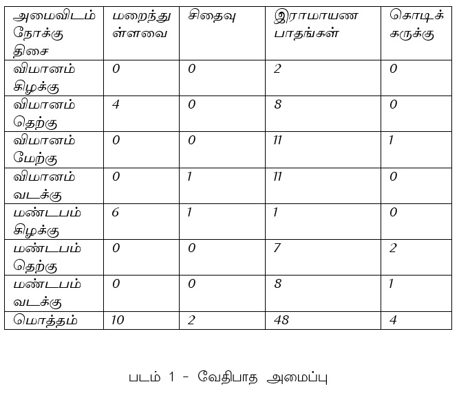 வேதிபாதங்களின் அமைப்பு புள்ளமங்கை விமானம் மற்றும் மண்டபத்தின் கபோதபந்தத் தாங்குதளத்திற்கு மேல் அமைந்துள்ள வேதிகைப் பகுதியில் 64 தூண் பாதங்கள் செதுக்கப்பட்டுள்ளன. இவற்றுள் 38 பாதங்கள் விமானத்திலும் 26 மண்டபத்திலும் அமைந்துள்ளன. விமான பாதங்களுள் 20 கர்ணப் பத்தியிலும் 18 சாலைப் பத்தியிலும் செதுக்கப்பட்டுள்ளன. மண்டப பாதங்களுள் 12 கர்ணப் பத்தியிலும் 12 சாலைப் பத்தியிலும் 2 மண்டப நுழைவாயிலின் இரு புறங்களிலும் அமைந்துள்ளன. மொத்தமுள்ள 64 பாதங்களுள் 10 பாதங்கள் பின்னாளைய கட்டுமானங்களால் மறைக்கப்பட்டுள்ளதால் இன்று காணும் நிலையில் இல்லை. இரண்டு பாதங்கள் அடையாளம் காணவியலாதவாறு சிதைந்துள்ளன. நான்கு பாதங்களில் சிற்பங்களுக்கு பதிலாகக் கொடிக் கருக்குகள் செதுக்கப்பட்டுள்ளன. மீதமுள்ள 48 பாதங்களில் இராமாயணக் காட்சிகள் குறுஞ் சிற்பங்களாகக் காணக் கிடைக்கின்றன. இக்காட்சிகளைச் சித்தரிக்கும் பாதங்களுள் கிழக்கு திசை நோக்குவனவாய் 3 பாதங்களும் தெற்கு நோக்கி 15 பாதங்களும் மேற்கு நோக்கி 11 பாதங்களும் வடக்கு நோக்கி 19 பாதங்களும் அமைந்துள்ளன. கீழ்காணும் அட்டவணையில் விமானத்திலும் மண்டபத்திலும் அமைந்துள்ள பாதங்களும் அவற்றுள் இன்று காணக்கிடைக்கும் வகையில் அமைந்துள்ள பாதங்களும் வரிசைப்படுத்தித் தரப்பட்டுள்ளன. ![]() அடுத்தடுத்து அமைந்துள்ள இக்காட்சிகளை ஒப்பிட்டும் இணைத்தும் நோக்கும்போது அவை ஒன்றுக்கொன்று தொடர்புடையனவாய் இருப்பதையும் இராமாயணக் கதையின் காட்சிகளை ஒரு சிற்பத் தொடராகச் சித்தரிப்பதையும் புரிந்துகொள்ள முடிகிறது. இதே போன்ற இராமாயணக் குறுஞ்சிற்பத் தொடர்கள் முற்சோழர் காலக் கோயில்களான திருச்சென்னம்பூண்டி சடைமுடிநாதர் திருக்கோயில், கும்பகோணம் நாகேஸ்வரர் திருக்கோயில், திருமங்கலம் சாமவேதீசுவரர் திருக்கோயில் முதலான திருக்கோயில்களிலும் அமைந்துள்ளமை குறிப்பிடத்தக்கது. கதையமைப்பு இராமாயணக் கதைத் தொடர், விமானத்தின் மேற்குச் சுவரில் அமைந்துள்ள சாலைக்கோட்டத்தின் கீழ் அமைந்துள்ள வேதிகையின் தென்மேற்குப் பகுதியில் மேற்கு நோக்கிய பாதத்தில் துவங்கி கடிகாரச் சுற்று வரிசையில் இடமிருந்து வலமாக வளர்ந்து வடக்கு, கிழக்கு மற்றும் தெற்குச் சுவரின் வேதிகைப் பாதங்களில் நீண்டு அதே மேற்குச் சுவர் கோட்டத்தின் தென்மேற்குப் பகுதியில் தெற்கு நோக்கிய வேதிகைப் பாதத்தில் சென்று முடிகிறது. ![]() வேதிபாதங்களின் அமைவிடம், நோக்கும் திசை மற்றும் கதையின் தொடரமைப்பு ஆகிய மூன்றையும் கருத்தில் கொண்டு புள்ளமங்கை இராமாயணக் கதையைமைப்பை ஒன்பது பகுதிகளாகப் பிரிக்கலாம். இப்பகுதிகளும் அமைவிடமும் கீழ்க்காணும் அட்டவணையில் இடம் ப