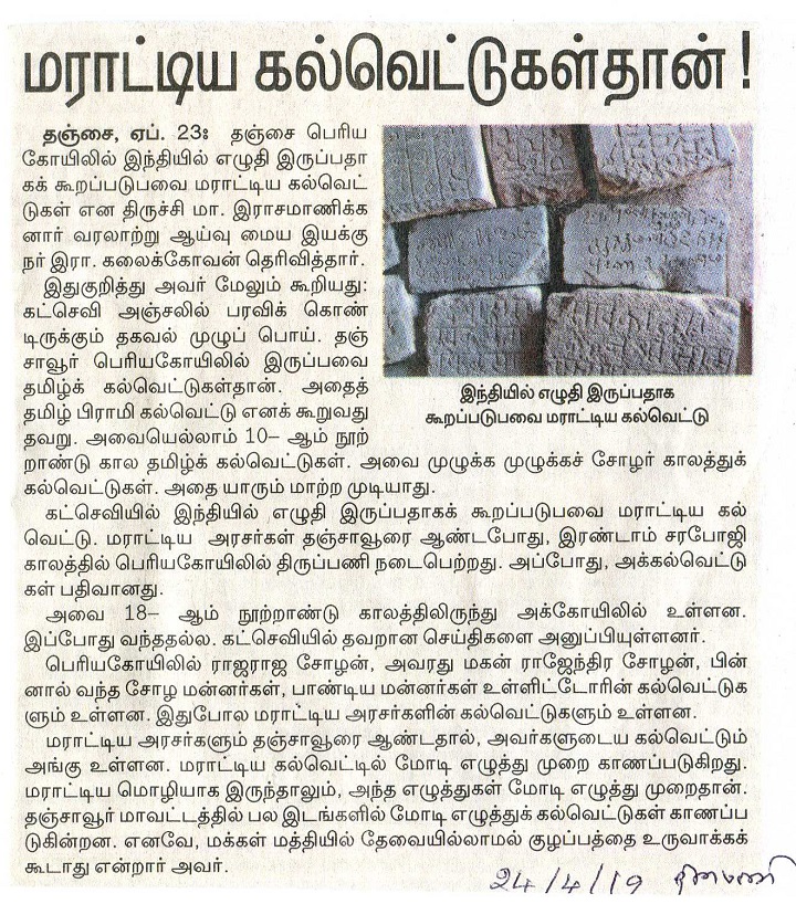 வரலாறு படும் பாடு! அன்புள்ள வாருணி, நலந்தானே. 1. 5. 2019 தினமணி படித்து இதழின் தலையங்கப் பக்கத்தில், 'அவசியமில்லை, அறநிலையத்துறை!' எனும் தலைப்பில் திரு. டி. எஸ். தியாகராசன் எழுதியுள்ள கட்டுரையில் தரப்பட்டுள்ள வரலாற்றுச் செய்திகள் குறித்துக் கேட்டிருந்தாய். நீ கருதியவாறே பல தரவுகள் பிழையாக உள்ளன. நானே உனக்கு எழுதவேண்டும் எனக் கருதியிருந்தபோது உன் மடல் வந்தது. 29. 4. 2019 இந்தியன் எக்ஸ்பிரஸ் நாளிதழின் நான்காம் பக்கத்தில் தஞ்சாவூர்க் கோயிலின் கல்வெட்டுகள் இந்தி மொழிக்கு மாற்றப்படுவதாகப் பரவிய செய்தியை மறுத்து நம் இனிய நண்பர் முனைவர் சு. இராசவேல் அளித்திருந்த நேர்முகம் வெளியாகியிருந்தது. அதிலிருந்த ஒரு செய்தி குறித்தே உனக்கு எழுத நினைத்திருந்தேன். அதற்குள் தினமணி கட்டுரை உன் வழி என் கண்முன். முதலில் தினமணி பார்ப்போம். ![]() 1. 'கோச்செங்கணான் சோழன் செங்கற் கோயில்களைக் கற்கோயில்களாக மாற்றி மகிழ்ந்ததாக' அக்கட்டுரையில் திரு. டி. எஸ். தியாகராசன் எழுதியுள்ளமை சரியன்று. கட்டுரையாளரே இவ்வரிக்கு மேலுள்ள வரியில், 'செங்கற்களால் கட்டப்பட்டு வந்த கோயில்கள் பல்லவ மன்னர்கள் காலத்தில் கற்கோயில்களாக வளர்ச்சி பெற்றன' என்று குறிப்பிட்டுள்ளார். தமிழ்நாட்டில் பல்லவர் ஆட்சியை நிலைப்படுத்திய சிம்மவிஷ்ணுவுக்குக் காலத்தால் முற்பட்டவர் கோச்செங்கணான். மாடக்கோயில்களை எழுப்பிப் புகழ்பெற்றவர். அவரை சம்பந்தர், சுந்தரர், திருமங்கையாழ்வார் பாடியுள்ளனர். கோச்செங்கணான் எழுப்பிய அனைத்துக் கோயில்களும் செங்கல் கட்டுமானங்கள். (டாக்டர் மா. இராசமாணிக்கனார், பெரியபுராண ஆராய்ச்சி, பக். 79-86, கோ. வேணி தேவி, இரா. கலைக்கோவன், மலைக்கவைக்கும் மாடக்கோயில்கள், பக். 15-31) 2. 'ராஜகோபுரங்களை விஜயநகரப் பேரரசின் காலத்தில் எழுப்பினார்கள்' என்ற கட்டுரையாசிரியன் சுட்டலும் சரியன்று. பிற்சோழர் காலத்திலிருந்தே பேரளவிலான கோபுரங்கள் உருவாகியுள்ளன. பிற்பாண்டியர் காலக் கோபுரங்கள் மதுரை மீனாட்சியம்மன் கோயிலிலும் திருவானைக்கா ஜம்புகேசுவரர் கோயிலிலும் கல்வெட்டுச் சான்றுகளுடன் இன்றும் எழுச்சியோடு திகழ்கின்றன. விஜயநகர அரசர்கள் இவர்களைப் பின்பற்றினார்கள் என்பதே சரி. 3. இராஜராஜன் பெருவுடையார் கோயிலில் விளக்கு வைக்கத் திட்டம் வகுத்ததாகக் கூறும் கட்டுரையாசிரியர், கால்நடைகளின் விலை குறிப்பிட்டு, 'ஆடோ, மாடோ மன்னனிடம் பெற்ற உழவன் தினம் ஒரு உழக்கு நெய்யை கோயில் விளக்கெரிக்கத் தரவேண்டும் என்பது நிபந்தனை' என்று எழுதியுள்ளார். இச்செய்தியைக் கட்டுரையாளர் எந்தக் கல்வெட்டின் வழிப் பெற்றார் என்பது தெரியவில்லை. தெரிந்துகொள்ள விழைந்து தினமணிக்கு எழுதியுள்ளேன். கோயில்களு