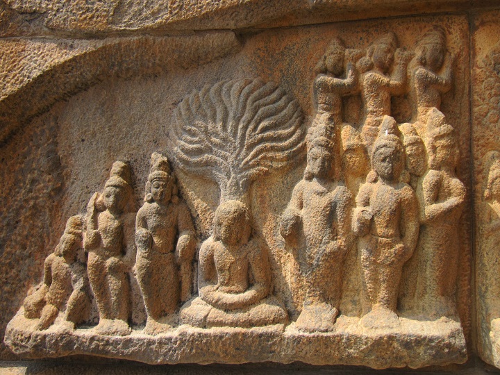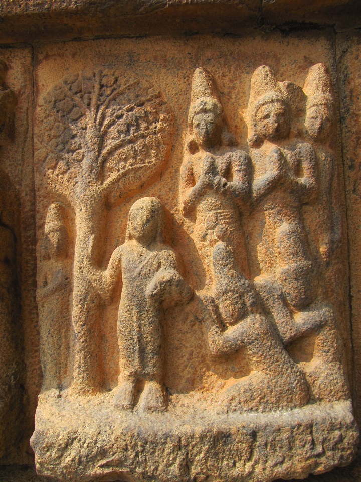 இராஜராஜீசுவர முப்புரக் காட்சிகளில் மூன்றிடங்களிலுமே ஆதிபுத்தராகத் திருமாலும் உடன்சென்ற நாரதருமே கதையைத் தொடங்குகின்றனர். ஓவியப்பதிவிலும் கோபுரத் தொடரிலும் சிதைவுகளிருப்பதால் நிகழ்வுகளைப் படித்தொடருடன் பின்பற்றலாம். முதல் காட்சியில் ஆதிபுத்தர் அர்த்தபத்மாசனத்தில் இருகால்களையும் மடக்கி இருகைகளையும் தியான முத்திரையில் இருத்தித் தவக்கோலத்தில் அமர்ந்திருக்கிறார். அவர் பின்னால் போதிமரம். அவருக்கு வலப்புறம் மூவரும் இடப்புறம் எண்மரும் உள்ளனர். வலப்புறத்தாரில் இருவர் வாளுடன் நிற்க, ஒருவர் அமர்ந்துள்ளார். இடப்புறம் நிற்பவர்களில் இருவர் நேர்ப் பார்வையுடன் இருக்க, அறுவர் புத்தரின் உரை கேட்க விரும்பாதவர் போல் முகம் திருப்பியுள்ளனர்.