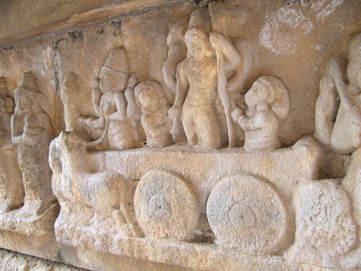 அடுத்திருக்கும் இரண்டு நிகழ்வுகளும் முப்புரப் போரையும் கருத்து மாறாத மூவர் சிவனருள் பெற்றதையும் படம்பிடிக்கின்றன. சிவபெருமானின் தேர் கண்கொள்ளாக் காட்சியாக விளங்குகிறது. தேரின் ஒருபகுதியே பார்வையில் பதிவானாலும் அதன் சக்கரங்களும் தேரிழுக்கும் குதிரையும் அவற்றை இயக்கும் நான்முகனின் தோற்றமும் தேரின் பெருமையையும் முழுமையையும் பன்மடங்காக்கிக் கண்முன் விரிக்கின்றன. தேருக்குள் இருபுறமும் பூதங்கள் நிற்க, நடுவில் கைகளில் வில்லும் அம்புமாய் சிவபெருமான்.