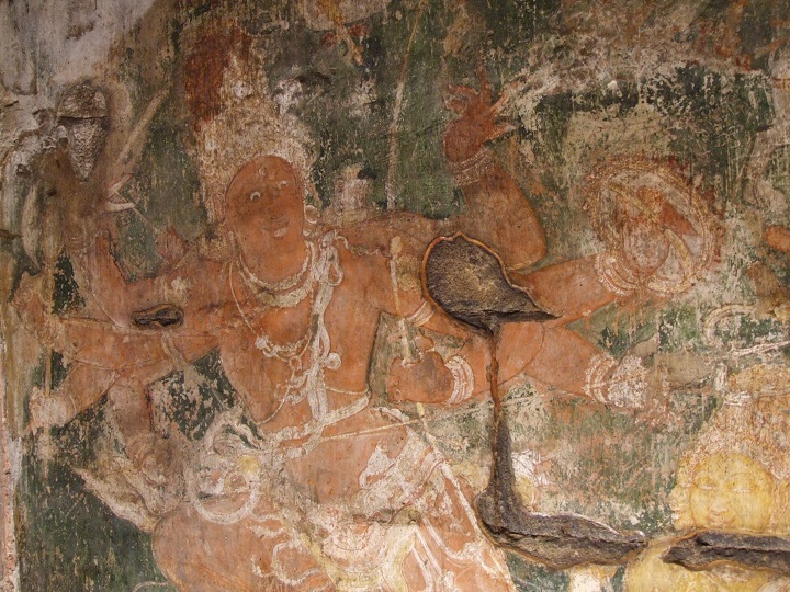 ஓவியக்காட்சியில் சினம் கொப்பளிக்கப் புருவங்களை நெறித்து வில் வளைத்து நிற்கும் சிவபெருமான், இங்குப் போர் முடித்த அமைதியில் தேர் நோக்கி நிற்கும் சைவநெறிக் காவலர் மூவரை எதிர்கொள்பவராய்க் காட்சிதருகிறார். அமைதியும் அருளுமாய் விரியும் இந்தப் படப்பிடிப்புக்கு நேர்மாறாகப் போரின் உச்சம் காட்டி, அதன் நிகழ்வுகள் விரித்துச் சோழர் காலப் போர் நெறிகளைக் கண்முன் வைக்கிறது ஓவியப்பதிவு.