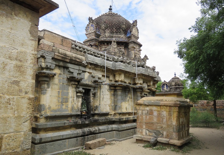 ![]() அலகறை சேமீசுவரம் விமானம் கோபுரம் துணைத்தளம், பாதபந்தத் தாங்குதளம் பெற்றெழும் சேமீசுவரக் கோபுரத்தின் வாயில் அரைச்சுவருடன் நிற்கிறது. பாம்புப் படமும் தாமரைவரியும் பெற்ற நிலைக்கால்களால் அணைக்கப்பட்டுள்ள வாயிலின் வலப்புறச் சுவரில் பொ. கா. 1887 ஆகஸ்டில் (சர்வஜித் ஆவணி 10) பொறிக்கப்பட்டுள்ள தமிழ்க் கல்வெட்டு, திருச்சிராப்பள்ளி மாவட்டம் முசிறி வட்டம் அலகறை கிராமத்து தர்மசம்வர்த்தனி, சோமசுந்தரேசுவரர் கோயிலுக்குச் சுற்றுமதில் எழுப்ப நாகயநல்லூர் கல்யாணசுந்தரர் நினைவாக அவர் மகன் பாஸ்கரன் 500 ரூபாய் கொடையளித்த தகவலைத் தருகிறது.2 கோபுரத் தென், வடஅகச்சுவர்களில் பரவியுள்ள மூன்றாம் குலோத்துங்கசோழரின் அரசாணைக் கல்வெட்டு இக்கோயிலின் தோற்ற வரலாற்றைத் தெளிவுறத் தருகிறது.3 வளாகச் சுற்று மதிலால் சூழப்பட்டுள்ள கோயில் வளாகத்தில் ஒருதளத் திராவிட விமானம், முகமண்டபம், பெருமண்டபம் என அமைந் துள்ளது சேமீசுவரர் திருமுன். அதன் பெருமண்டப வாயிலைப் பார்த்தவாறு துணைத்தளம், இருசதுர நீள்கட்டுத் தூண்கள், பூமொட்டுப் போதிகைகள், கூரையுறுப்புகள் என அமைந்த அழகிய கற்பந்தலில் பிற்சோழர் கால நந்தி. கழுத்திலும் முதுகிலும் கிளிஞ்சல் மாலைகள் படர, கழுத்தில் குஞ்சலங்களும் மணிகளும் கலந்தமைந்த மற்றொரு சரம். இரண்டுக்குமிடையில் பெருமணி கோத்த கழுத்துப் பட்டை. திமிலையொட்டி இருபுறத்தும் இறங்கும் நீள் குஞ்சலங்களை அடுத்து முதுகிலுள்ள ஈரடுக்கு மென்விரிப்பு மார்புப்பகுதியில் முடிச்சிட்டுக் கட்டப்பட்டிருப்பதுடன் வால்புறத்தும் இறுக்கப்பட்டுள்ளது. கொம்புகளைச் சுற்றியும் வளைந்திறங்கும் குஞ்சலங்கள். நந்தியின் தொடைப்பகுதிகளில் அழகிய கீர்த்திமுகப் பட்டைகள். வாயிலுக்கும் நந்திப்பந்தலுக்கும் இடையில் பலித்தளம். சுற்றின் தென்மேற்கு மூலையில் முச்சதுர, இருகட்டுத் தூண் கள் தரங்க வெட்டுப் போதிகைகளுடன் கூரைதாங்கும் முன்றிலை அடுத்துள்ள ஒருதள நாகர விமானம் துணைத்தளத்தின் மீதான தூண்களற்ற சுவரும் கூடுகளுடனான கபோதமும் பெற்றுள்ளது. இக்கருங்கல் கட்டுமானத்தின் மேலுள்ள விமான உறுப்புகள் காரையாலானவை. வேதிகையில் நாற்புறமும் நந்திகள் அமைய, நான்முக அரைத்தூண்கள் தழுவும் கிரீவகோட்டங்களில் உருக் குலைந்த சுதைவடிவங்கள். பிள்ளையார் இலலிதாசனத்திலுள்ள இதன் கருவறை வாயிலுக்கு மேல் யானைத்திருமகள். உறுப்பு வேறுபாடற்ற துணைத்தளம், தூண்களற்ற சுவர், கூரை யுறுப்புகள், ஆழமற்ற கூடுகளுடனான கபோதம் பெற்று ஒருதளத் திராவிடமாக மேற்கிலுள்ள சுற்றாலை விமானத்தில் முருகன் தேவியருடன் உள்ளார். கருவறை முன் முச்சதுர, இருகட்டுத் தூண்கள் தரங்க வெட்டுப் போதிகைகளுடன்