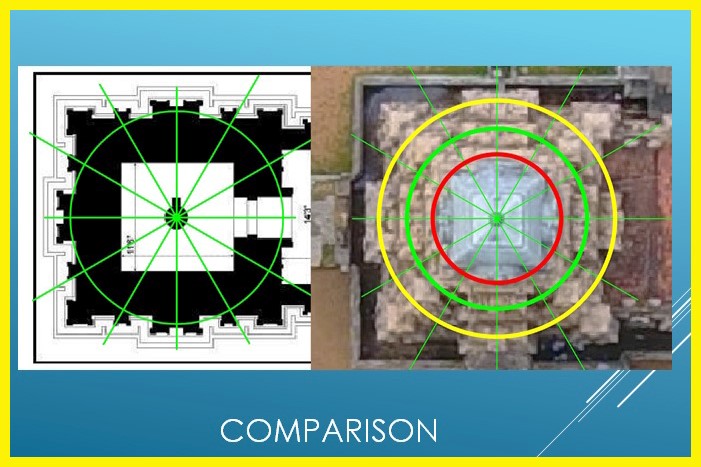 ![]() மேலே உள்ள படத்தைப் பாருங்கள். இது அனிமேஷனோ அழகுக்காக வரையப்பட்ட படமோ அல்ல. எடுக்கப்பட்ட உண்மையான அளவுகளை வைத்து உருவாக்கப்பட்ட தள வரைபடம். முன்னது வரைபடம். அடுத்தது உண்மையான ஆலயத்தின் உச்சித்தோற்றம். இரண்டிலும் உள்ள வட்டங்கள் தள ஆரத்தை அடிப்படையாகக் கொண்டவை. இதில் ஒரே ஒரு விஷயத்தை மட்டும் சுட்டிக்காட்ட விழைகிறேன். ஆரத்தை அடிப்படையாக வைத்து வரைந்த வட்டத்தின் பகுப்புகள் ஒவ்வொன்றும் 30 பாகை கொண்டது. இங்குச் சாலைப் பத்திக்கு இரண்டு பகுப்பும் கர்ணப் பத்திக்கு ஒரு பகுப்புமாக மொத்தம் 12 பகுப்புகள் காட்டப்பட்டுள்ளன! மையத்திலிருந்து கிளம்பும் இப்பகுப்புகள் சாலை மற்றும் கர்ணகூடுகள் சந்திக்குமிடத்தில் தொடுவதைப் பாருங்கள்! நமது 1000 வருடத்துப் பொறியாளர்களின் அறிவை வியந்து பகிர்தலில் மகிழ்கிறேன்! |