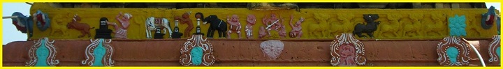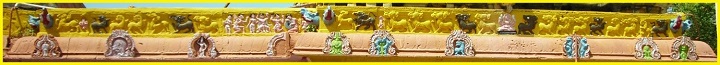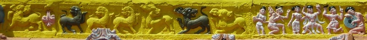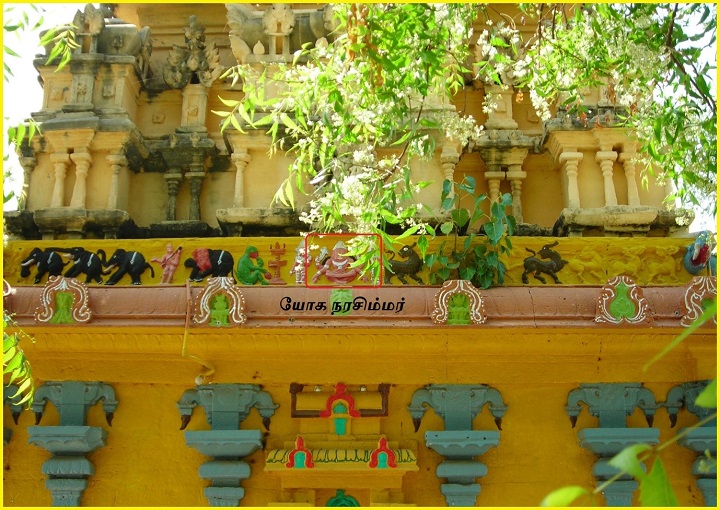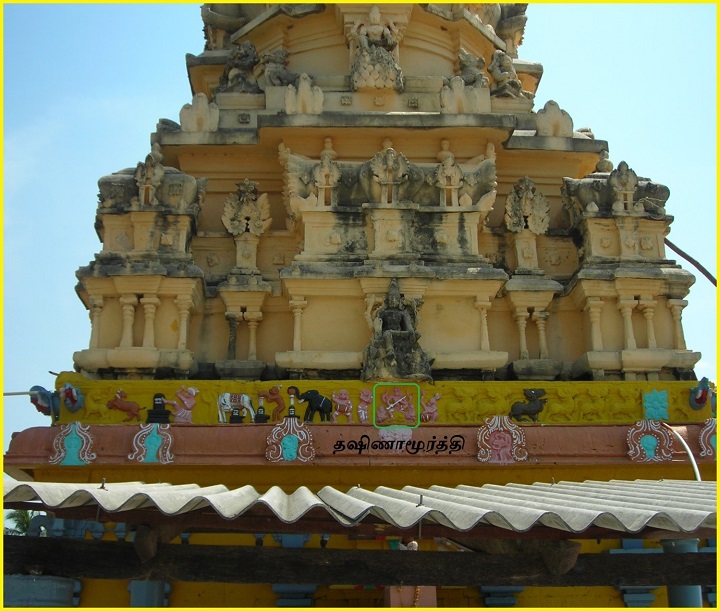 ![]() (கழுகுப் பார்வை-முழு கிராமமும்) உபானம், ஜகதி, எண்பட்டைக் குமுதம், பாதங்களுடன் கூடிய கண்டம், பட்டிகை, பாதங்களுடன் கூடிய வேதிகைகள் பெற்ற பாதபந்தத் தாங்குதளம் கொண்ட இருதள நாகர-வேசரக் கலப்பு விமானம். பத்திப்பிரிப்பு மிகவும் நேர்த்தியாகக் காட்டப்பட்டுள்ளது. தூண்களின் அமைப்பிலேயே பத்திப்பிரிப்பு எளிமையாகக் கர்ணம்-சாலை-கர்ணம் என்ற முறையில் காட்டப்பட்டுள்ளது. சாலைகள் கோட்டங்கள் பெற்றுள்ளன. தெற்கு மட்டும் தஷிணாமூர்த்தி சிற்பம் பெற்றுள்ளது. முதல் தள முடிவில் கபோதத்திற்கு மேல் எழும் பூமிதேசம் மிகவும் தனித்துவமான முறையில் காட்டப்பட்டிருப்பதே இக்கட்டுரை எழுத என்னைத் தூண்டியது. இவ்வாலயக் கருவறைக் கோட்டங்கள் இயல்பாக அங்கங்கு இருக்கவேண்டிய கோட்டத் தெய்வங்கள் பெறாமல் தெற்கில் மட்டும் தஷிணாமூர்த்தி பெற்றிருப்பது சற்றுக் கவனிக்கத்தக்கது. பின்னாளில் குருவார வழிபாட்டிற்காகச் சேர்க்கப்பட்ட சன்னதியாகத் தஷிணாமூர்த்தி சன்னதியைக் கருத இடமுண்டு. பொதுவாகச் சிவாலயக் கருவறைக் கோட்டங்களில் தெற்கே தஷிணாமூர்த்தியும், மேற்கே பெருமாள் ரூபங்களில் ஒன்றும் வடக்கே பிரம்மாவும் அமைவது வழக்கம். (சில கோயில்களில் இம்மரபு மாற்றப்பட்டிருப்பதையும் காண்கிறோம்). ஆனால் மேற்கூறிய இம்மரபு இவ்வாலயத்தில் தனித்தன்மையுடன் பூமிதேசத்தின் மையப்பகுதியில் இதே அமைப்பில் வடக்கில் பிரம்மாவும் மேற்கில் யோகநரசிம்மரும் தெற்கில் வீணாதர தஷிணாமூர்த்தியும் குறுஞ்சிற்பங்களாக எழிலுடன் காட்டப்பட்டுள்ளனர். ![]() ![]() வடக்கு-பிரம்மா ![]() மேற்கு-யோக நரசிம்மர் ![]() தெற்கு-வீணாதர தஷிணாமூர்த்தி (நான் வேறெங்கும் பார்த்ததில்லை. இக்கட்டுரையை வாசிப்போர் அவரவர் பகுதிகளில் எங்கேனும் இதுபோல் பார்க்க நேரிட்டால் எனக்குத் தெரியப்படுத்தவும் (9443324665). காண ஆவலாக உள்ளேன்) மேலும், இதே பூமிதேச யாளிவரிகளில் சில இடங்களில் சிவபுராணக் காட்சிகள் குறிப்பாகக் கண்ணப்ப நாயனார் சரித்திரம், கோ (பசு)லிங்க வழிபாடு, வாலி(வானர) லிங்க வழிபாடு, கஜேந்திர லிங்க வழிபாடு, நாரதர் மற்றும் இசையுடன் கூடிய நாட்டிய நிகழ்ச்சிகள் போன்ற காட்சிகள் எழிலுடன் குறுஞ்சிற்பங்களாக வடிக்கப்பட்டுள்ளன. இது இந்தக் கோயிலின் தனித்தன்மையாக இக்கட்டுரையாசிரியர் உணர்கிறார். மேலும் ஆரச்சுவர்கள் அனைத்தும் ஆறங்கம் பெற்றுச் சுதையாக இருப்பினும் அழகாக அமைந்துள்ளன. ![]() (முக மண்டப பூமி தேசப் பகுதி-இசையுடன் கூடிய நாட்டியம்) ![]() (வடக்கு-கருவறை மற்றும் முகமண்டப பூமி தேசம்) ![]() (கருவறை-தெற்கு கண்ணப்ப நாயனார் சரித்திரம், கோ (பசு)லிங்க வழிபாடு, வாலி(வானர) லிங்க வழிபாடு, கஜேந்திர லிங்க வழிபாடு) |