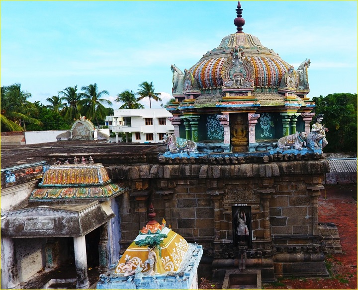 The valabhi is adorned with bhuta series. The roof of the tala extend as flexed over hanging kapota which are rimmed at the edges. The kapota with kudus above the plasters, corner pattas are shown and chandra mandalas in the rims. The tala ends with bhumi desa. As like the prati series, the yazhi frieze in the bhumidesa and in the corner the makaras, soldiers are shown emerging out of it. In the bhadra divisions, koshthas are seen in the middle on the west, north and south housing the deities Lingodbhavar, Bramma and Dhaksinamurthy respectively. The koshthas are flanked by rudrakantha split pilasters that carry the same features of the pilasters of the bhitti exept the Padma kattu in the middle. The niches are crowned with makara thorana. The makara thoranas on the north, west and the south are well formed with varied ornamentations.