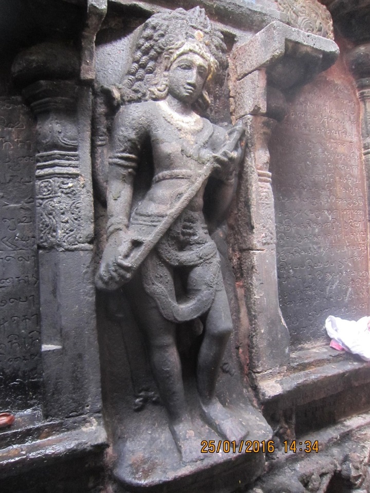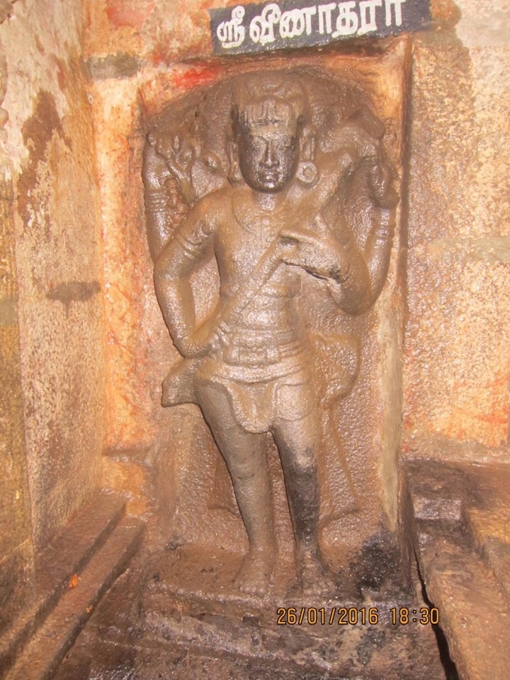 இச் சிற்பங்களில் நாயகமாக விளங்குவது வீணாதரர் சிற்பம் ஆகும். இக் கோயில் விமானத்தின் தெற்கு பக்கத்தில் முதல் தளத்தின் ஆர உறுப்பாக விளங்கும் சாலை நாசிகை கோட்டத்தில் தெற்கு நோக்கி இருக்கின்றது ஒரு பத்ர பீடத்தின் மீது விரிக்கப்பட்டுள்ள ஒரு விரிப்பின் மீது உட்கார்ந்து, இடது காலை முழங்கால் அளவில் மடக்கி உத்குடி ஆசனம் பெற்று, வலது காலை தொங்கவிட்டும், சற்றே உடலினை இடது புறம் திருப்பி சற்று கீழ் நோக்கிய பார்வை பெற்றும், இவ் வீணாதரர் தொங்கவிடப்பட்ட வலது காலை ஒரு பாதம் தாக்கியில் இருத்தியும் உள்ளார். இப் பத்ர பீடத்தில் குத்திட்டிருக்கும் இடது காலின் கீழே படமெடுத்த பாம்பு ஒன்று நம்மை மிரட்டும் வகையில் வடிவமைக்கப்பட்டுள்ளது. இரு கால்களிலும் தாழ்செறிகளும், இடையில் தோலாடையும் அனிந்துள்ள வீணாதரரின் அரைக்கச்சின் முன்பக்கப்பகுதி பத்ர பீடத்தில் இரு கால்களுக்குமிடையில் தளர்வாக இருப்பதுபோல் படர்ந்து காண்பிக்கப்பட்டுள்ளது. வயிற்றில் உதரபந்தமும், மார்பின் குறுக்கே .முப்புரி நூலும் அணிந்துள்ள வீணாதரர், இடது மணிக்கட்டில் கங்கணமும், விரல்களில் மோதிரமும் பெற்றுள்ளார். பின் கைகளில் தோள்வளையும் கழுத்தில் சவடியும் அணிந்துள்ள வீணாதரரின் தலையலங்காரம் சடாபாரமாக உள்ளது. பதக்கங்கள் பதித்க்கப்பெற்ற நெற்றிப் பட்டத்தை அணிந்துள்ள வீணாதாரரின் வலச்செவி நீள் செவியாகவும், இடச்செவியில் பனையோலை பெற்றும் காணப்படுகின்றன சிவபெருமானின் முன் இரு கரங்கள் ஒரு வீணையை தாங்கி பிடித்துள்ளது . வீணையின் அடிப்பகுதி வலது தொடையில் இருத்தியும் மேல்பகுதியினை இடது உள்ளங்கையில் தாங்கிப்பிடித்து, வீணையின் மேற்புற அடிப்பகுதியில் உள்ள குடம் போன்ற பகுதியை மார்போடு அணைத்தும், வீணையின் மேற்புறத்தே காணப்படும் நரம்புகளை வலது முன் கையிலுள்ள நடு விரலும் மோதிர விரலும் சுண்டியிட, சுட்டு விரலும் சுண்டு விரலும் நரம்புகளை மீட்டாமல் சற்றே மேல் எழும்பி நிற்க, சுண்டிவிடப்பட்ட நரம்புகளின் வழியே புறப்பட்ட இசையின் இன்ப வெள்ளத்தில் மனம் மூழ்கி கிடக்க அதனால் மெய் மறந்து, கண் இமைகள் கண்களை மூட முயற்சிக்க, கண்கள் பாதி மூடியும் ஒரு கிறக்க நிலையில் மோன நிலையில் மயங்கியிருக்க , உதடுகள் இருண்டும் சற்றே பிரிந்து சிறு புன்னகையை வெளிப்படுத்த ,உதடுகள் பிரிந்ததால் பக்கவாட்டில் சற்றே வெளிப்படும் கோரைப்பற்களின் வழியே சிந்தும் சிறு புன்னகையை செதுக்கிய சோழ உளிகளை என்னவென்று பாராட்டுவது.
