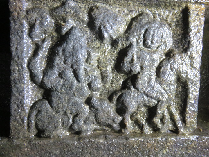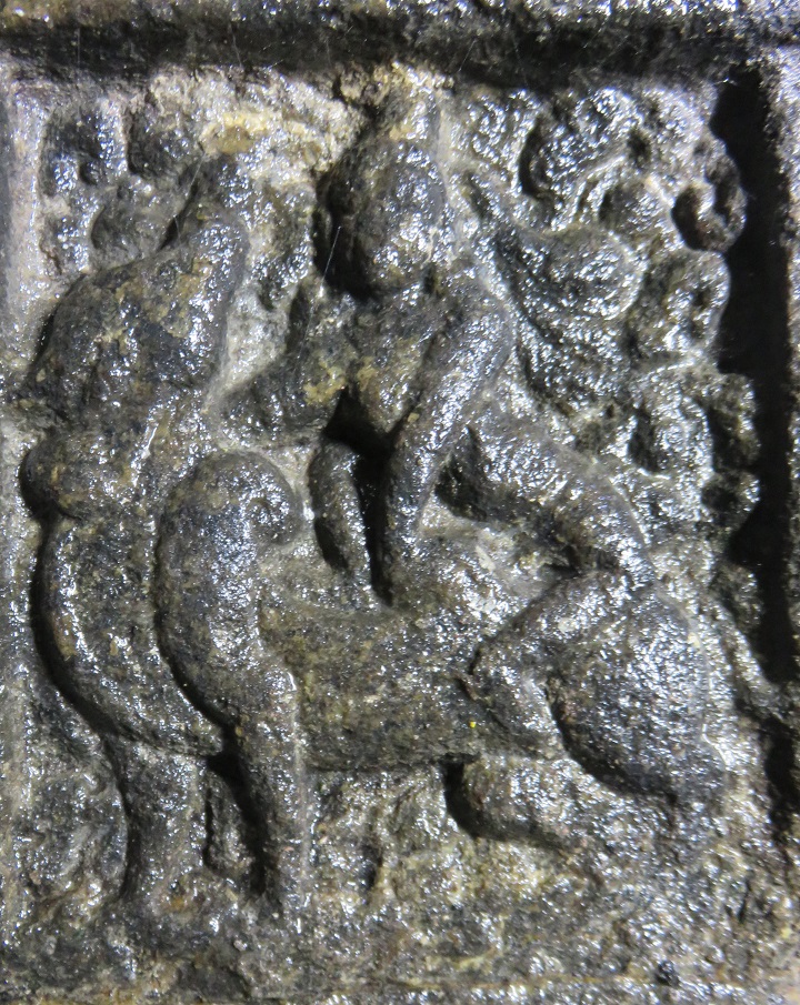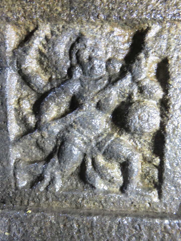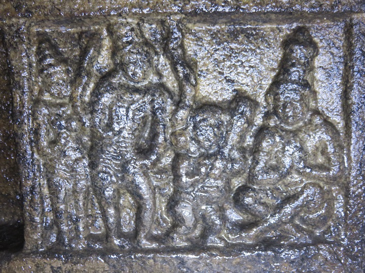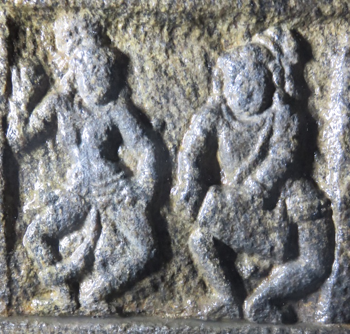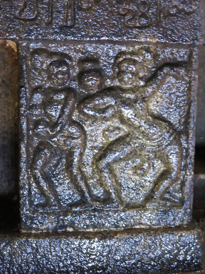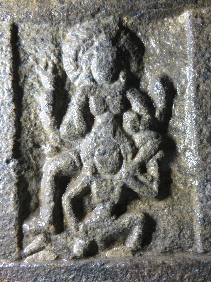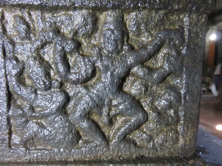 பாதச்சிற்பங்கள் தாங்குதளத்தின் கண்டபாதங்களும் தாங்குதளத்திற்கு மேலுள்ள வேதிபாதங்களும் 15 செ. மீ. என ஒரே அளவான உயரம் கொண்டிருந்தபோதும் தூண்களைப் பொறுத்து அவை அகலத்தில் மாறுபடுகின்றன. திருப்பத்தூண் பாதங்கள் 19 செ. மீ. அகலமும் சுவர் அரைத்தூண் பாதங்கள் 21 செ. மீ. அகலமும் கொள்ள, கோட்ட அணைவுத்தூண்கள், பஞ்சரத்தூண்கள் ஆகியவற்றின் பாதங்கள் 13 செ. மீ. அகலம் மட்டுமே பெற்றுச் சிறுத்துள்ளன. கண்டபாதச் சிற்பங்கள் கருவறை, முகமண்டபக் கண்டபாதங்கள் 58இல் நான்கில் தெளிவான சிற்பங்களும் இரண்டில் தேய்ந்த நிலையிலான சிற்பங்களும் அமைய, எஞ்சிய பாதங்கள் செதுக்கல் ஏதுமின்றி வெறுமையாக உள்ளன. கருவறையின் தென்மேற்கு உருளைத்தூணின் தெற்கு, மேற்குப் பாதங்களில் முறையே கிராதார்ச்சுனரும் அருச்சுன அனுக்கிரகரும் அமைய, மேற்கில் லிங்கோத்பவர். தெற்குப்பாதம் ஒன்றில் காமனை எரித்த சிவபெருமானை யோகபட்டத்துடன் காணமுடிகிறது. தேய்ந்துள்ள இரு சிற்பங்களில் ஒன்று ஆடற்காட்சியாகவும் மற்றொன்று அசுரர் ஒருவரைப் படம்பிடிப்பதாகவும் உள்ளன. சன்னவீரம், சிற்றாடை, தோள்வளை அணிந்துள்ள அருச்சுனர் வில் வளைத்து அம்பெய்யும் கோலத்தில் காட்சிதர, வலப்புறத்தே சிவபெருமானும் உமையும் வேடுவர்களாய் நிற்கின்றனர். சன்னவீரமணிந்த பெருமானின் வலக்கை வில்லும் இடக்கை அம்பும் கொள்ள, இடுப்பில் சிறு கத்தி. உமையின் செவிகளில் பனையோலைக் குண்டலங்கள். வேடர், அருச்சுனர் பின்னிருக்குமாறு நாயும் காட்டுப்பன்றியும் காட்டப்பட்டுள்ளன. அருச்சுன அனுக்கிரகரில் கிரீடமகுடம், பனையோலைக் குண்டலங்கள், கழுத்தணி அணிந்து கால்களைக் குறுக்கீடு செய்து கூப்பிய கைகளுடன் சிவபெருமான், உமை முன் அருச்சுனர் அமர்ந்திருக்க, அவர் முன், நிற்கும் பூதம் கைகளில் பாசுபதம் ஏந்தியுள்ளது. பின்கைகளில் மழுவும் மானும் கொண்டுள்ள சிவபெருமான் சடைமகுடராய்ப் பனையோலைக் குண்டலங்கள், சரப்பளி, சிற்றாடை அணிந்து வல முன் கையைக் காக்கும் குறிப்பிலும் இட முன் கையைக் கடியவலம்பிதத்திலும் காட்டி அருச்சுனப் பார்வையில் நிற்க, பின்னுள்ள தேவியும் கரண்டமகுடம், பட்டாடையுடன் வலக்கையில் காக்கும் குறிப்பு காட்டி, அதே பார்வையிலுள்ளார். இடக்கை இறைவன் பின் மறைந்துள்ளது. மேற்குப்பாத லிங்கோத்பவரின் வலப்புறம் பின்கைகளில் அக்கமாலை, குண்டிகை ஏந்தி நிற்கும் நான்முகனின் வல முன் கை சிவபெருமானைப் போற்ற இட முன் கை கடியவலம்பிதமாக உள்ளது. இடப்புறம் பின்கைகளில் சங்கு, சக்கரம் கொண்டு நிற்கும் விஷ்ணுவின் இட முன் கை இடுப்பிலிருக்க, வல முன் கை இறைவனைப் போற்றுகிறது. இலிங்கத்தின் கோளத்திறப்பில் வெளிப்படுபவர் போலக் காட்டப்பட்டுள்ள சிவபெருமா