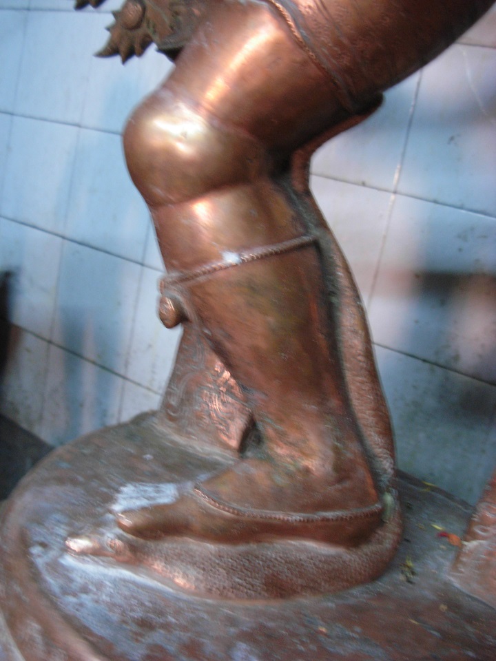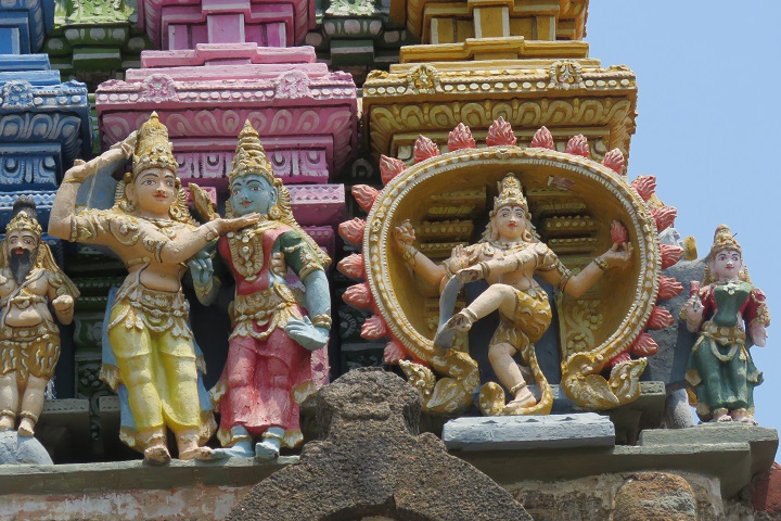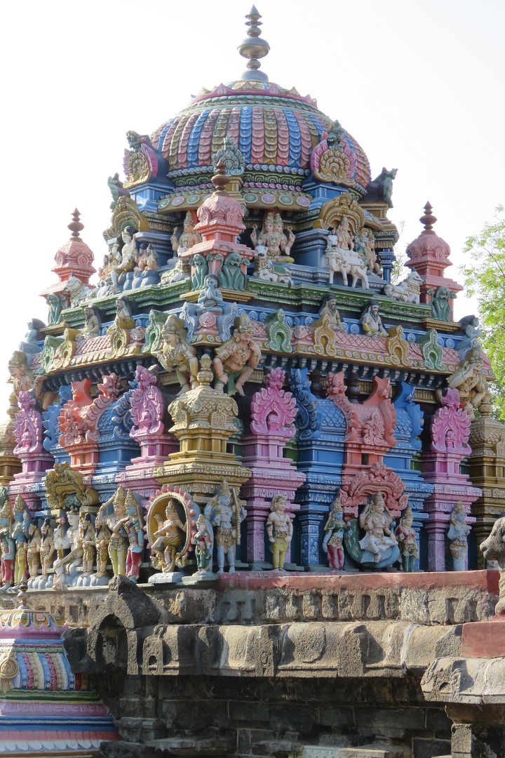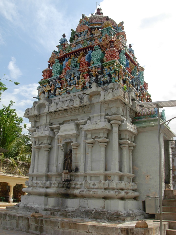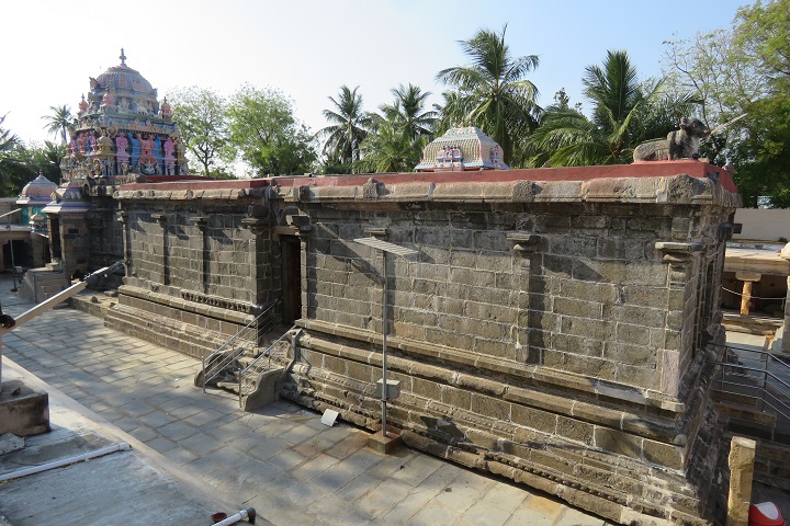 இறைவன் விமானம் கருங்கல் தளத்தின் மேல் துணை உபானம், உபானம், மேல்நோக்குத் தாமரைவரி, கம்பு, ஜகதி, மேல்நோக்குத் தாமரைவரி, உருள்குமுதம், பிரதிவரி என அமைந்துள்ள பிரதிபந்தத் தாங்குதளத்தின்மீது வேதிகைத்தொகுதி பெற்றெழும் இறைவனின் இருதள வேசர விமானத்தின் கீழ்த்தளச் சுவரைச் செவ்வகப் பாதமும் பாதவிளிம்பில் பாம்புப்படமும் பெற்ற எண்முக அரைத்தூண்கள் அணைத்துள்ளன. கட்டு, மாலை, தாமரைக்கட்டற்ற இத்தூண்கள் பிற மேலுறுப்புகளும் தாமரை, பலகை, வீரகண்டமும் பெற்றுள்ளன. தரங்கவெட்டுப் போதிகைகள் விரிகோணக் கைகளால் உத்திரம் தாங்க, மேலே வாஜனம், பூதவலபி. சுண்ணப்பூச்சுக்களால் அழகிழந்துள்ள பூதவலபியை அடுத்து நடு, கோணப்பட்டங்களுடன் விளிம்பும் மேலோட்டமான கூடுவளைவுகளும் பெற்ற கபோதம். மேலே பூமிதேசம். ![]() தளப் பஞ்சரங்கள் விமானத்தின் கீழ்த்தளக் கர்ண, சாலைப்பத்திகளுக்கு இடைப்பட்ட தாய்ச்சுவரில் சற்றே வெளித்தள்ளிய நிலையில் பஞ்சரங்கள் இணைக்கப்பட்டுள்ளன. துணை உபானத்திலிருந்து வேதிகைவரை விமானம் போலவே வளரும் இப்பஞ்சரங்களின் சுவர்ப்பகுதியை பாம்புப்படத்துடனான செவ்வகப்பாதம் பெற்ற உயரக் குறைவான இந்திரகாந்த அரைத்தூண்கள் தழுவியுள்ளன. பாலி, பலகை, வீரகண்டம், போதிகைகள் கொண்டு கூரையுறுப்புகள் தாங்கும் இவற்றின் வலபியில் அன்னவரி. கபோதம் நேர்ப்பார்வையில் இரு கூடுவளைவுகளும் பக்கங்களில் பக்கத்திற்கொரு கூடுவளைவும் கொண்டுள்ளது. கபோதத்திற்கு மேல் வேதிகையும் உயரமான கிரீவமும் சிம்மத்தலை பெற்ற வளைமுக சிகரமும் சிகரநாசிகையில் நாகர விமானமும் காட்டப்பட்டுள்ளன. இவ்வளைமுக சிகரம் இறைவிமானத்தின் கபோத வளைவு போல பொருந்த இணைக்கப்பட்டுள்ளது. கோட்டங்களும் சிற்பங்களும் விமானச் சுவர்களில் முப்புறத்தும் உள்ள கோட்டங்கள் சட்டத்தலை பெற்ற உருளை அரைத்தூண்களால் தழுவப்பட்டுள்ளன. மேலே அம்மன் கோயில் போலவே கூரையுறுப்புகளும் நாகரசிகரமும் தூபியும் காட்டப்பட்டுள்ளன. கோட்டங்களில் தென்புறம் ஆலமர்அண்ணலும் மேற்கில் அம்மையப்பரும் வடக்கில் நான்முகனும் உள்ளனர். ஆலமர்அண்ணல் கோட்டத்தின் முன் ஒருதள நாகர செங்கல் கட்டுமானமாய்ப் பின்னாளைய விமானம். ஆலமர்அண்ணல் குப்புறக் கவிழ்ந்திருக்கும் முயலகன் முதுகின் மீது வலக்காலை இருத்தி, வீராசனத்திலுள்ள ஆலமர்அண்ணலின் பின்கைகளில் அக்கமாலை, தீச்சுடர். சடைப்பாரம், சரப்பளி, நீள்முத்துமாலை, தோள், கை வளைகள், முப்புரிநூல், உதரபந்தம், வீரக்கழல், தாள்செறி கொண்டுள்ள அவரது வல முன் கை காப்பு முத்திரையில் அமைய, அருள்முத்திரை காட்டும் இட முன் கையில் சுவடி. சடைப்பாரத்தின் இருபுறத்தும் சடைச்சுருள்கள். இடைச்சிற்றாடையுடன் உள்ள இறைவ