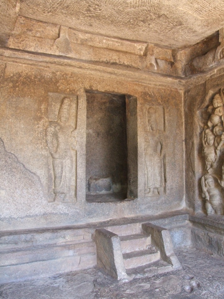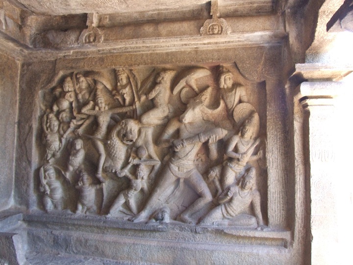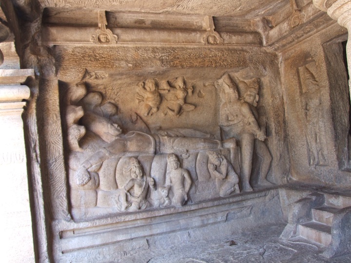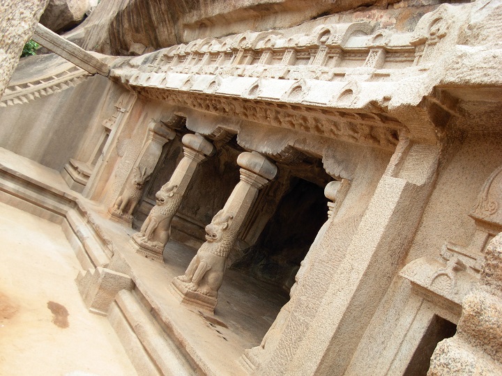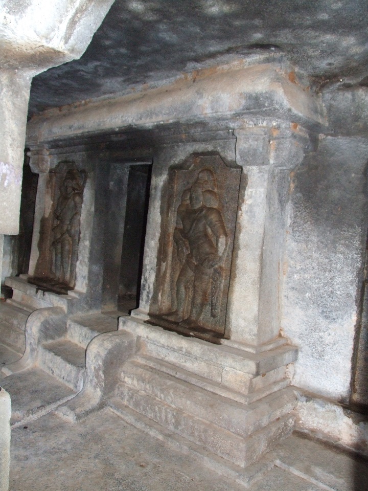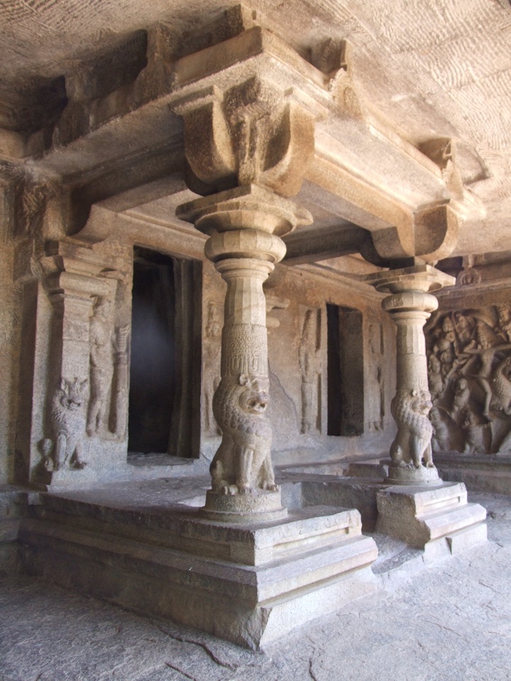 மண்டபம் மண்டபம் உருவாகியுள்ள மாமல்லபுரம், கழுக்குன்றம் குடைவரைகள் பதின்மூன்றனுள், பஞ்சபாண்டவர், தருமராஜர், கோனேரிப் பெரிய மண்டபம், கழுக்குன்றம், பெருவராகர் ஆகிய ஐந்தும் இரண்டாம் வரிசைத் தூண்களின் இருப்பால் மண்டபப் பகுதியை முகமண்டபம், அர்த்தமண்டபம் என இரண்டு பிரிவுகளாகக் கொண்டுள்ளன. புலிப்புதர், கோனேரிச் சிறிய மண்டபம், கொற்றவை, வராகர், அதிரணம், ராமானுஜர், மகிடாசுரமர்த்தினி, கலங்கரை விளக்கக் குடைவரை ஆகிய எட்டும் அத்தகு பிரிவினை இல்லாத நிலையில் ஒரே மண்டபத் துடன் உள்ளன. இருமண்டப அமைப்பு முகப்பொத்த தூண்கள், போதிகைகள், கூரையுறுப்புகள் பெற்ற அர்த்தமண்டபத்தை தருமராஜர், கழுக்குன்றம் ஆகிய இரண்டில் மட்டுமே காணமுடிகிறது. பெருவராகர், பஞ்ச பாண்டவரின் இரண்டாம் வரிசைத் தூண்கள் விலங்கடியற்ற எண்முகமாகப் பாலி, பலகை பெறாதனவாய் உள்ளன. பெருவராகர் தூண்களில் அனைத்து உறுப்புகளும் நன்கமைய, பஞ்ச பாண்டவரில் அவை ஒதுக்கீடுகளாக உள்ளன. பெருவராகர் கூடுதலாக இடைக்கட்டும் பெற்றுள்ளதுடன், அதன் போதிகைகள் வளைமுகத் தரங்கமாக உள்ளன. பஞ்சபாண்டவரின் போதிகைகள் தரங்கம் கொள்ளவில்லை. கூரையுறுப்புகளில் உத்திரம் மட்டுமே உருவாகியுள்ளது. ஆனால், பெருவராகர் முழுமையான கூரையுறுப்புகளை நிறைவாகப் பெற்றுள்ளது. அங்கு, வலபியின் கிழக்கு முகம் கொடிக்கருக்கும் மேற்கு முகம் அன்னவரியும் பெற்றுள்ளன. கோனேரிப் பெரிய மண்டபத்தின் அர்த்தமண்டபத் தூண்கள் முகப்புத் தூண்களின் சதுரம், கட்டு, சதுரம் என்ற அமைப்பில் இருந்து முற்றிலும் மாறுபட்டு உருளைப்பாதம், இடைக்கட்டு பெற்ற இந்திரகாந்தமாக உள்ளன. பாலி, பலகை தவிர, பிற உறுப்புகள் பெற்றுள்ள இத்தூண்களின் மேலுள்ள போதிகைகளின் கைகள் முகப்பினின்றும் மாறுபட்ட நிலையில் வளைமுகத் தரங்கமாய் உள்ளமையுடன், கூடுதலாகப் பட்டை பெற்றுள்ளன. முகப்பு வலபி அன்னவரி கொண்டுள்ள நிலையில் அர்த்தமண்டப வலபி வெறுமையாக உள்ளது. முகமண்டபம் இருமண்டபக் குடைவரைகளில் மிக நீளமானதும் உயரமானதுமான முகமண்டபம் பஞ்சபாண்டவரில் அமைய, மிக அகலமானது தருமராஜரில் உள்ளது. பஞ்சபாண்டவரிலும் கோனேரிப் பெரிய மண்டபத்திலும் முகமண்டபம் வெறுமையாகவும் முழுமையுறாமலும் அமைய, தருமராஜரில் முகமண்டபச் சுவரொன்று பல்லவ கிரந்தத்தில் வெட்டப்பெற்ற சம°கிருதச் செய்யுள் கல்வெட்டைக் கொண்டுள்ளது. கழுக்குன்றத்திலும் பெருவராகரிலும் இரண்டு முகமண்டபச் சுவர்களுமே நெடிதுயர்ந்த சிற்பங்கள் பெற்றுள்ளன. முகமண்டபச் சுவர்களில் சிற்பம் அமைக்கும் இப்பாங்கினை மகேந்திர மரபின் (இலளிதாங்குரம் - கங்காதரர்) தொடர்ச்சியாகக் கொள்ளலாம். கழுக்குன்றத்தில் முகமண்டபச் சிற்பங்கள் 