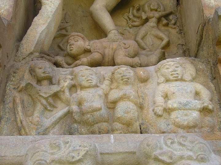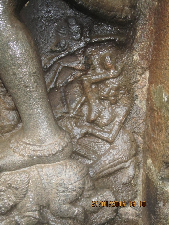 இக் காட்சியே பின் வந்த சோழர் சிற்பிகள், நடராஜர் நடனத்தில் கீழ் இசை வாசிக்கும் இனியவராய் ,பாடும் பாவலராய் படைத்திட்டனர். திருப்புகலூரில் கோட்டச் சிற்பமாக காணப்படும் நடராஜர் திருவடி கீழ் சிரட்டை கின்னரி என்ற இசைக் கருவி இசைப்பவராக இவரைக் காணலாம். கூகூர், , கங்கைகொண்ட சோழபுரம், செம்பியன் மாதேவி, தப்பளாம் புலியூர் போன்ற இடங்களில் பாடுபவராய், எலும்புருவில் பேயாய் காணலாம்.