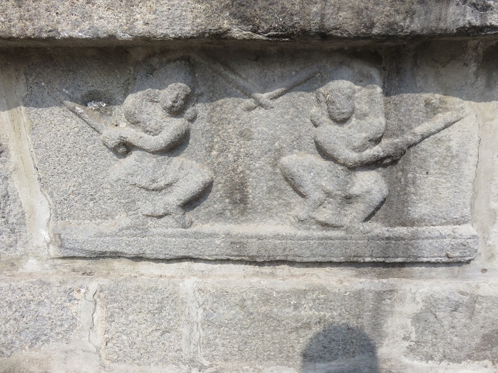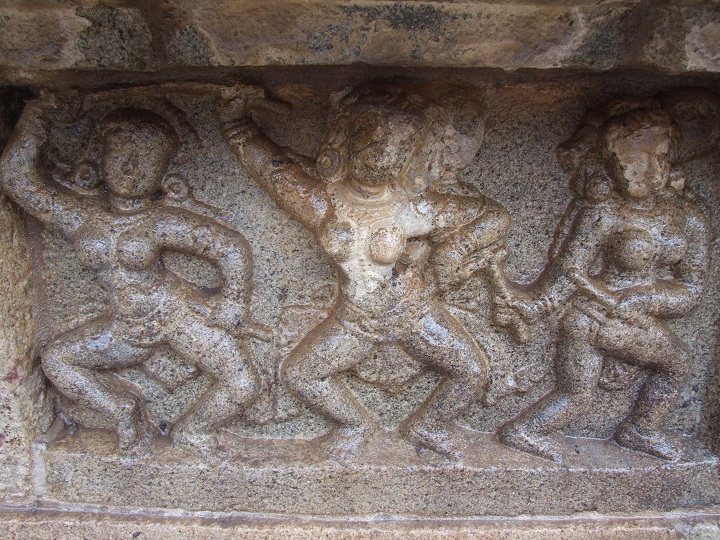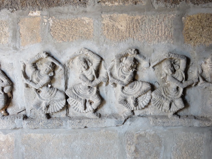 துணைத்தளக் கண்டசிற்பமாக அமைந்துள்ள இக்கோலாட்டக் காட்சியில் மூன்று பெண்கள் இரண்டு கைகளிலும் கோல் கொண்டு ஆடுவதைக் காணமுடிகிறது. பெருங்கொண்டை, பனையோலைக் குண்டலங்கள், தோள், கை வளைகள், சுவர்ணவைகாக்ஷம், இடைவிரிப்புடனான சிற்றாடை, இடைக்கட்டு என ஒப்பனை நிறைத்து, கொண்டையை மீறிய சடைக்கற்றைகள் தோள்களில் நெகிழ ஆடும் இம்மூவரில் முதலிருவர் நேர்ப்பார்வையில் ஆட, மூன்றாமவர் ஒருக்கணிப்பிலும் சுழற்சியிலுமாய்க் கோலடிக்கிறார்.