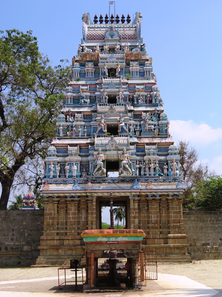 முதற்கோபுரம் துணைத்தளம், பாதபந்தத் தாங்குதளம், வேதிகைத்தொகுதி கொண்டெழும் கோபுரக் கீழ்த்தளம் சுவரளவில் ஐந்து பத்திகளாக் கப்பட்டுள்ளது. சதுரபாதத்தின் மீதெழும் எண்முக அரைத்தூண்கள் தாமரை உள்ளிட்ட மேலுறுப்புகளுடன் அணைக்கும் இப்பத்திகளில் சாலைப்பத்தி முன்தள்ளியமைந்து வாயிலாகியுள்ளது. கர்ண, பஞ்சரப்பத்திகளுக்கு இடைப்பட்ட தாய்ச்சுவரில் உருளை அரைத்தூண்கள் தழுவும் ஆழக்குறைவான வெறுமையான கோட்டங்கள் தலைப்பில் கூரையுறுப்புகளுடன். பஞ்சர, சாலைப்பத்திகளுக்கு இடைப்பட்ட தாய்ச்சுவர் வேதிகைத்தொகுதி பெறாது ஆழமான வெறுமையான கோட்டங்களுடன் திகழ்கிறது. பத்தி அணைவுத்தூண்களின் மேலுள்ள தரங்க வெட்டுப் போதிகைகள் கூரையுறுப்புகள் தாங்க, மேலே கூடுவளைவுகளுடன் கபோதம், பூமிதேசம், வேதிகை. கீழ்த்தளஆரம் ஆறங்கமாக, மூலைகளில் கர்ணகூடங்கள், நடுவில் சாலை, அவற்றிற்கு இடைப்பட்டுப் பஞ்சரங்கள், அனைத்தையும் இணைக்கும் ஆரச்சுவர் கொள்ள, சாலை தவிர்த்த பிற ஆரஉறுப்புகளில் சுதையுருவங்கள். திறப்பாக உள்ள சாலைச்சுவரில் இருபுறத்தும் காவலர்கள். இரண்டாம், மூன்றாம், நான்காம் தளங்கள் அளவில் சிறுத்துத் திருப்பங்களில் நான்முக அரைத்தூண்கள் கொள்ள, தளங்களின் மேல், கீழுள்ளாற் போன்றே ஆரம். ஐந்தாம் தளம் சுருங்கியமைய, கிரீவத்தில் கோட்டத் திறப்பின் இருபுறத்தும் சங்க, பத்மநிதிகள், பிள்ளையார், முருகன். கிரீவ வேதிகையில் பூதங்களும் நந்திகளும். மேலே சிகரம், தூபி. கோபுரத்தின் வடக்கு, தெற்கு முகங்களில் பஞ்சரப்பத்தி விடுபட்டுள்ளது. இத்திசைகளில் கர்ண, சாலைப்பத்திகளுக்கு இடைப்பட்ட தாய்ச்சுவரில் காட்டப்பட்டுள்ள வெறுமையான கோட்டங்கள், தலைப்பாகக் கூரையுறுப்புகளுடன் இரு கூடுவளைவுகள் பெற்ற கபோதமும் கொண்டுள்ளன. வடமுகச் சாலைகளில் நான்முகன் அமைய, தெற்கில் ஆலமர்அண்ணல். கோபுரத்தையொட்டிய வடக்கு மதிலின் மேற்குமுகத்தில் 1999 குடமுழுக்குத் திருப்பணியின்போது இவ்வளாகத்தில் கிடைத்த உத்திரமொத்த கட்டட உறுப்பு இணைக்கப்பட்டுள்ளது.4 அதில் யானைத்திரு மகள், அர்த்தபத்மாசனத் தீர்த்தங்கரர், இயக்கி ஆகியோர் வடிவங்கள் செதுக்கப்பட்டுள்ளன. இது இப்பகுதியில் சோழர் காலத்தே வளமுற விளங்கியதாகக் கல்வெட்டுகள் குறிக்கும் ஸ்ரீபுறக்குடிப்பள்ளியின் கட்டுமான உறுப்பாகலாம்.5 முதற்கோபுரத்திற்கும் இரண்டாம் கோபுரத்திற்கும் இடையிலுள்ள பகுதியில் பலித்தளம், கொடித்தளம், நந்திப்பந்தல் அமைய, வடபுறம் ஒப்பிலாநாயகித் திருமுன்னும் அதனருகே புதிதாகக் கட்டமைக்கப்பட்ட திருமணமண்டபமும் உள்ளன. தெற்கில் கோயில் தோட்டம். ஒப்பிலாநாயகி அம்மன் திருமுன் ஒருதளத் திராவிட விமானம், முகமண்டபம், பெ