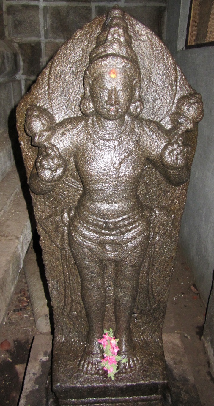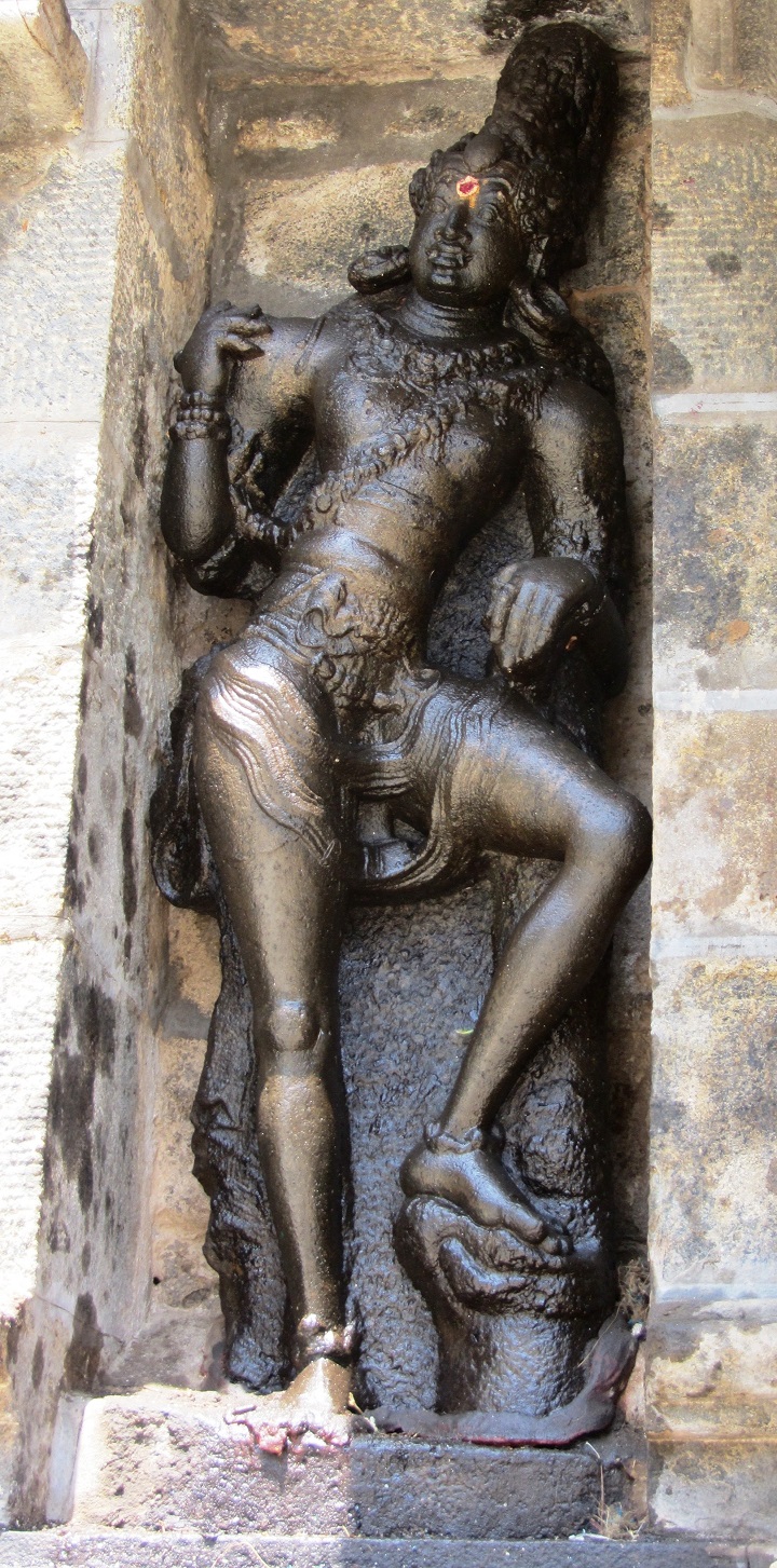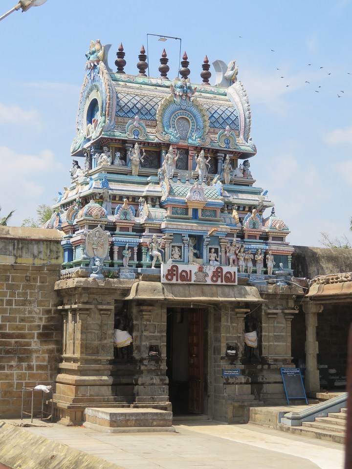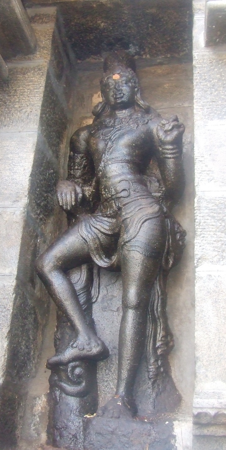இரண்டாம் கோபுரம் இருதள இரண்டாம் கோபுரம் சாலைப்பத்தி முன்தள்ளலுடன் துணைத்தளம், பாதபந்தத் தாங்குதளம், வேதிகைத்தொகுதி, நான்முக அரைத்தூண்கள் தழுவும் சுவர் கொண்டு எழுகிறது. சுவரின் கிழக்குமுகத்தில் கோபுரவாயிலின் இருபுறத்துமுள்ள ஆழமான செவ்வகக் கோட்டங்களில் வாயிலுக்காய் ஒருக்கணித்த முற்சோழர் காலக் காவலர்கள். சடைமகுடம், சரப்பளி, நிவீதமாய் அணிந்த அலங்கார முப்புரிநூல், உதரபந்தம், சிம்மமுக அரைக்கச்சு இருத்தும் இடைக்கட்டுடனான சிற்றாடை, கீர்த்திமுகத் தோள்வளைகள், கைவளைகள், சலங்கைகள் பெற்றுக் கோரைப் பற்களுடனுள்ள அவர்தம் பனையோலைக் குண்டலங்கள் பறவைக் குண்டலங்களாய் அழகுபடுத்தப்பட்டுள்ளன. தெற்கர் இடக்கையையும் வடக்கர் வலக்கையையும் அருகிலுள்ள பாம்பு தவழும் மரக்கிளை மேல் தாங்கலாக்கியுள்ளனர். தெற்கரின் இடக்கை வியப்பில். புன்னகைக்கும் வடக்கரின் இடக்கை அச்சுறுத்துகிறது. இருவருக்குமே அடர்த்தியான சடைக்கற்றைகள் தோள்களில் நெகிழ்ந்து படர்கின்றன. வடக்கரின் சரப்பளி அழகிய தொங்கல்களுடன் வளையமிட, தெற்கரின் கைகளில் முத்துவளைகள். தூண்களின் மேலுள்ள தரங்க வெட்டுப் போதிகைகள் தாங்கும் கூரையுறுப்புகளில் வலபி தாமரையிதழ் கொள்ள, மேலே கூடுவளைவுகளுடன் கபோதம், பூமிதேசம், வேதிகை. மூலைகளில் கர்ணகூடங்களும் நடுவில் முன்தள்ளிய சாலையும் இடையில் பஞ்சரங்களும் பெற்றுள்ள ஆறங்கஆரம் சுதையுருவங்களுடன் பொலிகிறது. சாலையின் சுவர்க்கோட்டத்தில் லிங்கத் திருமேனியும் அதை வழிபடுபவரும் அமைய, இருபுறச் சுவர்களில் பிள்ளையார், முருகன், அடுத்துப் பக்கத்திற்கொருவராகக் காவலர். இரண்டாம் தளம் உயரக்குறுக்கமாகத் திருப்பங்களில் நான்முக அரைத்தூண்கள் தழுவும் சுவருடன் கூரையுறுப்புகளில் வலபி மதலை கொள்ள, கபோதத்துடன் முடிகிறது. மேலே வேதி கையில் நான்கு மூலைகளிலும் நந்திகளுக்கு இடைப்பட்டு சங்கூதும் பூதங்கள். நான்முக அரைத்தூண்கள் தழுவும் கிரீவசுவரின் பெருநாசிகளில் வடக்கில் நான்முகன், தெற்கில் ஆலமர்அண்ணல், கிழக்கு, மேற்கு நாசிகைகள் சாளரமாய் அமைந்து இருபுறத்தும் காவலர்கள் பெற்றுள்ளன. கிழக்கில் காவலர்களை அடுத்துத் தெற்கில் பிள்ளையார், வடக்கில் முருகன். மேற்கில் விஷ்ணுவும் கண்ணனும். கோபுரத்தின் வடக்கு உட்சுவரில் காகத்திற்கு உணவிடுவது தொடர்பான கல்வெட்டும் விஜயநகர அரசர் தேவராயரின் நிறைவடையாக் கல்வெட்டும் இடம்பெற்றுள்ளன. 10 உள்சுற்று மண்டபம் கதிரவனும் சந்திரனும் இரண்டாம் கோபுரவாயில் வழி நுழைவாரைச் செவ்வக மண்டபமென விரியும் உள்சுற்றின் முதற்பகுதி வரவேற்கிறது. வாயிலின் தென்புறம் பிற்சோழர் காலக் கதிரவனும் வடபுறம் பின்னாளைய சந்திரன