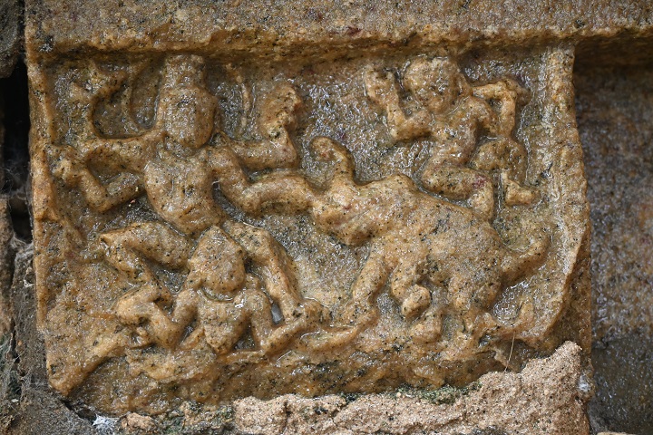 While visiting a shiva temple in Markazhi month he finds an interesting miniature sculpture of “Gajendra Moksham” in the west side of South Gopura of Thiruvazhanchuzhi temple.