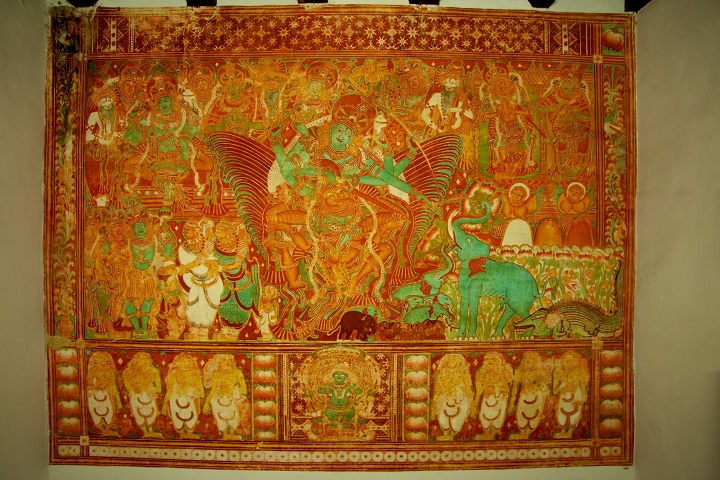 Gajendra Moksham-The largest mural painting in Kerala, it is located in the Krishnapuram Palace, Kayamkulam. It depicts Vishnu rescuing the cursed elephant, Gajendra and liberating him from the physical and spiritual bonds that chained him.