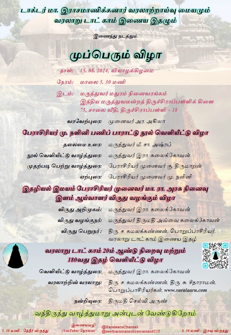 வாசகர்களுக்கு வணக்கம். வரலாறு டாட் காம் மின்னிதழைத் தாங்கள் வாசிக்கத் தொடங்கி 20 ஆண்டுகள் நிறையப்போகிறது. திருச்சிராப்பள்ளி டாக்டர் மா. இராசமாணிக்கனார் வரலாற்றாய்வு மையத்தின் வழிகாட்டலில் 2004ம் ஆண்டு ஆகஸ்ட் மாதம் 15ம் தேதியன்று தொடங்கப்பட்டது. மையத்தின் வெளியீடான வரலாறு ஆய்விதழைப் போன்றே "உண்மை நின்றிட வேண்டும்" என்ற கொள்கையில் உறுதியாக நின்று கற்பனைகளுக்கோ பொய்களுக்கோ இடம்தராமல் 180வது இதழை வெளியிடப்போகிறோம். இதை முப்பெரும் விழாவாக இம்மின்னிதழுக்கு விதைபோடப்பட்ட திருச்சிராப்பள்ளியில் கொண்டாடுவதில் பேருவகை கொள்கிறோம். எவை அந்த மூன்று பெரும் விழாக்கள்? திருச்சிராப்பள்ளி சீதாலட்சுமி இராமசாமி கல்லூரியில் பல்வேறு பொறுப்புகளை வகித்து வரலாற்றுத்துறையின் தலைவராகப் பணியாற்றிப் பணிநிறைவு பெற்றிருக்கும் பேராசிரியர் முனைவர் மு. நளினி அவர்களின் வரலாற்றுப் பங்களிப்பைப் போற்றும் நேரம் இது. தமிழ்நாட்டுக் கலைவரலாற்றுக்கான இவரது பங்களிப்புகள் வரலாற்றில் இடம்பெற்றிருப்பவை. தவத்திரு குன்றக்குடி அடிகளார் அவர்களால் "கல்வெட்டுக் கலைச்செல்வி" பட்டம் பெற்ற இவர் கண்டறிந்த எண்ணற்ற கல்வெட்டுகளும் அவை பகரும் செய்திகளும் இவர் பணிபுரிந்த கல்லூரியையும் ஆய்வு மையத்தையும் தம்மிடம் பயின்ற மாணவியரையும் அடுத்த நிலைக்கு உயர்த்தின என்றால் மிகையில்லை. தன்னலம் கருதாத இவரது உழைப்பு வரலாறு டாட் காம் மின்னிதழுக்கும் ஊக்கத்தை அளித்தது என நாங்கள் பெருமையாகக் கூறுவோம். வரலாறு டாட் காம் தொடங்கிய நாள் முதல் எங்கள் குழுவினரின் வளர்ச்சியில் உண்மையான அக்கறை காட்டிய ஒரு நல்லுள்ளம் இன்று நம் நினைவில் வாழ்ந்துகொண்டிருக்கிறது. துவண்ட நேரங்களிலெல்லாம் எங்களுக்குத் தோள்கொடுத்து எந்தத் திசையில் எவ்வாறு பயணிக்க வேண்டும் எனத் தக்கநேரத்தில் நேரிலோ தொலைபேசியிலோ ஆற்றுப்படுத்திய பேராசிரியர் முனைவர் மா.ரா. அரசு அவர்களுக்கு இணையாக இன்னொருவரைக் காண்பது கடினம். அவரது பெயரில் வரலாற்றாய்வு மையம் ஒரு விருதை நிறுவி ஆண்டுதோறும் ஓர் இளம் வரலாற்றாய்வாளருக்கு வழங்கி வருகிறது. முதல் விருது 2021ம் ஆண்டில் வரலாறு டாட் காமின் நிறுவனர்களில் ஒருவரான திரு. லலிதாராம் அவர்களுக்கும் 2023ம் ஆண்டில் இம்மின்னிதழின் கட்டுரையாளரும் புதுக்கோட்டை மாவட்டக் கோயிற்கலைகளை ஆய்வு செய்தவருமான முனைவர் தி. சுமிதா அவர்களுக்கும் இவ்வாண்டு ஆசிரியர் குழுவின் திரு. ச. கமலக்கண்ணன் அவர்களுக்கும் கிடைப்பது என்பது உள்ளபடியே அரசு அவர்களின் கையாலேயே விருதைப் பெறுவதற்கு ஒப்பானது. இவ்விரு பெருமைமிகு நிகழ்வுகளுடன் ஒன்றாக மின்னிதழின் 20ம் ஆண்டு நிறைவுவிழாவையும