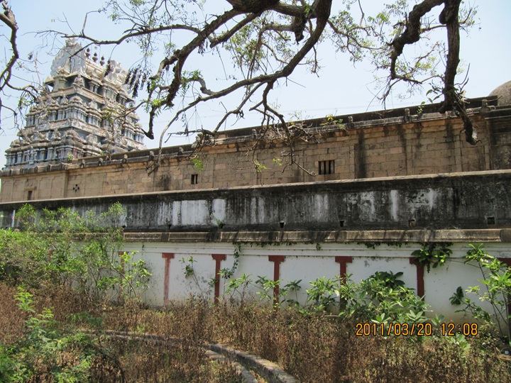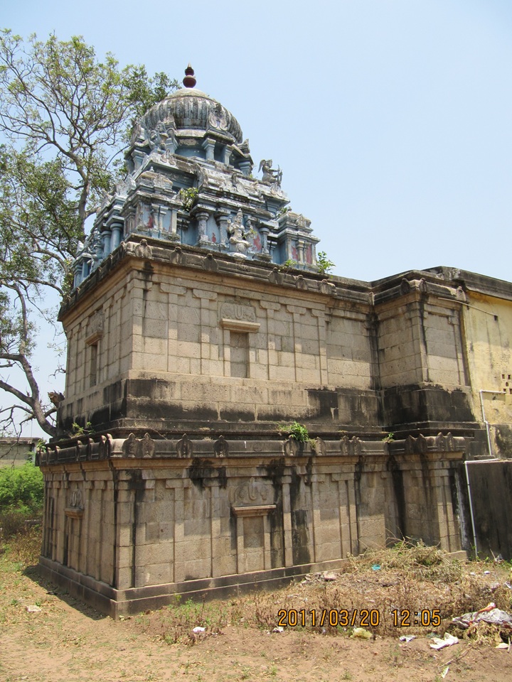 உறுப்பு வேறுபாடற்ற தாங்குதளம், எளிய நான்முக அரைத்தூண்கள் தழுவிய சுவர், வெட்டுத் தரங்கப் போதிகைகள், கூரையுறுப்புகள் பெற்றுள்ள வெற்றுத்தளத்தின் மகரதோரணத் தலைப்பிட்ட கோட்டங்கள் வெறுமையாக உள்ளன. மகரதோரணத்தில் நாமம் நடுவிலும் சங்கு, சக்கரம் இவை நாமத்தின் இருபுறத்தும் காட்டப்பட்டுள்ளன.