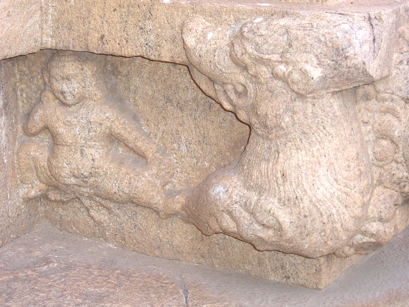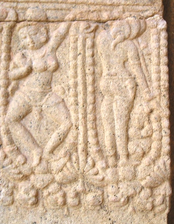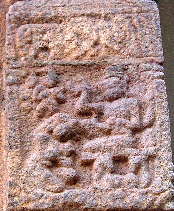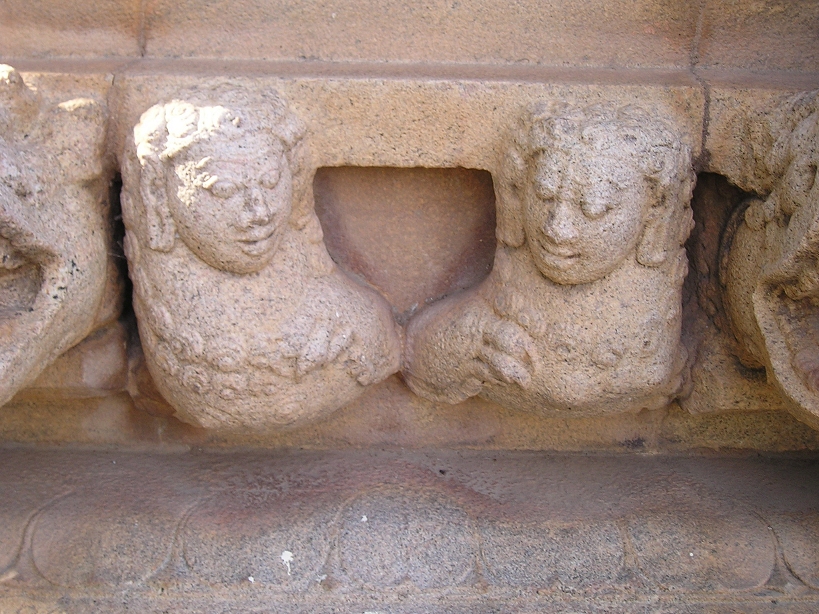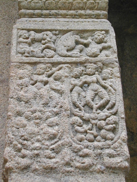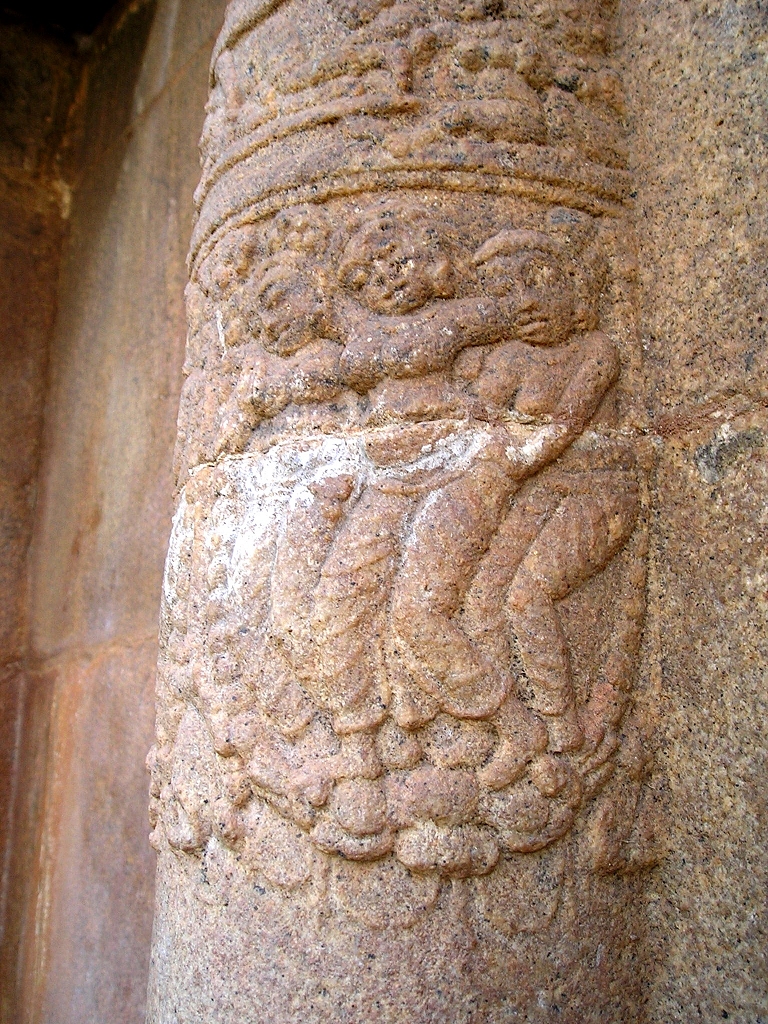![]() யாளிகளைப் பார்த்துக்கொண்டுவரும் பொழுது, தெற்குப்பக்கம் பிக்ஷாடனர் சிலைக்கு இடது பக்கத்தில், ஒரு யாளி யாரடா அது என்னை சீண்டுவது என்பது போல் கோபத்துடனும் ஆக்ரோஷத்துடனும் திரும்பிப்பார்க்க, நாமும் யாளி பார்ப்பது எவரை என்று பார்த்தால், அட பாலகன் போல் இருக்கும் ஒரு வீரன் ஒரு காலை மடக்கி ஒயிலாக அமர்ந்த நிலையில், யாளி அவனை நோக்கி நகராத படி தன் மற்றொரு காலை நீட்டி தடுக்கிறான். அந்த வீரன் நல்ல விஷமக்காரனாக இருக்க வேண்டும், யாளியை சீண்டிவிட்டதோடல்லாமல், அது அவன் மேல் பாயாதிருக்கும் வகையில் தடுக்கும் விதம். ஆஹா! அந்த சிற்பிக்கு நிச்சயம் இப்படியொரு விஷமக்கார குழந்தை இருந்திருக்க வேண்டும். அக்குழந்தையின் ஞாபகத்தில் அந்த வீரனை செதுக்கியிருக்க வேண்டும். ![]() அந்த புலிமுகக் கச்சு வீரனைத்தாண்டி இருக்கும் இரு யாளிகள் மனித முகமும் யாளி உருவம் அல்லது பறவை உருவம் கொண்டவை (Spinx). இப்படியாக, யாளி வரியைப் பார்த்துக்கொண்டு உங்கள் இரண்டாம் வலத்தையும் முடித்தாகிவிட்டதா? ![]() அடுத்து மூன்றாம் வலம். எல்லாம் தான் பார்த்தாகிவிட்டதே இன்னும் என்ன இருக்கிறது என்கிறீர்களா? நீங்கள் இன்னும் சரிவரப் பார்க்கவில்லையல்லவா அதுதான். இப்பொழுது பார்த்துவிடலாம். இப்பொழுது சுவற்றில், செதுக்கப்பட்டிருக்கும் தூண்கள் (Pilasters) ஒவ்வொன்றாய் பார்த்துக் கொண்டு வாருங்கள். நன்றாக உன்னிப்பாக கவனித்துப் பார்க்கவும். என்ன தெரிகிறது. ஆமாம் நீங்கள் நினைப்பது சரி தான். அநேகமாக அவையனைத்தும் நாட்டியக் கரணங்கள் தான். இவற்றை சிற்பச்செதுக்கல்கள் (Miniatures) என்று சொல்வார்கள். இந்த சிற்ப செதுக்கல்கள் எல்லாமே முக்கியமாக பார்க்க வேண்டியவை தான் என்றாலும் மிகவும் முக்கியமாய் பார்க்கவேண்டியவைகளை இங்கே சொல்கிறேன். முதலில் தக்ஷிணாமூர்த்திக்கும் பிக்ஷாடனர்க்கும் மத்தியில் இருக்கும் தூணில் ஒரு மங்கை நடமாடிக்கொண்டிருக்க, பக்கவாத்தியக்காரர் மத்தளம் போன்ற ஒன்றை இடது கையால் பிடித்தபடி வலது கையால் முழக்கிக்கொண்டிருக்கிறார். அந்த மத்தளத்தின் பெயர் இடக்கை. தக்ஷிணாமூர்த்தியின் சிலைக்கருகில் இருக்கும் மற்றொரு தூணில் வலது பக்கமிருக்கும் ஒரு மங்கை நடனமாடிக்கொண்டிருக்க, இடப்பக்கமிருப்பவள் தன் முதுகுப்புறத்தை நமக்குக் காட்டியபடி, ஒரு பெரிய ஊதுகுழலை (நாதஸ்வரம் போல் பெரியது) இசைத்துக்கொண்டிருக்கிறாள். அவளின் தலைக் கொண்டை அலங்காரத்தைப் பாருங்கள். எத்தனை அழகு. ![]() அடுத்து புலிமுகக்கச்சு வீரனின் அருகில் உள்ள தூணில் இருக்கும் வளைகாப்புப் படலம். ஒரு கருத்தரித்த பெண்மணி தன் தோழிகள் இருவரின் தோள்களில் கையை போட்டபடி, அவர்கள் தாங்க நடந்துவரும் காட்சி, அவளின் முகத்தில