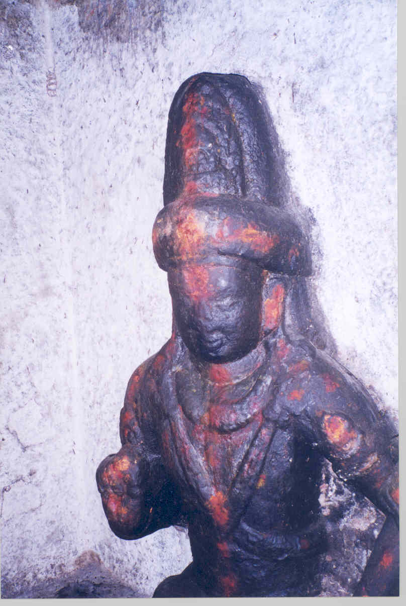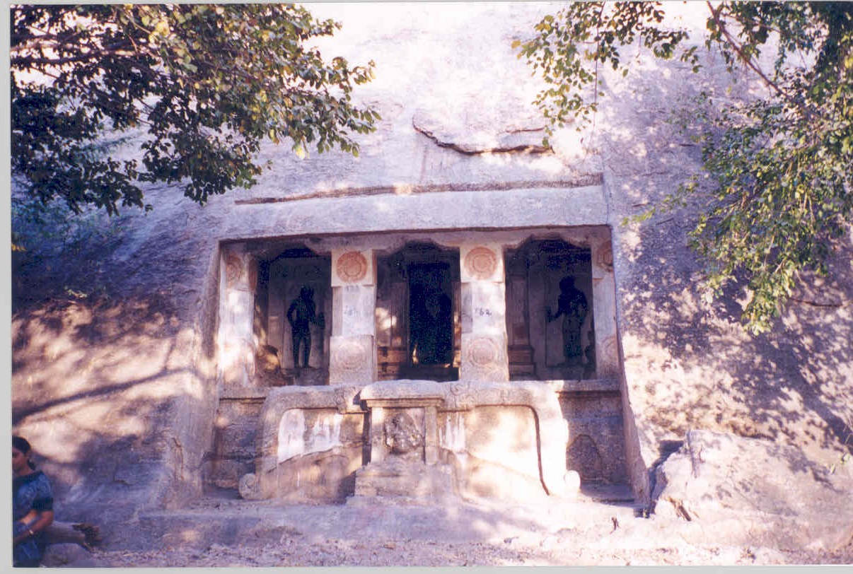 பெருமாள் கோயிலின் இடப்புறம் நெளியும் சிறியதொரு சந்தில், 'கல்லும் முள்ளும் காலுக்கு மெத்தை' எனக் கருதி நடப்பார்க்கும் பாடாய்ப் பட்டபிறகே மேற்கு நோக்கிய இந்த 'லாடன்' கோயிலின் தரிசனம் கிடைக்கிறது. மலையென்றும் பாராமல் நெருக்கியடித்து ஆக்கிரமித்திருக்கும் குடியிருப்புகளின் புழக்கடைக் கோயிலாய் பாதுகாப்பற்ற நிலையில் பாழ்பட்டுப் போயிருக்கும் இந்தக் குடைவரை, மலைச்சரிவின் கீழ்ப்பகுதியில் அடக்கமாய் அகழப்பட்டுள்ளது. முன்னால் முகப்பும் பின்சுவரிலொரு கருவறையுமாய் அமைந்துள்ள இம்மண்டபக் கோயிலின் நடு அங்கணத்தை அடைய வாய்ப்பாக வடக்கிலும் தெற்கிலும் பிடிச்சுவர்களுடன் கூடிய படிகள் தரையிலிருந்து வெட்டப்பட்டுள்ளன. பக்கத்திற்கு ஐந்து படிகளைக் கொண்டிருக்கும் இவ்வமைப்பின் நடுப்பகுதி சதுரதளமாய் அமைந்துள்ளது. பாறைத் தரையிலிருந்து முதற்படியை அடைய 5செ.மீ. உயரத்திலொரு தளம் இருபுறத்தும் வெட்டப்பட்டுள்ளது. 1.56மீ. உயரமுள்ள பிடிச்சுவரின் முன்புறத்தே அதன் நடுப்பகுதியில், 1.13மீ. அகலமும் 1.60மீ. உயரமும் கொண்ட திருமுன்னொன்று அமைக்கப்பட்டுள்ளது. உபானம், ஜகதி, உருள்குமுதம், கம்பென அமைந்த துணைத்தளத்தின் மேல் உள்ளடங்க எழும் உறுப்பு வேறுபாடற்ற இரண்டு நான்முக அரைத்தூண்கள் உத்திரம் தாங்குகின்றன. மேலே, வாஜனமும், கூரையின் வெளிநீட்டலாக விளிம்பு தட்டப்பெற்று நன்கு வடிவமைக்கப்பட்ட கபோதமும் காட்டப்பட்டுள்ளன. இரண்டு தூண்களுக்கும் இடைப்பட்ட சுவர்ப்பகுதியில் வலக்கையில் உருள்தடியேந்திய ஆண்வடிவமொன்று அர்த்தபத்மாசனத்தில் உள்ளது. இடக்கையால் வயிற்றைத் தொட்டபடி உள்ள அதன் தலையில் தலைப்பாகை சிற்றியது போன்ற அலங்காரம். தோள்களைத் தழுவியிறங்கும் செவிக்குண்டலங்களை இன்னவையென அடையாளம் காணக்கூடவில்லை. குள்ளச் சிறுவடிவமும் பானை போன்ற வயிறும் கொண்டு விளங்கும் இவ்வடிவத்தை கணங்களுள் ஒன்றாய்க் கொள்ளலாம்(1). இத்திருமுன் கபோதத்தின் இருபுறத்தும் வெளிப்படும் பிடிச்சுவர்களின் தொடக்க மேற்பகுதிகள் யாளித்தலைகளாகவும், தொடர்ந்து நீண்டு வளைந்திறங்கும் பகுதிகள் அவற்றின் துதிக்கைகளாகவும் வடிவமைக்கப்பட்டுள்ளன. இத்துதிக்கைகள் தரையை அடுத்துள்ள கீழ் சதுரத்தளத்தையொட்டி நன்கு சுருண்டுள்ளன. குடைவரை முகப்பின் கீழ்ப்பகுதியில் பாதபந்தத் தாங்குதளம்(2) அமைக்கும் முயற்சி முழுமையுறாமல் உள்ளது. 1.50மீ. உயரத்திற்கு அமைந்துள்ள இத்தாங்குதளத்தின் மேலுறுப்புகளான பட்டிகையும் கண்டமும் நன்கு வடிவமைக்கப்பட்டுள்ளது. மேலும் கீழும் கம்புகளின் தழுவலைப் பெற்றுள்ள கண்டம், இடையிடையே பாதங்களையும் கொண்டுள்ளது. இதன் கீழமைய வேண்டிய குமுதமும் ஜகதியும் முறையா