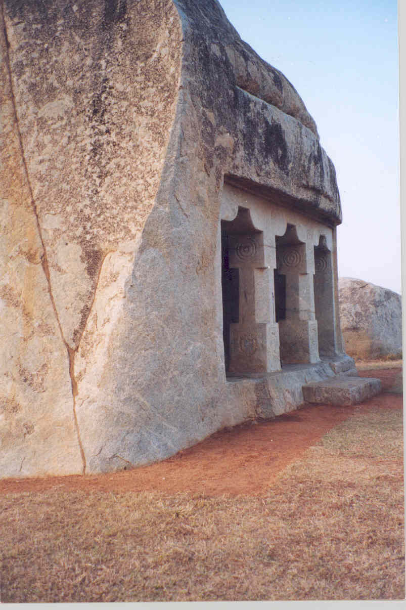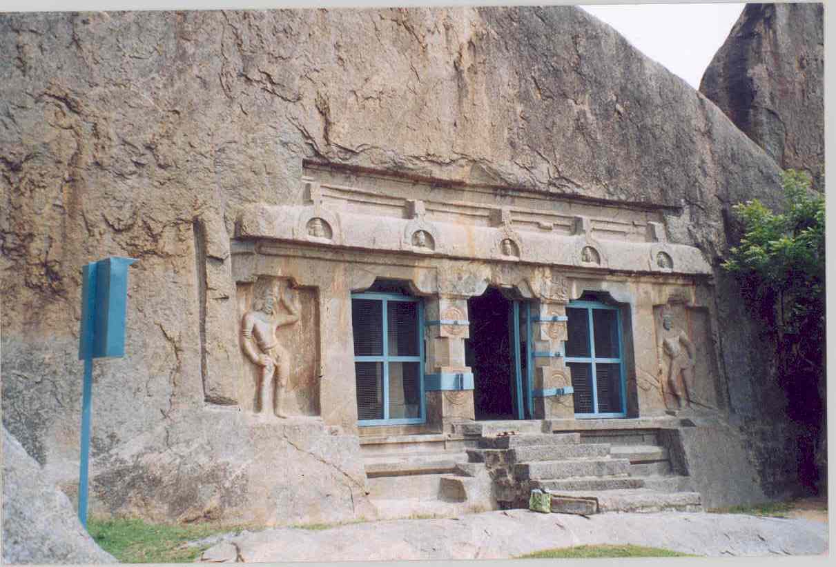 குடைவரை, ஒற்றைக்கல் தளி, கட்டுமானக்கோயில் ஆகிய மூன்றுக்கும் தாங்குதள அமைப்பு பொதுவாக இருந்தாலும், ஆதிதளமானது ஒவ்வொன்றிலும் ஒவ்வொரு மாதிரி காணப்படும். இந்த இதழில், குடைவரையை மட்டும் காண்போம். அதுவும் குறிப்பாகக் குடைவரைகளின் முன்னோடி முதலாம் மகேந்திரவர்மர் (சிவகாமியின் சபதத்தில் வருபவரேதான்!) உருவாக்கிய குடைவரைகளையும், கட்டடக்கலை உறுப்புக்களை வைத்து அவற்றின் கால வரிசையைத் தீர்மானிப்பது பற்றியும் காண்போம். தாங்குதளத்தின் உச்சி உறுப்பான உபரிகம்பிலிருந்து இந்த ஆதிதளம் ஆரம்பமாகிறது. ![]() மேலே காட்டப்பட்டிருப்பது தளவானூரில் மகேந்திரர் அமைத்த சத்ருமல்லேசுவராலயம். பாதபந்தத் தாங்குதளத்தில் ஆரம்பித்து, கூரை உறுப்பான கபோதத்தில் முடியும் இக்குடைவரையை உதாரணமாகக் கொண்டு, ஆதிதளத்தைப் பற்றி விரிவாகப் பார்ப்போம். கீழிருந்து உபானம் (படிக்கட்டுக்கள் தரையுடன் சேருமிடம்), ஜகதி, எண்பட்டைக்குமுதம், கம்புகளுடன் கூடிய கண்டபாதம், பட்டிகை ஆகியவை நமக்குத் தெரியும். அதிலிருந்து ஆரம்பித்து, கூரை உறுப்பான கபோதம் (இக்கால ஜன்னல்களுக்கு வைக்கும் sun shade போன்ற அமைப்பு) வரையிலுள்ள பகுதிக்குப் பெயர் முகப்பு (facade). அடுத்த இரண்டு பத்திகளைப் படித்ததும் இன்னும் தெளிவாகப் புரியும். இந்த வாயிற்காவலர்கள் நின்றுகொண்டிருக்கும் இடத்திற்குக் கோட்டம் என்று பெயர். இந்தக் கோட்டங்கள் முகப்பில் சேராது. அவர்களுக்கு நடுவில் இரண்டு தூண்கள் இருக்கின்றன. மகேந்திரர்தான் மரம், உலோகம் ஆகிய எதையும் பயன்படுத்தவேயில்லையே? பிறகெப்படி கம்பி வைத்த ஜன்னல் வந்தது என்று கேட்காதீர்கள். அவை தொல்லியல் துறையின் உபயம். அந்த ஜன்னல்கள் இருக்குமிடம்தான் அங்கணம். அதாவது, இரு தூண்களுக்கு இடைப்பட்ட பகுதி. இந்தக் கோஷ்டங்களைப் பார்த்தால் என்ன தோன்றுகிறது உங்களுக்கு? அங்கணங்களை அடைத்து அதன்மேல் சிற்பங்களைப் புகுத்தியிருப்பது போல் தெரியவில்லை? அதேதான். இருதூண்களுக்கிடைப்பட்ட பகுதியை அடைத்திருந்தால் கோஷ்டம். அடைக்காமல் திறந்த நிலையிலிருந்தால் அது அங்கணம். இது பக்தர்கள் அதிக அளவில் சென்று வருவதற்காக அமைக்கப்பட்டது. என்ன ஒரு Fire Evacuation Plan பாருங்கள்!! இந்த முகப்பில் எத்தனை தூண்கள் உள்ளன? கோட்டங்களுக்கு இருபுறமும் தலா இரண்டு தூண்கள். நடுவில் இரண்டு. ஆக மொத்தம் ஆறு தூண்கள். சரி. நடுவிலிருக்கும் இரு தூண்களுக்கும் கோட்டங்களின் இருபுறமுமிருக்கும் இரு தூண்களுக்கும் ஏதாவது வித்தியாசம் தெரிகிறதா? நன்றாக உற்றுப்பாருங்கள். நடுவிலுள்ள தூண்களைச் சுற்றி வரமுடியும். கோட்டங்களுடன் அமைந்த தூண்களைச் சுற்றி வரமுடியாது. இந்த வேறுபாட்டைக் குறிக்கும் வகையில் நடுத்தூண்கள