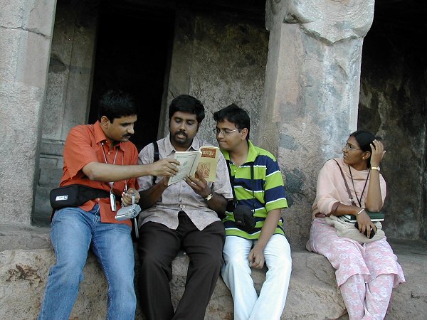 ![]() மாமண்டூரில் மகேந்திரரின் குடைவரை அமைப்பை புரிந்துகொள்ள முயற்சிக்கும் வரலாறு டாட் காம் குழு (வெண்பாப் புலி கிருபா, பயணப்புலி ம.இராம்நாத் நீங்கலாக) இடமிருந்து வலம் - சே.கோகுல், ச.கமலக்கண்ணன், லலிதா (ம. இராம்), மா.லாவண்யா முழுமுதற்காரணம் அமரர் கல்கி. இரா. கிருஷ்ணமூர்த்தி. எங்களுக்கு மட்டுமல்ல. இன்று வரலாற்றாய்வில் ஈடுபட்டிருக்கும் பெரும்பாலான ஆய்வாளர்களுக்கு மண்ணுலகச் சக்கரவர்த்திகள் இராஜராஜசோழரையும் மகேந்திரவர்மரையும் அறிமுகப்படுத்திய ஈடு இணையற்ற எழுத்துலகச் சக்கரவர்த்தி. பொன்னியின் செல்வன் மற்றும் சிவகாமியின் சபதம் என்னும் பொந்திடை வைக்கப்பட்ட அக்கினிக்குஞ்சுகள் எக்காலத்திலும் அணையாமல் எதிர்காலத் தலைமுறைகள் அனைத்தின் நெஞ்சிலும் அக்கனலைப் பற்ற வைக்கும் என்பதில் சந்தேகமில்லை. பொன்னியின் செல்வன் மட்டுமல்ல. பொன்னியின் செல்வன் யாஹூ குழுமத்துக்கும் எங்கள் வளர்ச்சியில் பங்குண்டு. கல்கி பற்ற வைத்த இந்த நெருப்பைத் தகுந்த காலம் வரும் வரை அணையாமல் பாதுகாத்தவர் எங்கள் பெரியண்ணன் திரு. சுந்தர் பரத்வாஜ். கருவுற்ற ஒரு தாய், அக்கரு வளர்ந்து தன் சொந்த பலத்தில் உலகை எதிர்கொள்ளும் நிலை வரும்வரை பாதுகாத்து, காலம் வந்தவுடன் பெற்றுத் தந்தையின் கையில் ஒப்படைப்பதைப் போல, இன்றும் சோழர் வரலாற்றில் ஆர்வமுள்ளவர்களுக்குத் தார்மீக பலமாக விளங்கி வரும் இச்சிவபாதசேகரர் எங்களுக்குக் கிடைத்தது நாங்கள் என்றோ செய்த புண்ணியத்தின் பலன். ஏற்கனவே பலமுறை பல கட்டுரைகளின் வாயிலாக நன்றி தெரிவித்திருந்தபோதும்கூட, இதை எழுதும்போதும் உள்ளம் நெகிழத்தான் செய்கிறது. பெரியண்ணனின் அரவணைப்பிலும் வழிகாட்டலிலும் வளர்ந்து வந்த எங்களை அறிவூட்டும் தந்தையின் நிலையிலிருந்து தத்தெடுத்த முனைவர் இரா. கலைக்கோவன் மூன்றாமவர். நாங்கள் எதிர்கொண்ட வரிசையில்தான் மூன்றாவது மனிதரேயொழிய, அணுகுமுறையில் மூன்றாம் மனிதராக என்றுமே உணர்ந்ததில்லை. எங்களில் ஒருவராக, தந்தை - மக்கள் என்ற தலைமுறை இடைவெளியுடனோ, ஆசிரியர் - மாணவர்கள் என்ற மரியாதை கலந்த பயத்துடனோ இல்லாமல், அனைவரும் நண்பர்கள் என்ற உயர்ந்த உள்ளத்துடன் எங்களை வழிநடத்திச் செல்பவர். ஒருமுறைக்குப் பலமுறை உறுதி செய்யப்பட்ட உண்மைகள் மட்டுமே வரலாறு என்னும் மகுடம் தாங்கத் தகுதி படைத்தவை என்ற தாரக மந்திரத்துடன் ஆய்வுலகிற்குள் எங்களைக் கைப்பிடித்து உடன் அழைத்துச் செல்பவர். மூவர் வளர்த்த இந்த வேள்வித்தீயினால் யாராவது பயன் பெறவேண்டாமா? ஒவ்வொரு மாத வேள்வியின் முடிவிலும் கிடைக்கும் அவிர்பாகத்தைச் சுவைத்துவரும் வாசகர்களாகிய நீங்கள்தான் வரலாறு.காம் கட்டடத்தின் நான்காவது தூண். இதுவரை