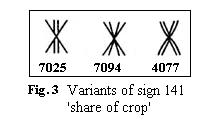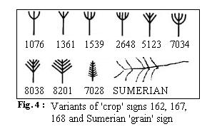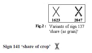 Introduction 1. The Indus or Harappan Civilization was based on agricultural surplus like all other contemporary river-valley civilizations of the Bronze Age. The annual flooding in the Indus and the rivers of the Punjab brought down rich silt making irrigated lands very fertile. There must have existed administrative machinery to collect the grain as taxes due to the State or offerings to the temples. The grain would have been stored in large granaries for distribution as wages, especially to the army of workers employed in the construction of massive public works like the brick platform at Mohenjodaro, fortifications at Harappa, city drainage systems, irrigation canals etc. 2. It would have been convenient to control the apportionment of grain right at the threshing floor. Sheaves of grain stalks would have been bundled into lots and marked with clay tags which were then impressed with seals to identify ownership before the grain was transported to granaries or taken away by landlords as their share, leaving the rest as the share of tenant-farmers or wages to the cultivators. 3. It is thus quite likely that Harappan seals and sealings would contain information on agricultural production and distribution. This probable scenario has led me to search for and identify a remarkable set of closely knit signs which appears to refer to crops and sharing of grain. (Text Numbers, Sign Numbers and statistics are cited from my book, The Indus Script: Texts, Concordance and Tables 1977. Four-digit numbers refer to texts and three-digit numbers to signs. The Sign List and List of Sign Variants in the book are the sources for illustrations.) Methodology 4. The proposed interpretations are based on the pictorial character of the signs and their probable functions as determined by positional and statistical analysis of the texts. As the 'rebus' principle is not invoked in this study, there is no need to make any assumption about the language of the texts. I have, however, chosen to cite, wherever apt, bi-lingual (Dravidian and Indo-Aryan) parallels relating to agriculture, as I believe that they represent age-old traditions at the ground level and that they lend support to the proposed ideographic identification of the signs. Agricultural Terms in the Indus Script (Chart) 5. The appended Chart illustrates a set of closely related signs interpreted as 'agricultural terms'. The signs are arranged in a grid of columns and rows to bring out their similarities and inter-relationship. It is remarkable that the entire set of agricultural terms is made up of just three 'basic' signs combining with five 'modifiers'. The basic signs are placed at the head of the three central columns (I to III). The modifiers are listed one below the other in the first column at the left. They consist of three modifying 'elements' (labelled A to C) and two modifying signs. The modified compound signs are placed at the junction of the respective columns and rows. The meanings of the basic signs and the modifiers are given in the Chart. The meanings of the compound signs are derived by the combination of the respective modifier and basic sign. Interpretation of Basic Signs 6. The basic signs, especially their graphic variants, provide the pictorial clues to their identification as explained below. ![]() 7. The point of departure for this study is the X-like sign 137, one of the simplest in the Indus script. It invites comparison with the near-identical ideogram in the Egyptian hieroglyphic script which means 'to divide'. The comparison enables us to assign the same general meaning to the corresponding Indus sign, 'to divide, share' (Fig.1). ![]() 8. The next clue as to what is divided as shares comes from two identical texts on a pair of three-sided prism-like sealings (1623 & 2847) from Mohenjodaro. These are incidentally the longest known Indus texts, each consisting of 26 signs. While all but one of the signs are identical in the two inscriptions, one sign alone (137) shows an interesting variation providing a precious clue to its meaning. The graphic variant in 2847 shows a pair of stalks laden with grain arranged in X- like form to mean 'share (as grain) ' (Fig.2). Sign 137 and the modified compound signs derived from it (in col. I of the Chart) also have other minor graphic variants, where the straight X-like lines are replaced by curved lines suggestive of slender and supple grain stalks (e.g. 1179 & 6131). ![]() 9. This more elaborate sign can be interpreted as a combination of the X like element 'to share' with a pair of tall vertical lines representing 'grain stalks', the whole sign having the meaning 'share of crop'. The proposed identification is supported by the graphic variants of the sign, which suggest 'bundles of grain stalks tied in the middle' (Fig.3). The modified compound signs derived from sign 141 (in col. II of the Chart) also have similar variants (e.g. 2098, 3107 & 4077). ![]() 10. Many Dravidian languages have specific expressions for 'share of the crop', which are derived from the verb 'to gather, make into bundles, carry away'; (e.g.) Verbs: Ta. va$ru 'to take by handfuls'; Ma. va$ruka 'to take in a heap'; Ka. va$me 'heap of straw'; Te. va$ru 'to make into a bundle (of hay)'; Malt. ba$re 'to take out as grain' (DEDR. 5362). Nouns: Ta. va$ram 'share, lease of land for a share of the produce, share of the crop of a field'; Ma. va$ram 'share, landlord's share'; Ka. va$ra 'share, landlord's half-share of the produce of a field in lieu of rent' (DEDR 5359). Cf. Ta. va$ri 'produce, grain' (Tamil Lexicon). Also see the discussion below on Ta. me$l-va$ram 'landlord's share of the produce' and kut|i-va$ram 'tenant's share of the produce'. The pictorial depictions in the corresponding Indus signs are in close accord with the imagery invoked by the Dravidian expressions cited above. ![]() 11. Sign 162 is a self-evident ideogram for 'crop' as may be seen from its graphic variants (including signs 167 and 168 now r