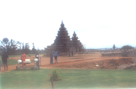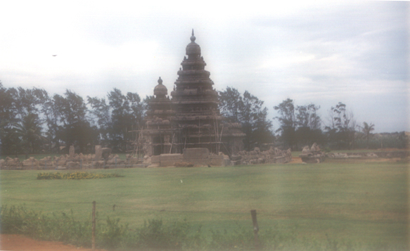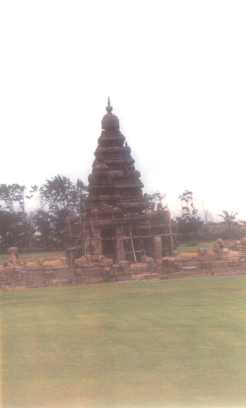 உலகட்தின் எந்த ஒரு கடற்கரை நகரமும் கலைக்கோயில்களின் நகராக, காலம் காத்து வைத்திருக்கும் வரலாற்றுப் படப்பிடிப்பாக அமையவில்லை என்பதும் மாமல்லபுரத்தின் மகுடத்தில் மற்றொரு வைரத்தைப் பதிக்கின்றது, இங்குதான், இங்கு மட்டும்தான் ஒருகல்தளிகளாய்ச் செதுக்கப்பட்ட ஒன்பது பாறைக் கோயில்கள், ஒவ்வொன்றும் ஒரு வடிவில், ஒன்றுக்கொன்று ஏதாவது ஒரு விகிதத்தில் மாறுபட்ட நிலையில், புதுமை அவாவிய பல்லவக் கூறுளிகளின் படைப்பாற்றலுக்குக் கட்டியம் கூறியபடி, வருவார்க்கும் போவார்க்கும், வாழ்ந்து மறைந்த ஒரு சமுதாயத்தின் வனப்பான அடையாளங்களைக் காட்டியபடி காட்சி தருகின்றன. ![]() மாமல்லபுரத்தின் மகத்தான பெருமைகளுள் குறிப்பிடத்தக்க கட்டுமானமாய் கடற்கரைக் கோயில் வளாகத்தைச் சுட்டலாம். சீறிவரும் அலைகள் பாறைகளில் மோதும் பேரிரைச்சலின் பின்னணியில், கால்கள் அழுந்தப் பதிய நடக்கும் மணற்சூழலில், சுற்றிலும் வேறெந்தக் கட்டுமானமும் கண்ணுக்கெட்டும் தொலைவு வரை இல்லாத நிலையில், முப்புறத்தும் வெள்ளைச் சரிகைகளுடன் நீலப்பட்டு உடுத்தினாற்போன்ற கடல் அலைகளின் அரவணைப்பில், வானத்தைத் தொட்டுவிடும் வேகத்தில் எழுந்த மனித முயற்சிகளின் முத்திரைகளாய் நிற்கும் கடற்கரைச் சிம்மேசுவரங்கள், பல்லவர் மரபில் வந்த இராஜசிம்மரின் மனோகரப் படைப்புகள். கிழக்கில் நின்று பார்த்தால் ஒரு கோயில் போலவும், மேற்கிலிருந்து பார்த்தால் இரண்டு கோயில்கள் போன்றும் காட்சி தரும் இவ்வளாகத்தில் மூன்று இறையகங்கள் விளைந்துள்ளன. தெற்கிலிருந்தும் வடக்கிலிருந்தும் பார்ப்பவர்க்கு மட்டுமே ஒருக்களிப்புப் பார்வையில் இந்த உன்னதம் விளங்குமாறு கட்டமைப்புகளை நிறுத்திக் கண்கட்டுவித்தை நிகழ்த்தியிருக்கும் பல்லவச் சிற்பிகள் பெருமைக்குரிய இந்த வளாகத்திற்கு நந்திகள் அமர்ந்த சுற்றுச் சுவரையும் படைத்தனர். மேற்கில் எளிமையான கோபுரவாயில். தமிழ்நாட்டின் மிகப்பழைய கோபுரங்களுள் ஒன்றாய் அமைந்த இது, இன்று தாங்குதளத்துடன் மட்டுமே காட்சி தருவதற்குச் சுற்றுச்சூழல் துன்பங்களைத்தான் தண்டிக்க வேண்டியுள்ளது. ![]() பல்லவர்க்குப் பிடித்தமான தாங்குதள அமைப்புகளுள் பிரதிபந்தமும் ஒன்று. ஜகதி, குமுதம், பிரதிவரி, கம்பு எனும் நான்கு முதன்மை உறுப்புகளைப் பெற்றெழும் இத்தாங்குதளமே, கல்வெட்டுகளுடன் கடற்கரைக் கோயிலைச் சுற்றுச்சுவராய்ச் சூழ்ந்துள்ளது. இச்சுற்றுச்சுவர் மேற்குவாயிலின் முன், இராஜசிம்மரின் விருதுப்பெயர்களுடன் கொடிக்கருக்குகளாலும் கின்னரர்களாலும் அலங்கரிக்கப்பட்ட பலித்தளங்கள். இவற்றைக் கொடித்தளங்களாகக் கருதுவாரும் உண்டு. சுற்றுச்சுவர் வாயில்வழி உள்நுழைவாரை சிதைந்