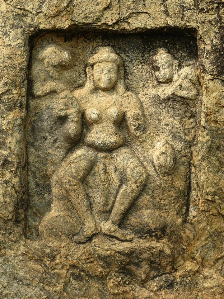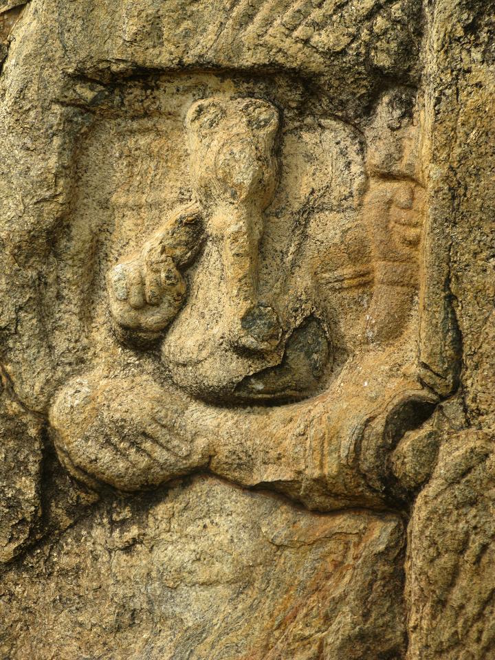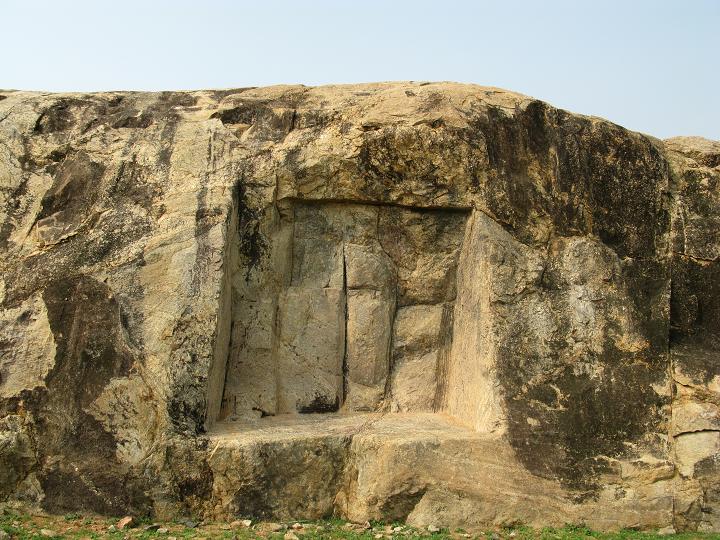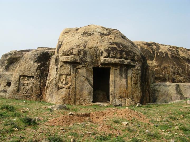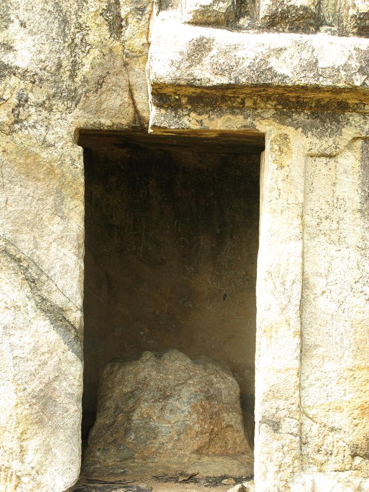 மேலிருந்து கீழாக ஏறத்தாழ அரைவட்ட வடிவில் பெரும்பாறை ஒன்றில், நிலத்திலிருந்து 10 செ. மீ. உயரத்தில், 82 செ. மீ. அகல, 1. 77 மீ. உயர வாயிலொன்று திறக்கப்பட்டுள்ளது. வாயிலை அணைத்தவாறு அதன் நிலைக்கால்கள் என உறுப்பு வேறுபாடற்ற இரண்டு நான்முக அரைத்தூண்கள் பக்கத்திற்கு ஒன்றாக வெட்டப்பட்டுள்ளன. பாறை வளைமுகமாகும் இடத்தில், மேலுமிரண்டு நான்முக அரைத்தூண்கள் பக்கத்திற்கொன்றாய் அமைந்துள்ளன. அரைத்தூண்களுக்கு இடைப்பட்ட பகுதி நன்கு சமன் செய்யப்பட்ட ஆழமற்ற கோட்டங்க ளாகச் சிற்பங்கள் ஏதுமின்று உள்ளன.(2) நிலத்திலிருந்து 36 செ. மீ. உயரமுள்ள வடகோட்டம் 1. 50 மீ. உயரம், 67 செ. மீ. அகலம் பெற்றமைய, 1. 43 மீ. உயரம், 69 செ. மீ. அகலம் பெற்றுள்ள தென்கோட்டம் நிலத்திலிருந்து 28 செ. மீ. உயரத்தில் உள்ளது. ![]() தூண்களின் மேலுள்ள போதிகைகள் விரிகோணக் கைகளால் தாங்கும் உத்திரமே கருவறை வாயிலின் மேல்நிலையாகியுள்ளது. கருவறை வாயிலின் கீழ்ப்பகுதியே கீழ்நிலையாக அமைந்துள்ளது. உத்திரத்தை அடுத்துக் கூரையைத் தழுவிய வாஜனம். வடிவமைக்கப்படாத கபோதமாய்ச் சீரமைக்கப்பட்ட நிலையில் முன்னோக்கி நீட்டப்பட்டுள்ள கூரையின் நீட்சி, கருவறை வாயிலுக்கு மேலே வலப்புறத்தே முற்றிலுமாகச் சிதைந்துள்ளது. அதைப் போலவே வாயிலின் வல அணைவுத்தூணும் அதன் மேலுள்ள போதிகை, உத்திரம், வாஜனம் இவையும் சிதைந்துள்ளன. ![]() 1. 49 மீ. அகலம், 1. 79 மீ. நீளம், 1. 81 மீ. உயரம் பெற்றுள்ள கருவறையின் சுவர்களும் கூரையும் சமன் செய்யப்பட்டுள்ள நிலையில் வெறுமையாக உள்ளன. தரையின் நடுப்பகுதியில் பணி தொடங்கப்பட்ட நிலையில் தாய்ப்பாறையிலான இலிங்கம் காணப்படுகிறது. ஆவுடையாரின் கீழ்ப்பகுதியில் வடமேற்கு மூலையில் உபான அமைப்பும் மேற்பகுதியில் கோமுகமும் காட்டப்பட்டுள்ளன. எஞ்சிய பகுதிகள் உருவாக்கம் பெறாமல் பாறையாகவே உள்ளன.(3) கோமுகத்தின் கீழுள்ள தரைப் பகுதியில் முழுக்காட்டு நீர் வாங்கும் பள்ளம் உள்ளது. கருவறைப் பின்சுவரில் கோட்டுருவங்களாக ஆடை, அணிகளற்ற ஒரு பெண் ஓடுவது போலவும் கோமாளிக் குல்லாய் அணிந்த ஓர்ஆண் துரத்துவது போலவும் பிற்காலச் செதுக்கல் ஒன்று காணப்படுகிறது. கருவறை முன் சுவரிலுள்ள வலக்கோட்டத்தை அடுத்து, நிலத்திலிருந்து 74 செ. மீ. உயரத்தில் அணைவுத்தூண்கள் ஏதுமற்றதாய் 60 செ. மீ. அகல, 82 செ. மீ. உயரக் கோட்ட மொன்று அகழப்பட்டுள்ளது. அதில் மகுடமற்ற தலையுடன்(4) அர்த்தபத்மாசனத்தில்(5) உள்ள இடம்புரிப் பிள்ளையாரின் முன் கைகளுள் வலக்கையிலுள்ள பொருளை அடையாளப்படுத்த முடியவில்லை. இடக்கைப் பொருள் பாசமாகலாம்.(6) பின் கைகள் இரண்டுமே தொடை, முழங்கால் பகுதிகளில் இருத்தப்பட்டுள்ளன.(7) இடத்தந்தம் முழுமையாக இருக்க, வலத்தந்தம் உடைந்துள்ளது. ![]() குடைவரைப் ப