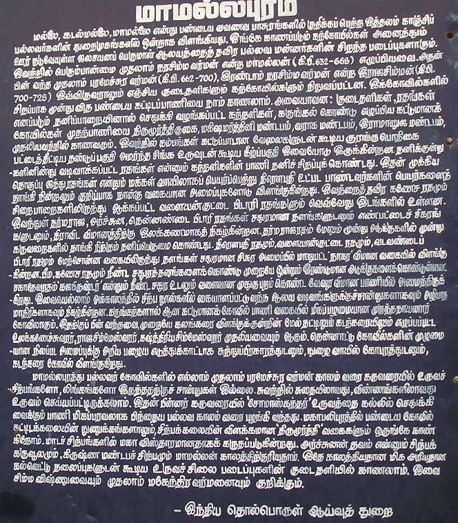 பெரும்பான்மையான கோயில்களில் குருக்களே இந்த திருப்பணியை செய்வார். ஆனால் அவர் கூறும் செய்திகளுக்கும் வரலாறுக்கும் எந்த சம்பந்தமும் இருக்காது. அவர் கூறுவதெல்லாம் அந்த கோயிலில் யார் யார் எந்த எந்த பாவங்கள் செய்து, தோஷங்களில் அவதிப்பட்டு, எந்த எந்த குளம் குட்டையில் நீங்கி எப்படி நற்கதி அடைந்தார்கள் என்பதைப் பற்றியே இருக்கும். கொஞ்சம் காசு உள்ள கோயிலில் இந்த வேலையை குருக்களுக்கு விடாமல் ஒரு பலகையில் எழுதி வைத்திருப்பார்கள். சில இடங்களில், இதைத் தல புராணம் என்ற பெயரில் புத்தகமாகவும் விற்பார்கள். இந்திரனும் சூரியனும் சந்திரனும் இந்த மஹானுபாவர்கள் கூறுவது போலப் பாவங்களைச் செய்திருந்தால், அவர்களையெல்லாம் நம் முன்னோர்கள் தெய்வமாக வணங்கியிருப்பார்களா என்பதை எண்ணிப் பார்க்க வேண்டும். வாய்மையும் இறைவனும் ஒன்றென்று கூறும் மரபில் வந்த நாம் இறைவனின் இருப்பிடத்திலேயே பொய்யை நுழைப்பது பெரிய பாவச் செயலாகும். இந்திய தொல்பொருள் ஆய்வுத்துறையின் கட்டுப்பாட்டில் இருக்கும் இடங்களில் வைக்கப்பட்டிருக்கும் தகவல்பலகைகள், மேற்கூறிய அபத்தங்கள் போலல்லாமல் உண்மையை உலகுக்கு எடுத்துச் சொல்லும் உயர்ந்த நோக்கோடு வைக்கப் பட்டுள்ளன. இப்பலகைகளை தினமும் ஆயிரக்கணக்கான மக்கள் படிப்பதை மாமல்லபுரம், தஞ்சாவூர் போன்ற இடங்களில் கண்கூடாகக் காணலாம். இப்பலகைகளின் நோக்கம் உயர்வாக இருப்பினும், இப்பலகைகள் சொல்லும் செய்திகள் 100% சரியானதா என்பது கேள்விக்குறியாக இருக்கிறது. ![]() உதாரணமாக, மாமல்லபுரம் பஞ்சபாண்டவர் ரதத்திற்கு அருகில் இருக்கும் பலகை, மாமல்லபுரத்திலுள்ள கோயில்களில் பெரும்பான்மையானவை முதல் நரசிம்ம வர்மன் என்ற மாமல்லன் கட்டியதாகத் தெரிவிக்கிறது. 'அத்யந்த காமம்' என்ற நூலில் முனைவர் கலைக்கோவன், பஞ்ச பாண்டவர் ரதம் என்றழைக்கப்படும் கற்றளிகளை எழுப்பியது இராஜசிம்மன்தான் என்பதை பல ஆதாரங்களுடன் முன் வைக்கிறார். மாமல்லபுரத்திலுள்ள குடைவரைகள், ஒருகல் தளிகள் (monolithic) மற்றும் கட்டுமான கோயில்கள் என்கிற மூவகை கோயில்களைப் பற்றிக் குறிப்பிடும் பொழுது 'இவற்றில் கட்டுப்பாடான வேலைப்பாடுடன் கூடிய குரங்குப் போதிகை' என்று ஒரு இடத்தில் குறிப்பிடப்பட்டுள்ளது. கட்டிட உறுப்பான போதிகையில் பல வகைகள் இருப்பினும் 'குரங்குப் போதிகை' என்றொரு வகை இருப்பதாகத் தெரியவில்லை. பல்லவர் காலக் கோயில்களில் பரவலாகப் காணப்படும் தரங்கப் போதிகைதான் இவ்வாறு தவறாகக் குறிப்பிடப்பட்டுள்ளது. சகாதேவ ரதத்தை சரியாக 'கஜ பிருஷ்ட' விமானம் என்று குறிப்பிட்டாலும் 'கஜ ப்ருஷ்ட' விமானத்தை 'வேசர விமான' வகையுள் சேர்த்திருப்பது தவறாகும். இரண்டாவது பத்தியில், 'வண்