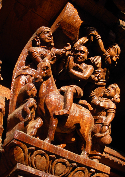 கழுதை மேல் ஆடவர் ஒருவர் அமர்ந்திருக்க, அவரைச் சுற்றி மூன்று பெண்களும் ஒரு சிறுவனும் நிற்கும் காட்சி தேர் ஒன்றிலிருந்து கண்டறியப்பட்டது. சிறிய குடுமியும் தொங்கு மீசையும் சுருக்கிய சிற்றாடையுமாய், 'என்னை மன்னித்து விட்டுவிடுங்கள்' என்பது போல் கைகளைக் கூப்பிய நிலையில் கழுதை மேல் அமர்ந்திருக்கிறார் அந்த ஆடவர். என்ன தவறு செய்தார் என்பது தெரியவில்லை! சுற்றியுள்ள மூன்று பெண்களுள் ஒருவர் கழுதைக்கு முன்னாலும் மற்றவர்கள் பின்னாலும் நிற்கின்றனர். பின்னால் நிற்கும் பெண்களில் ஒருவர் உயர்த்திப் பிடித்த சட்டியிலிருந்து எதையோ (சாணக்கரைசல்?) அந்த ஆடவரின் தலையில் ஊற்றுகிறார். இரண்டாவது பெண் காலியான சட்டி ஒன்றை இடக்கையில் பிடித்தபடி, துடைப்பம் பிடித்திருக்கும் வலக்கையை உயர்த்தி அந்த ஆடவரை அடிக்கும் மெய்ப்பாட்டில் உள்ளார். கழுத்தில் கண்டிகை அணிந்த வலப்புறப் பெண் கையில் கொண்டுள்ள செருப்புப் போன்ற பொருளை ஆடவரின் தலையில் அடிக்குமாறு போலப் பிடித்திருக்கிறார். மேலே நடக்கும் இந்தக் காட்சியைப் பார்த்தவாறு வலப்புறம் வயதில் சிறிய பையன் ஒருவன் நிற்பதைக் காணமுடிகிறது.