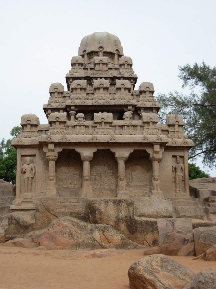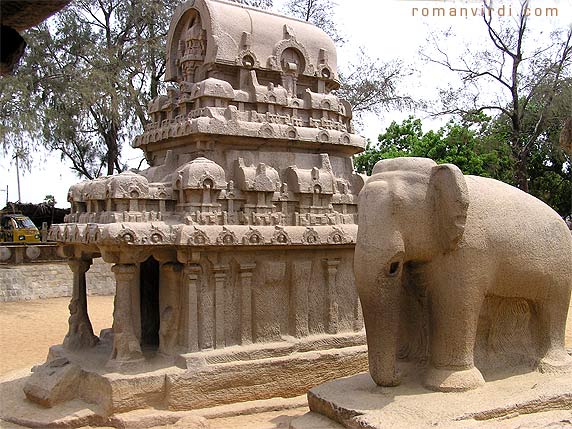 - Published in the 2007 Souvenir of Dwarkalaya, a Socio-Cultural-Charitable organization located in New Delhi Introduction The numerous temples of Tamilnadu built by the Pallava, Chola and Pandya kings and dating back 1500 years, provide us a glimpse into Tamil history. Temples older than these have perished as they were basically built of brick. King Mahendra Varma Pallava (6th Century AD) is credited with constructing the first stone temples. The inscriptions in some of these temples shed light on their importance in ancient Tamil society. Temples often served as a gathering place for people from all walks of life, where important social and political issues could be discussed and debated. They also served as nurturing grounds for the fine arts of painting, sculpture, dance and music. During times of emergency or natural disasters, temples also became make shift hospitals. An analysis of the stone inscriptions and ancient literary works yields a deeper understanding about early Tamil society, politics, geography, agricultural practices, tax systems, customs and traditions. On the basis of their architecture, temples can be classified into three broad types– cave temples, monolithic temples carved out of a single rock, and structural stone temples. One can come across all the three types of temples (Mahishasuramardhini and Varaha cave temples built after the reign of Mahendra, the monolithic five rathas, and also other structural stone temples) at Mamallapuram, which was also referred to as Kadal Mallai in ancient literature. Most of the temples found in Mamallapuram were built by Rajasimha. The five rathas were initially thought to be the work of Mahendra's son Narasimhavarma Pallava. But recent studies have proved that the five rathas were actually built by Rajasimha. In his book titled "Adhyanthakamam", Dr. R. Kalaikkovan, Director of the Dr. M. Rajamanickanar Center for Historical Research, gives detailed evidence that proves that the five rathas were built by Rajasimha. Other temples built by him in and around Kanchipuram, bear testimony to Rajasimha's skill and ingenuity. He experimented widely with various temple architectural concepts and introduced numerous inventions. A study of the temples built by him is in fact a study of the evolution of temple architecture. The Five Rathas The nomenclature of the buildings is unfortunate. They are called rathas (pancha rathas means "five chariots"), and named individually after Draupadi and the Pandava brothers, although they have nothing to do with temple carts or the Mahabharata. It would be better to call them vimanas and just number them 1 through 5, but the popular names have stuck. ![]() Architectural Features Four of the five, namely the Draupadi, Arjuna, Bhima and Dharmaraja rathas, stand in a single row facing west. The fifth Nakula-Sahadeva ratha, faces the south, and stands apart with its side facing the other four rathas. The Draupadi ratha, the first ratha on the premises has a hut styled vimana – the simplest form of vimana, with a square base. The Arjuna ratha is a two-tired temple, with a square section in both the tiers, an octagonal shaped "Griva" (neck) and "Sikara" (head). "Karnakutas" (a hara structure kept at four corners above the roof of the first tier) and "Salas" (in the form of a boat or a bullock cart placed at the center on all four sides), have been introduced in this temple. The "Karnakutas" and the "Salas" above the roof are together called a "Hara". Another innovation in this temple is the lower tier, which starting from the basement is split vertically with projections at equal intervals. These projections divide the structure into compartments called "Bhadras" with depressions in between. ![]() The Bhima ratha is a single-tired structure with a rectangular base. The top portion of the temple is oblong like a tilted boat similar to a "Sala". This type of vimana is called "Sala Vimana". Another innovation in this temple is the modification of "Nasikas". The various forms of "Nasikas", described in the texts are found in this temple. ![]() The Dharmaraja ratha is the tallest of them all with three tiers. The architecture of this temple is also very different from all the other temples. The ground floor of this temple has pillared entrances on all sides. The second and the third tier has Garbhagriha and parapet wall with space in between them. The "Hara" structure in this temple has a new component – the "Panjara", between the "Karnakutas" and the "Salas. The "Panjara" is in the shape of a wagon-top with the longer portion to the sides as opposed to the "Salas" which have the longer portion in the front. ![]() The placement of an elephant next to the Nakula-Sahadeva ratha is significant. One can find similarities between the back of the ratha and the elephant. This type of vimana is called the "Gaja-prishta Vimana" ("Gaja" means elephant and "prishta" means back). This ratha is also two-tiered. On the front side, the "Shikara" of this temple has a miniature replica of the vimana projected out. Rajasimha's innovations add to the beauty of these monolithic structures. Inscriptions In the dharmaraja ratha, above the icons, inscriptions have been carved on the walls. These inscriptions are in the "Pallava Grantha" script. The inscriptions in Dharmaraja ratha contain "birudas" of a king. The similarities between these "birudas", and the ones found in the Kailasnatha temple at Kanchipuram and the Panaimalai temple, both built by Rajasimha, leads one to conclude that the Dharmaraja ratha was also built by Rajasimha. The "birudas" in the Dharmaraja ratha include the Adhyanthakama (one who has endless desires – it was King Rajasimha's main name), Bhuvanabaajana, Narasimha, Mega, Nayanamanohara, Sarvathobhadra, Mahamalla, Ranajaya (one who is victorious in battle, another frequently used title of Rajasimha), Paraapara and Para. Out of these, Adhyanthakama and Ranajaya must have been important "birudas" of the 
