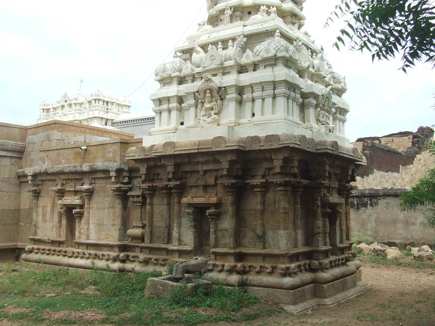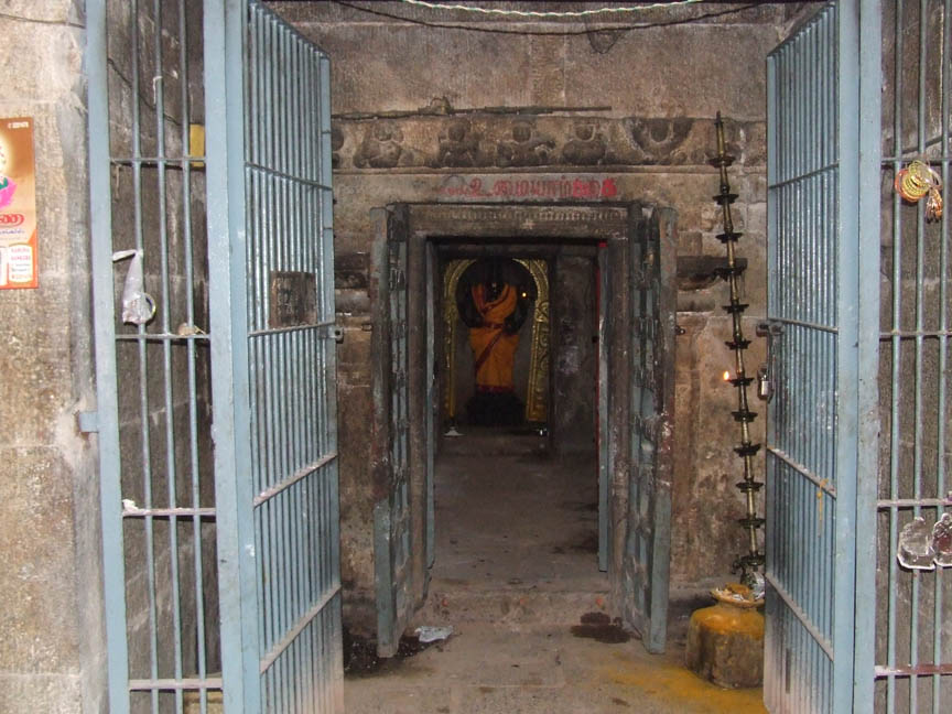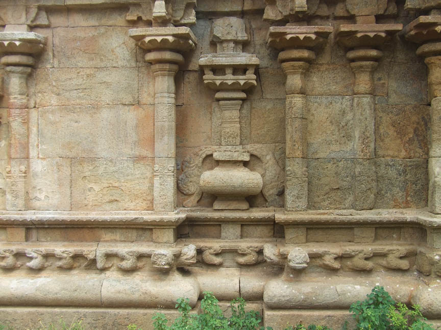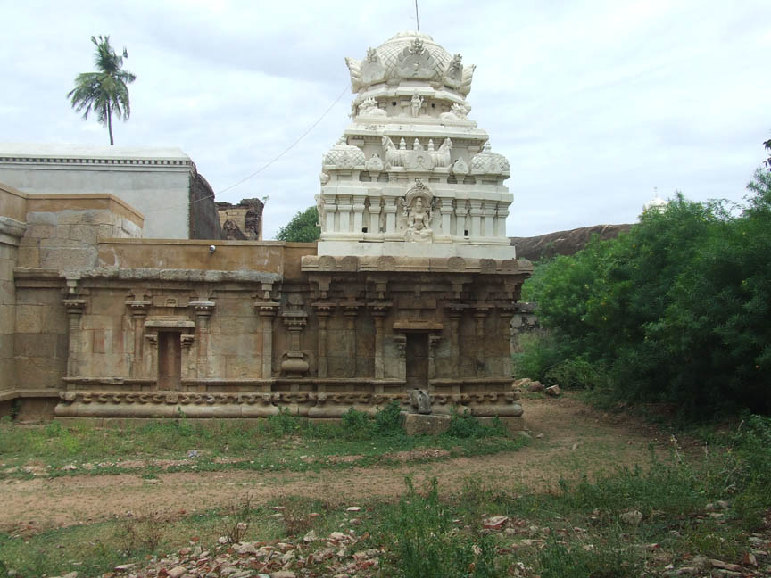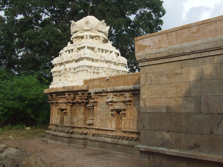 On the northern side of the outer prakara is a shrine for goddess Umayambigai facing south. The shrine consists of a mukhamandapa, ardhamandapa and a sanctum. A tile-roofed structure also adjoins the mukhamandapa in the front. A newly constructed tower crowns the sanctum. ![]() THE SHRINE OF UMAYAMBIGAI Coming to the outer side of the shrine it has a basement of pratibandha type with the components of upoupana, upana as inverted padma, jagadi, rudra kumuda, prativari with projected makaras at the corners and uparikambu. Above the basement raises the wall. In between the adhistana and the wall is the vedika with kambu and vedikanda. Above the vedika is the pattika with urdhuva padma and uparikambu. This symmetry also extends for the outer wall of ardhamandapa. ![]() THE EASTERN SIDE VIEW OF THE SHRINE Above the vedika raises the wall. The entire vimana is parted as three segments called the patthis, which also extends to the upper tiers of the vimana. The corner patthis are called the karnapatthis, which are similar in size. In between the karnapatthis is the projected sala patthi, which is little bigger than the corner one. The sala bhadra hosts a niche whereas it is absent in the karnapatthis. In the sala bhadra in between the middle two pilasters houses a koshta in the center flanked by split pilasters. The sala koshta is depicted as a shrine but it is empty. ![]() THE REAR VIEW OF THE SHRINE The wall is adorned with six ornate pilasters with a square base and nagabanda in the corners. Above the square raises the vishnukanta shaft with the upper parts of kattu, kalasa, tadi, kudam, pali, palakha and veerakanda. But the split pilasters of the koshta are having a square base and a rudra shaft with the same upper features. The uttira, vajana and kapota with kudu arches form the roof parts. Above the roof is the bhumidesa, griva, shikara and stupis. ![]() THE WESTERN SIDE VIEW OF THE SHRINE As for the pilasters the potikas are madalai in style with the spout like nanudal extending on sides. The madalais support the uttira above. Vajana, valabhi and kapota are the other roof parts. The valabhi is adorned with bhutavari and kapota with kuduarches. Above the kapota is the later constructed two tier vimana with dravida shikara. ![]() THE KUMBHAPANJARA In between the sanctum and ardhamandapa is a recess where Kumbhapanjara is shown. Above the pot shaped kumbha raises the pilaster with usual upper parts. On either side of the kumbha are the festoons. The roof portion of kapota with kudu arches and bhumidesa is seen. Above the bhumidesa is the griva and shikara. On the eastern side of the sanctum wall a water outlet for sanctum water, a spout like extension is seen. Under the spout a square shaped stone cistern is kept to collect the water. Like the sanctum wall, four pilasters and a koshta in between the middle pilasters adorn the wall of ardhamandpa. The features of pilasters and koshta and the roof structures are same as like the sanctum. The interesting feature to note in this shrine is the bhutavari. Both male and female ganas are seen in the series. Most of them are musicians with string, blowing and percussion instruments. Some are also in dancing posture. Conch, drum, damaru are the instruments found. They are shown in ecstasy. ![]() THE INNER VIEW OF THE SHRINE Coming to the inner side of the shrine the sanctum is cubical in shape with .78 mts in east west and .77 mts in north south direction. Uttira, vajana and valabhi are the roof parts shown in the wall. The roof of the sanctum is hallowing. The sanctum houses goddess Umayambigai. The deity is also known as Manjalnayaki. The goddess is standing in sama on a circular pedestal with jatamakuta and back right hand holding lotus and left hand holding nilotpava. The front hands are in abhaya and varada. The makarakundalas adorns the elongated ears, a necklace of pointed droplets (arumbucharam) adorns the neck. The goddess is wearing only a lower garment of silk dress with knots flanking on the sides. The rectangular ardhamandapa is .78 mts in east west and 1.37 mts in north south direction. The front wall of the ardha mandapa has parts of basement components with split pilasters flanking the entrance. The split pilasters possess the same features of outer wall pilasters. The door frames are cut little inside the entrance. The jambs are decorated as lotus petals. The roof portion of uttira, vajana and valabhi with bhutavari are seen. This shows that once the temple was simply with a sanctum and ardhamandapa to which the pillared mandapa is later added. ![]() THE MUKHA MANDAPA The mukha mandapa is a pillared hall with structural wall enclosure on east and west. Two rows of three pillars in the middle are seen. Front two pillars are decorative with square base and nagabanda adorning the corners. Apart from this there are two other upper squares with Indrakattu in the middle. The squares are adorned with miniatures and medallions. The rest of the pillars are plain with three squares and two kattus in the middle. The potikas above the pillars are vettu and taranga in style. The potikas holds the uttira, vajana and valabhi joining the roof of the mandapa. The roof of the mandapa is covered with roof slabs. ![]() THE SUBRAMANIA SHRINE ABOVE THE HILLOCK To the south west of the rock cut shrine in the apex of the hillock is a structural shrine for Lord Muruga. The shrine consists of a sanctum and mukhamandapa. Without proper basement components the structure raises as a wall cantoned by pilasters on all sides. The brahmakanta pilasters possess the usual upper parts. Above the pilasters is the vettu potika holding the uttira. And the other roof parts are the vajana valabhi and kapota with rough kudu arches. A newly constructed nagara tower crowns the sanctum. ![]() THE SIDE AND FRONT VIEWS OF THE SHRINE ![]() A flight of seven steps leads us to the mukhamandapa. The six faced Muruga is seated in suhasana on a peacock, karandamakuta with chenni adorns
