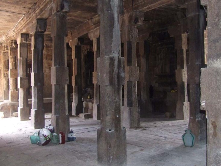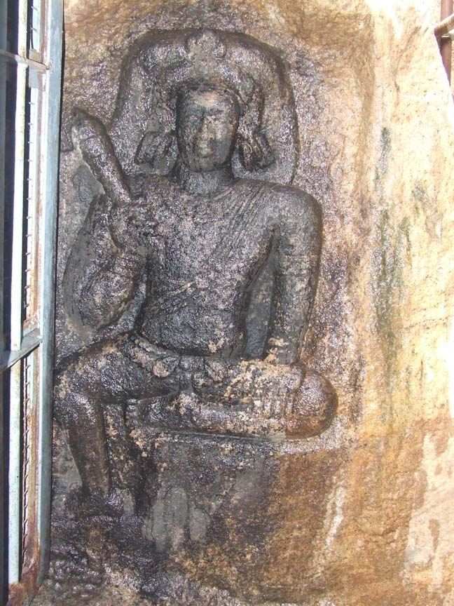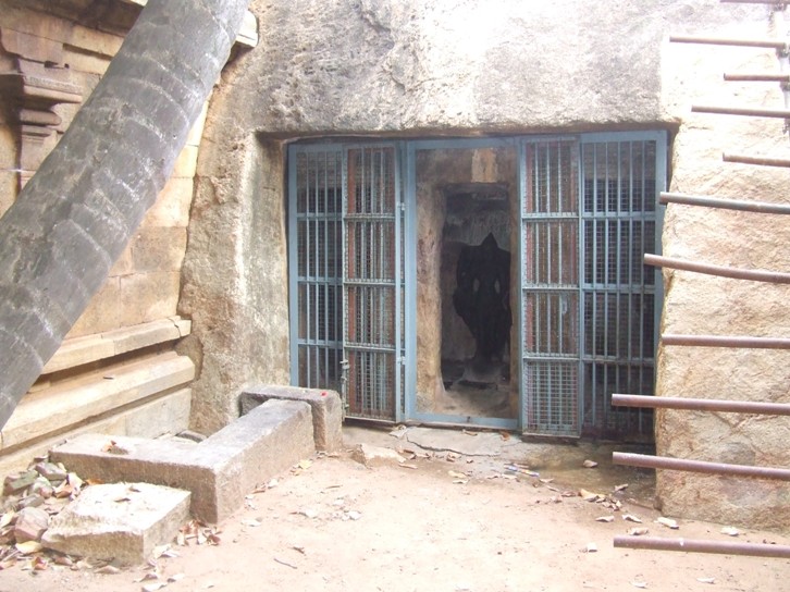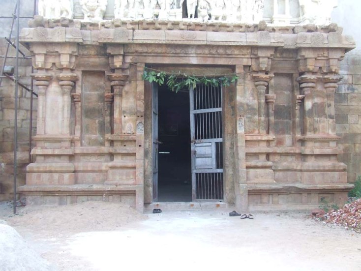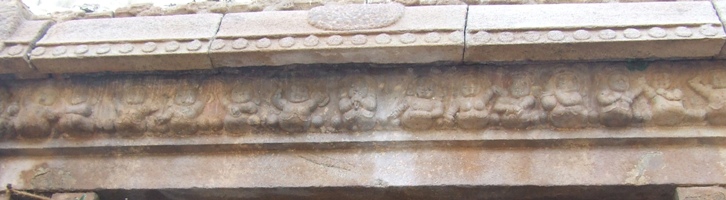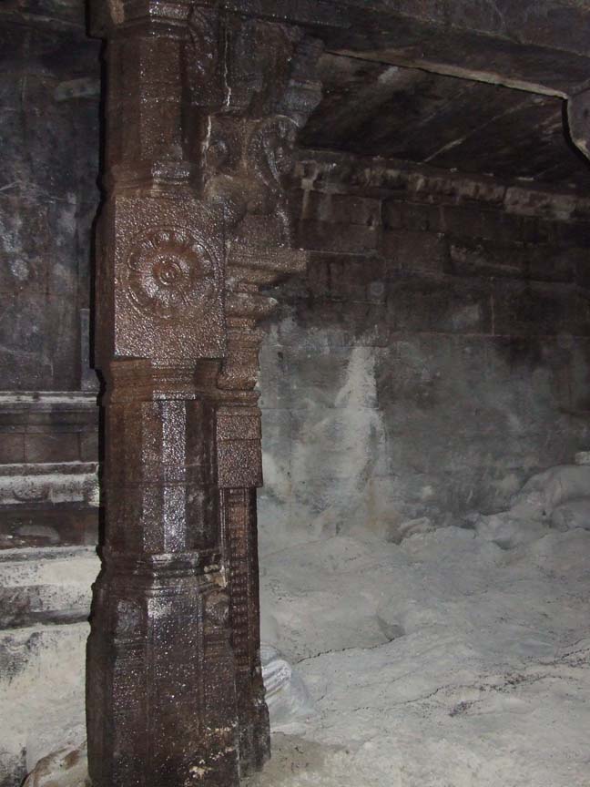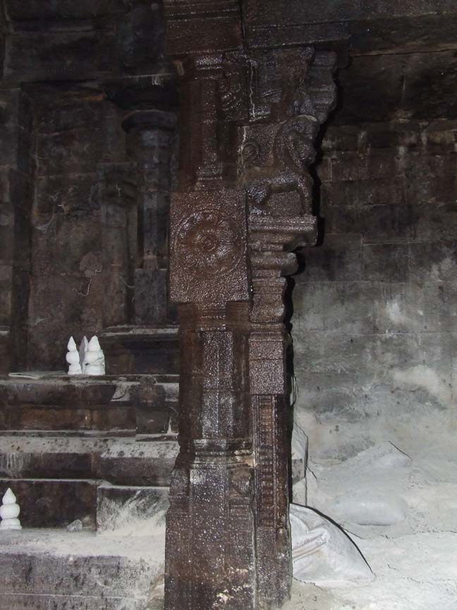 A gopura with entrance in the middle leads us to the inner prakara. On either side of the gopura a huge compound wall extends to the north and the south and turns towards the west and adjoins the mother rock. The wall does not end adjoining the mother rock instead it elevates above the hillock as a fence around the rock cut temple. It also forms the ambulatory wall of the inner prakara. ![]() THE GOPURA The two-tier gopura is of sala type. In order to raise the height of the structure, it has a two-storied basement. The upapitha forms the lower basement and above it raises the formal basement. The characteristic feature of this gopura basement is variations shown in the divisions. The gopura is divided into three projected segments as Karna patthis on both ends and salabhadra with entrance in the middle. In between the sala and karna patthis are shown the niches. The gopura has vargabedha adhisthana. The karna patthis have kapotabandha adhisthana where as the sala bhadra is adorned with padabandha adhisthana. ![]() THE GOPURA The kapotabandha adhisthana of karna patthis starts with jagadhi, octagonal kumuda, gala complex and kapota with kudu arches and yazhi vari, whereas the components of padabandha adhisthana are upana as inverted padma, jagadhi, rudra kumuda, gala complex and pattika. On either side of the rudra kumuda is the padmavari. Miniature sculptures of yazhi are shown in the kanda of recessions. ![]() MINIATURES Above the adhisthana is the vedika with vedikanda and vedika proper. The component of karnapatthis is decorated as urdhva padma whereas it is shown as kapota with kudu arches in the sala section. Above the vedika raises the wall with six pilasters, two pilasters adorns each section. The pilasters possess a square base with nagabandha in the corners and scrolls on its faces. Above the base raises the vishnukanta shaft with the usual upper elements from mala to veerakanda. An interesting feature to note on the northern karnapatthi pilasters are the micro bas-relief figures carved on the stana portion of the pilasters. The corbels above the pilasters are vettu and taranga in style. The hands of the corbels rise above to hold the roof elements. The valabhi is adorned with bhutavari and the kapota with kudu arches. Provision is also left for kodikarukku in the corners. Some of the kudus are unfinished and the festoons are not shown flowing from the makara heads in the yazhi vari. Above the kapota is the bhumidesa with yazhi vari. The ridge of the kapota is adorned with canda mala. ![]() MINIATURES IN THE PILASTERS As concerned with the split pilasters of the niches possess the rudra shaft with same ornamental upper features. Above the palakha the virakanda bears the lintel. The middle pair of pilasters flanking the entrance in the sala section are simply brahmakanta in type. On both the pilasters miniature sculptures of Ganesa and Bhairava are seen. To the right of the entrance is Ganesa in dancing posture and to the left of the entrance is the Bhairava in standing posture. Bhutagana another miniature figure is seen to the right of Ganesa in the wall section. The doorframes are cut little inside the entrance, which has huge wooden doors. ![]() BHUTAVARI The bhutavari in the gopura is an interesting feature to note. Unlike the usual depiction of bhutaganas with musical instruments here they are mostly depicted in fighting posture with weapons like sword and shield. Both male and female are seen. Some are with musical instruments like string, conch and cymbals. Apart from the bhutas miniatures of Krishna with flute and animal figures listening to his music, linga with cow are also seen. Above the roof is the newly constructed tower of sala gopura. ![]() THE THIRUCHUTTRU MALIGA IN THE SOUTH WEST The entrance in the middle of the gopura leads us to the inner prakara. It is a pillared hall with the ambulation on east, north and south. The Thiruchuttru maliga starts with the gopura and run a few yards on the south and turn towards west and ends adjoining the mother rock. The ambulatory portion has a raised platform, which is shown as an additional basement above which raises a row of pillars in the facade. Except the first pillar near the gopura all the other pillars are simple with squares at ends and middle and kattu in between the squares. The potikas above these pillars are angular with vettu and taranga and holds the beam, which is shown as uttira, vajana and valabhi. ![]() THE DECORATIVE PILLAR IN THE SOUTHERN AMBULATION ![]() The first pillar seen near the gopura is the only ornate pillar of southern ambulation. It bears the name of the sponsor. An interesting feature to note in this pillar is that a messy attempt is seen on its apex. It is a double pillar with one portion shown as squares and kattus whereas the adjoining pillar with ornate features. Instead of three squares only two is seen with regular intervals. The third square that is partially visible on the top is arranged on an irregular interval. It is clear that the upper square is altered as kattu. This may have happened due to some miscalculation by the sculptor. The adjoining pillar has a brahmakanta shaft with the ornate upper features. The shaft is decorated with miniature carvings. Above the palakha a lion is shown standing by bearing the potika on its head. The potika is also unfinished to which only the nanudal is visible. The ambulation in the south has three rooms in it. The room that found on the southeast corner might be the kitchen. Both on the east and west stairs arrangement to this ambulation is found. Unlike the southern side the pillared mandapa on the north has an uncovered muddy space left out for garden and a huge jack tree occupying it. The pillared mandapa is not left open whereas iron gates enclose it. The thiruchuttru malika is shown both on the mandapa portion and the garden portion. The thiruchuttru malika shown within the mandapa occupies a vast area with two rooms facing south. It end