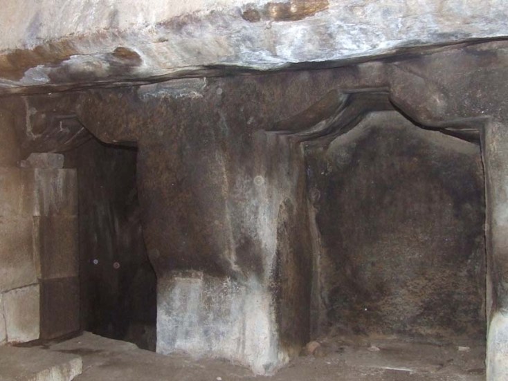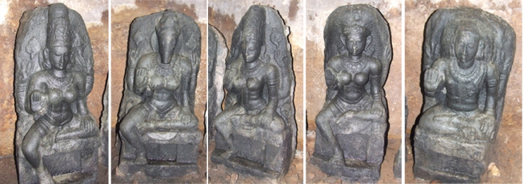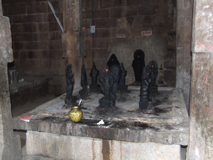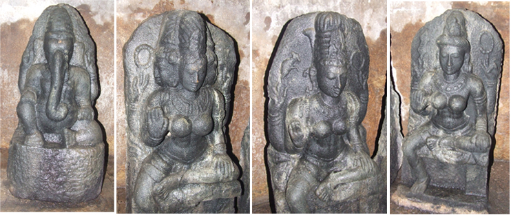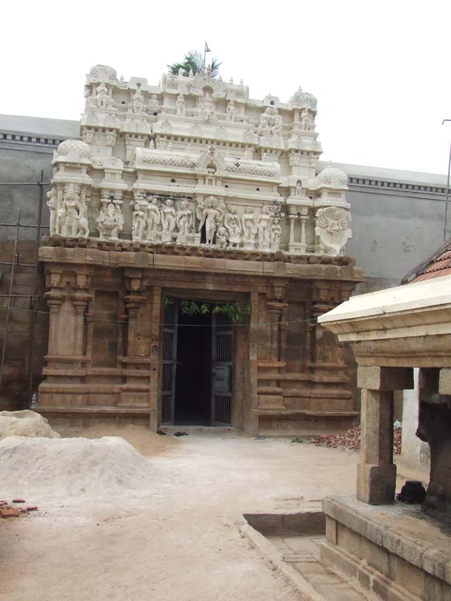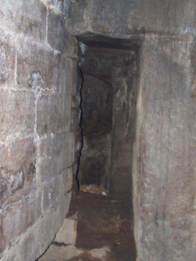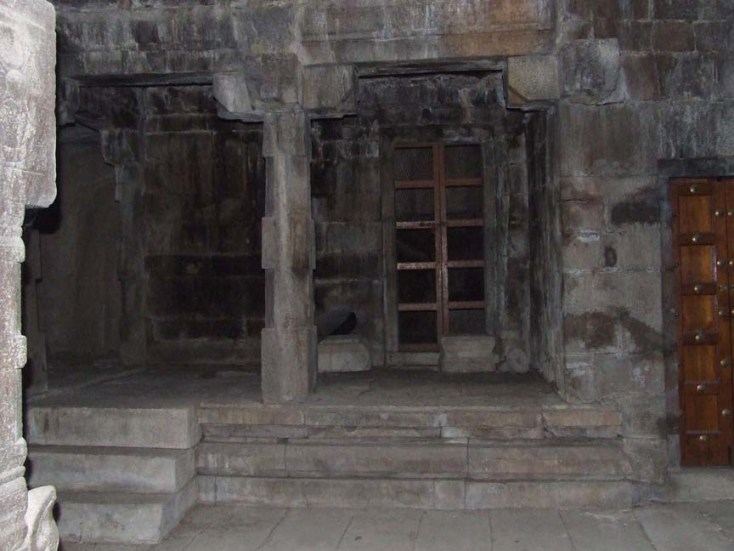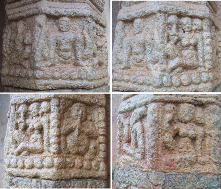 A gopura with entrance in the middle leads us to the inner prakara. On either side of the gopura a huge compound wall extends to the north and the south and turns towards the west and adjoins the mother rock. The wall does not end adjoining the mother rock instead it elevates above the hillock as a fence around the rock cut temple. It also forms the ambulatory wall of the inner prakara. ![]() THE GOPURA The two-tier gopura is of sala type. In order to raise the height of the structure, it has a two-storied basement. The upapitha forms the lower basement and above it raises the formal basement. The characteristic feature of this gopura basement is variations shown in the divisions. The gopura is divided into three projected segments as Karna patthis on both ends and salabhadra with entrance in the middle. In between the sala and karna patthis are shown the niches. The gopura has vargabedha adhisthana. The karna patthis have kapotabandha adhisthana where as the sala bhadra is adorned with padabandha adhisthana. ![]() THE GOPURA The kapotabandha adhisthana of karna patthis starts with jagadhi, octagonal kumuda, gala complex and kapota with kudu arches and yazhi vari, whereas the components of padabandha adhisthana are upana as inverted padma, jagadhi, rudra kumuda, gala complex and pattika. On either side of the rudra kumuda is the padmavari. Miniature sculptures of yazhi are shown in the kanda of recessions. ![]() MINIATURES Above the adhisthana is the vedika with vedikanda and vedika proper. The component of karnapatthis is decorated as urdhva padma whereas it is shown as kapota with kudu arches in the sala section. Above the vedika raises the wall with six pilasters, two pilasters adorns each section. The pilasters possess a square base with nagabandha in the corners and scrolls on its faces. Above the base raises the vishnukanta shaft with the usual upper elements from mala to veerakanda. An interesting feature to note on the northern karnapatthi pilasters are the micro bas-relief figures carved on the stana portion of the pilasters. The corbels above the pilasters are vettu and taranga in style. The hands of the corbels rise above to hold the roof elements. The valabhi is adorned with bhutavari and the kapota with kudu arches. Provision is also left for kodikarukku in the corners. Some of the kudus are unfinished and the festoons are not shown flowing from the makara heads in the yazhi vari. Above the kapota is the bhumidesa with yazhi vari. The ridge of the kapota is adorned with canda mala. ![]() MINIATURES IN THE PILASTERS As concerned with the split pilasters of the niches possess the rudra shaft with same ornamental upper features. Above the palakha the virakanda bears the lintel. The middle pair of pilasters flanking the entrance in the sala section are simply brahmakanta in type. On both the pilasters miniature sculptures of Ganesa and Bhairava are seen. To the right of the entrance is Ganesa in dancing posture and to the left of the entrance is the Bhairava in standing posture. Bhutagana another miniature figure is seen to the right of Ganesa in the wall section. The doorframes are cut little inside the entrance, which has huge wooden doors. ![]() BHUTAVARI The bhutavari in the gopura is an interesting feature to note. Unlike the usual depiction of bhutaganas with musical instruments here they are mostly depicted in fighting posture with weapons like sword and shield. Both male and female are seen. Some are with musical instruments like string, conch and cymbals. Apart from the bhutas miniatures of Krishna with flute and animal figures listening to his music, linga with cow are also seen. Above the roof is the newly constructed tower of sala gopura. ![]() THE THIRUCHUTTRU MALIGA IN THE SOUTH WEST The entrance in the middle of the gopura leads us to the inner prakara. It is a pillared hall with the ambulation on east, north and south. The Thiruchuttru maliga starts with the gopura and run a few yards on the south and turn towards west and ends adjoining the mother rock. The ambulatory portion has a raised platform, which is shown as an additional basement above which raises a row of pillars in the facade. Except the first pillar near the gopura all the other pillars are simple with squares at ends and middle and kattu in between the squares. The potikas above these pillars are angular with vettu and taranga and holds the beam, which is shown as uttira, vajana and valabhi. ![]() THE DECORATIVE PILLAR IN THE SOUTHERN AMBULATION ![]() The first pillar seen near the gopura is the only ornate pillar of southern ambulation. It bears the name of the sponsor. An interesting feature to note in this pillar is that a messy attempt is seen on its apex. It is a double pillar with one portion shown as squares and kattus whereas the adjoining pillar with ornate features. Instead of three squares only two is seen with regular intervals. The third square that is partially visible on the top is arranged on an irregular interval. It is clear that the upper square is altered as kattu. This may have happened due to some miscalculation by the sculptor. The adjoining pillar has a brahmakanta shaft with the ornate upper features. The shaft is decorated with miniature carvings. Above the palakha a lion is shown standing by bearing the potika on its head. The potika is also unfinished to which only the nanudal is visible. The ambulation in the south has three rooms in it. The room that found on the southeast corner might be the kitchen. Both on the east and west stairs arrangement to this ambulation is found. Unlike the southern side the pillared mandapa on the north has an uncovered muddy space left out for garden and a huge jack tree occupying it. The pillared mandapa is not left open whereas iron gates enclose it. The thiruchuttru malika is shown both on the mandapa portion and the garden portion. The thiruchuttru malika shown within the mandapa occupies a vast area with two rooms facing south. It end