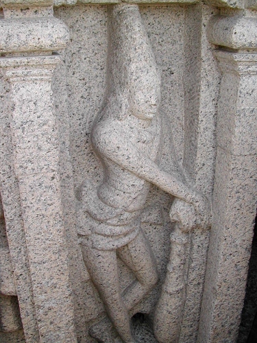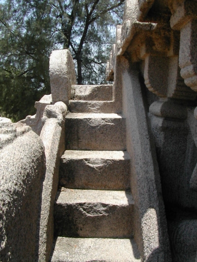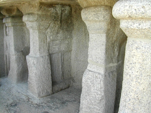 அத்யந்த காமமாகிய இராஜசிம்மன் இரதம் குறுகிக்கொண்டே செல்லும் மேற் தளங்களை கொண்டது என்பது பார்த்தவுடன் விளங்கும். ஆக மூன்றாவது விமான தளத்தின் நீள அகலங்கள் கீழே அமைந்துள்ள தளங்களைவிட மிகக் குறைவு. நான்காவது தளத்திலோ சுற்றுப்புறப்பாதையே இல்லை - நேராக கீரீவம் சிகரம்தான் ! ![]() மகரப் படிக்கட்டுகள் - இரண்டாம் தளம் முதல் தளமான ஆதி தளத்திலிருந்து இரண்டாம் தளத்திற்குப் படிகள் இல்லை. அதனால் ஏணி உபயோகித்து ஏறும்படி ஆகிவிட்டது. ஆனால் இரண்டாம் தளத்திலிருந்து மூன்றாம் தளத்திற்கு அருமையான படிக்கட்டுகள் உண்டு. மகரத்தின் வாயிலிருந்து உமிழப்பட்டவைபோல் இப்படிக்கட்டுகள் அமைக்கப்பட்டுள்ளன. ![]() முழுமை பெறாத கருவறை - இரண்டாம் தளம் அத்யந்த காமத்தின் சிற்பிகள் முதல் மூன்று தளங்களிலும் மூன்று கருவறைகள் அமைக்கும் உத்தேசத்துடன் இரதத்தை வடிவமைத்தனர். துரதிருஷ்ட வசமாக முதல் இரண்டு தளங்களிலும் கருவரையை வடித்து முடிக்கவே முடியவில்லை ! ஆனால் மூன்றாவது தளம் அதிருஷ்டவசமாக முழுமையடைந்த கருவரையைத் தன்னகத்தே கொண்டுள்ளது. ![]() கருவறை சோமாஸ்கந்தர் - மூன்றாம் தளம் பொதுவாக பல்லவர் காலக் கோயில்கள் பலவற்றிலும் கருவறையில் லிங்க வடிவத்தின் பின்புறம் சோமாஸ்கந்தர் வடிவத்தை அமைப்பது மரபு. ஈசனுக்கருகில் உமை அமர்ந்திருக்க இருவருக்குமிடையில் குமரக்கடவுள் அருள்புரியும் வடிவம்தான் சோமாஸ்கந்தர். நமது அத்யந்த காமத்தில் இந்த வடிவத்தில் ஒரு புதுமையைப் புகுத்துகிறான் சிற்பி. குமரன் இருவருக்குமிடையில் அமராமல் உமையின் மடியிலேயே சிறு குழந்தையாய் அமர்ந்திருக்கிறான். உமையும் நேராக அமராமல் சற்று ஒருக்களித்தவாறு அமர்ந்து ஒரு பக்கமாக அவனை அணைத்துக் காட்சி தருகிறாள். தெய்வத் தம்பதியரின் இரு பக்கங்களிலும் பிரமனும் திருமாலும் கைகளை உயர்த்தி வாழ்த்துகிறார்கள். கடினமான பாறையின் இயல்பையும் தாண்டி ஈசன் முகத்திலிருந்து வெளிப்படும் பூரிப்பை இரசிக்கலாம். ![]() கருவறை சோமாஸ்கந்தர் தொகுதி ஈசர் - மூன்றாம் தளம் கருவரையில் முற்காலத்தில் அமைக்கப்பட்ட லிங்கத் திருமேனி தற்போது இல்லை - ஆனால் அதனை வைப்பதற்கு வெட்டப்பட்ட குழியும் அபிஷேக நீர் செல்வதற்கு அமைக்கப்பட்ட பாதையும் தெரிகின்றன. கருவரைக்கு வெளியே இரு பக்கங்களிலும் வாயிற் காவலர்கள். அவர்களில் ஒருவர் சற்றே முன்சாய்ந்து ஒரு காலை மடித்து தனது கதையின்மேல் வளைந்தவாறு நிற்கும் பாங்கு இருக்கிறதே... அடடா - மிக மிக இயல்பான தோற்றம். ![]() கருவறை வாயிற்காவலர் - மூன்றாம் தளம் இந்த வாயில்காவலர் பற்றி டாக்டர் கலைக்கோவனின் "அத்யந்த காமம்" புத்தகம் என்ன சொல்கிறதென்று ஒரு நிமிடம் உற்றுக் கேட்போமா ? "வாயிலின் வலப்