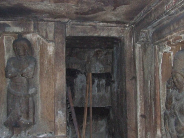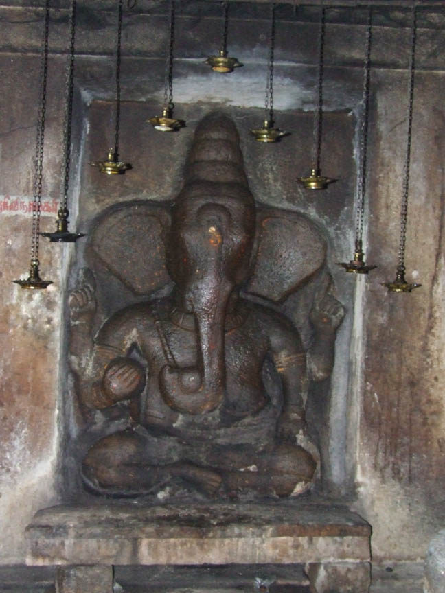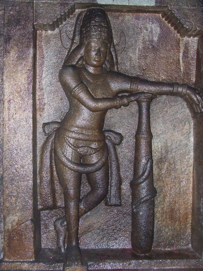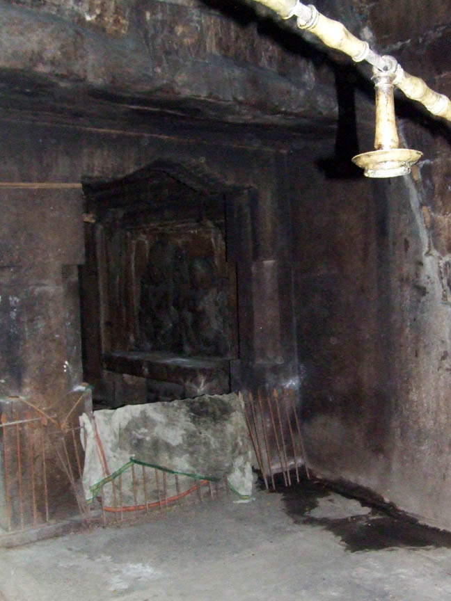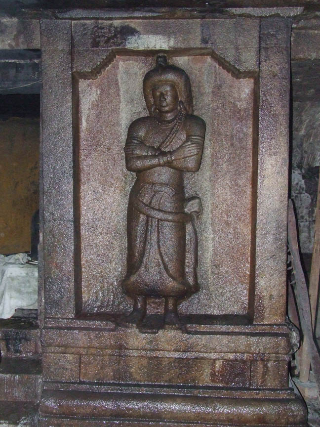 The rock cut cave styled as Parvatagirisvara houses the deity Thirukundrakudi Madevar. Through epigraphical evidences we can prove the cave belongs to 9th century A.D. It is the nucleus around which many later additions of diversified architectural elements were made in the subsequent eras. This forms the temple as a multifaceted complex. ![]() THE VIEW OF THE CAVE The central cave consists of a facade, a rectangular mukha mandapa and a cubical sanctum. In front of the rock cut cave is a pillared mandapa with wall enclosures. The wall enclosure of the pillared mandapa has a padabanda basement and above it raises the wall with brahmakanta pilasters. A door entrance is seen in the middle flanked by pilasters on either side. Two dvarapalas one on each side is seen in front of the entrance. The brahmakanta pilasters possess usual upper parts and potikas of vettu taranga type. The usual roof components are seen. This wall enclosure ends adjoining the mother rock on both sides. ![]() THE FRONT VIEW OF THE CAVE The door entrance leads us to the front mandapa. Totally there are seven massive pillars in this mandapa. Among the seven, five are simple with three squares and indrakattu in between the squares. Nagabanda is shown on the four corners of the lower square and padmakattu is shown above and below the indrakattu. Floral medallions are seen in some pillars. Potikas are decorative with madalai and nanudal. The remaining two are very ornate double pillars with one portion as squares and kattus and the other portion as brahmakanta shaft with ornate upper parts. The palakha has ornamental hangings in the corners. The corbels above the pillars are madalai with nanudal that bears the beam. The presence of nagabanda fixes the period of the mandapa beyond 12th cen. A.D. In the middle of the mandapa is balipitha and nandi facing sanctum. On the northern side of the mandapa a closed provision is made around the corner pillars to preserve the bronze icons. ![]() THE FRONT VIEW OF THE CAVE The original cave starts with the facade. The facade consists of two pillars in the middle and two pilasters each one in the corners. The facade measures 5.46 mts in north south direction and .59 mts in east west direction and it has a floor height of .07 mts. The mother rock extends .96 mts in the front as kapota and the canopy of the kapota is flat. The mother rock extends 1.63 mts in the south and 1.55 mts in the north. The three anganas formed between the pillars and pilasters measures 1.43mts each. The pillars and pilasters are massive with squares on the edges and octagonal kattu in the middle. Comparing with the upper square the lower square is little higher. The potikas are taranga in style with central band in the middle. On the faces of the potikas above the tarangas thin line arches are shown. The central arch is designed as a scroll. The heavy corbels bear the uttira above. The thin vajana runs only for the roof and not on the sides. ![]() THE SOUTHERN LATERAL WALL ADORNED WITH GIANT GANESA The rectangular mukha mandapa is 6.55 mts in north south direction and 3.23 mts in east west direction. The lateral walls of the mukha mandapa are occupied by bas-relief sculptures. On the southern lateral wall a niche is formed to a height of 1.96 mts, width of 1.41 mts and depth of .42 mts to house a giant size Ganesa. The valamburi vinayaga is in seated posture with back left hand holding the tusk and the back right hand a bud whereas the front right hand is holding a big motaka and the left hand is holding the edge of udarabanda tied on the abdomen. Karanda makuta adorns the head, charapali, armlets and bangles are the ornaments found. The thick yajnopavita runs from right to left. On either side of the lateral wall pilasters with taranga potikas are seen. ![]() THE SHRINE IN THE NORTHERN LATERAL WALL Another interesting feature of this rock cut cave is the bas-relief sculpture of the northern lateral wall. A rare bas-relief sculpture of Siva and Parvati occupies the northern lateral wall, which has no replication in any caves. The northern lateral wall niche is 1.92 mts height, 1.35 mts width and .14 mts depth. It is cantoned by brahmakanta split pilasters. Potikas are shown on the inner side above the pilasters, which are taranga in style. The potikas hold the uttira and vajana above. Unlike the southern niche the northern niche is decorated as a shrine. It has a basement of padabanda type, wall portion of pilasters on sides and roof portion of uttira, vajana and kapota. The basement features are jagati, rudra kumuda, kandapada enhanced by kambu on both sides and pattika. The upper surface of the pattika serves as the floor for the seated deities. Above the kapota, the bhumidesa is shown with alinga and anthari. Vajana runs through out the cave. According to Dr. R.Kalaikovan the presence of a shine in the lateral wall of the mandapa is a rare phenomenon. Both in front of the northern and southern lateral wall niches a balitala is seen. ![]() THE BAS RELIEF SCULPTURE OF SIVA AND PARVATHI The panel consists of Siva, Parvati in seated posture and a maid standing on the side of the goddess. Siva seated in lalitasana with front left hand on the thigh and right hand holding the yajnopavita on the chest. The head is decorated as jatamakuta with headband, crescent moon on left side and skull on the right side. The loose tresses are seen on both sides. The left back hand holds a single lock, whereas the right hand is holding an axe. Patrakundala, charapali, beads bangles, and armlets are the ornaments worn by the deity. The yajnopavita is thick and worn from right to left. Parvati seated in same asana to the left of the God with the right hand holding a bud and left hand on the thigh. The head is adorned as jatabara with central band, patrakundala, charapali, kandigai, armlet and anklet are the ornaments adorn the goddess. The armlet is different with a flat central face and the bangles are with beads. For both of them dre