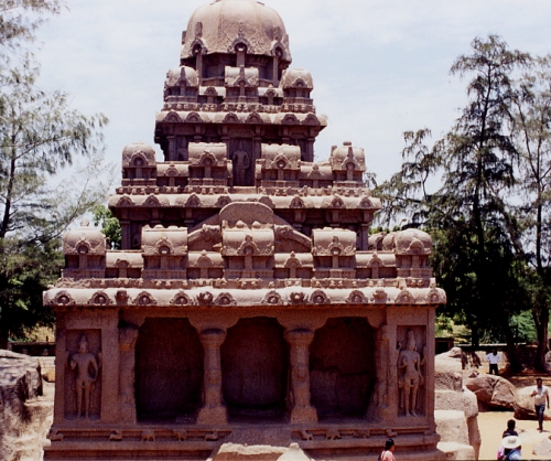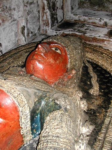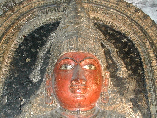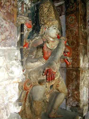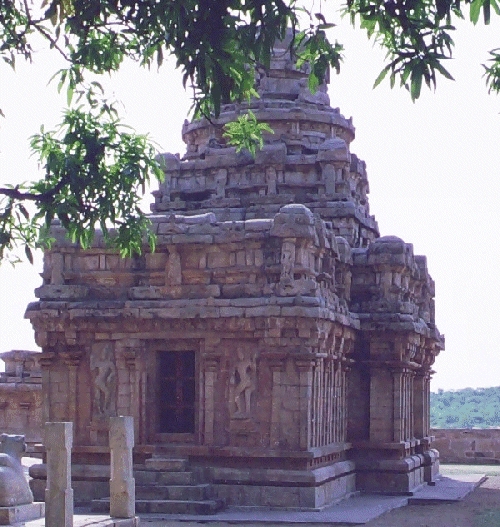 Usually, most types of vimaanas or temple towers raise over and above the four walls that surround the sanctum sanctorum (Garba griha). The Saanthaara vimana is a special type of vimana, in which an outer ambulatory wall is constructed around the garbagriha and the overall vimana is made to rest on two parallal walls instead of one. This arrangement enables the temple architects to extend the overall base area that is available for the vimana. It also helps to distribute the heavy load of vimana on to the floor - using eight walls instead of four walls. In such an arrangement, the gap that is in between the outerwall and the inner wall of the garba griha becomes a circumbulatory passage for the devotees to go around the inner garbagriha. For convenience, we will call the outer wall as the ambulatory wall and the inner wall as garba griha wall. The ambulatory wall should be clearly distinguished from the generic temple enclosure - which surrounds, not just the garbagriha, but the whole temple complex. ![]() Figure - Saanthara Vimana - General Arrangement One of the earliest examples of saanthara vimana construction attempts that survives till date, can be found at Adhyantha kaama parameswara gruham - better known as the Dharmaraja ratha - of mahamallapuram(1). While the aadhi thala structure of this fine rockcut monolith was never completed, attempts to carve out a circumbulatory passage can be seen on the eastern side of the temple. ![]() Figure - Adhyantha kaamam(Dharmaraaja Ratha) of Mahamallapuram - Efforts to carve out a passage visible in aadhi tala Though such a garba griha construction never became a popular choice of ancient artisans, we do see some marked attempts in places like Kanchipuram (Kailaasanatha and Vaikuntha perumal temples), Thiruppattur (Kailaasanatha temple), Uttiramerur (Sundareswara Temple) and Naarthamalai (Vijayalaya choleeswaram). While the Kanchipuram and Thiruppattur temples were conceptions of Pallava artists, the Naarthamalai temple came out of Muttaraiyar Shilpis. ![]() Figure - Naarthamalai Vijayaalaya choleeswaram. Garbagriha is circular in shape Focussing on specific constructional details of these ambulatory and inner walls, one finds a wide variety of styles being adopted in different places. The inner wall that constitutes the garba griha has atleast one major opening - usually along the eastern direction, so as to provide a view of the main diety. It may or may not have openings - windows or doors - in the other three directions. Similarly, the outer ambulatory wall also has atleast one main opening along the eastern direction - laid symmetrical with the opening on the inner wall. But, unlike garbagriha, it is usually provided with windows and/or doors on all the other three directions, in order to provide ventilation and light to the circumbulatary saantaaram passage. When the inner sanctorum wall as well as the ambulatory wall has door openings on all the four directions, it becomes possible to view the enshrined deity from all the four directions. The Saanthaara Vimana of Raajarajeeswaram and the Circumbulatory passage Raajarajeeswaram, the pinnacle of Chola architecture and the monumental project undertaken by Rajaraja-I the great under the architectural leadership of Kunjara Mallan alias Raajarajap Perunthachchan is bestowed with a saanthara vimaana. The circumbulatory passage that runs between the ambulatory wall and garba griha has attracted international attention because of the Chola era paintings, painted along the lengths and breadths of the walls - on either side. The passage also has three huge icons in all the three directions except east, where the great imposing linga - aptly termed as Raajarajeeswaram udaiya paramaswamin (now called Thanjai Peruvudaiyar) - can be viewed by the devotees. Our focus in the paper, is on these three icons. The ovarall architectural arrangement of the saanthara vimana with its icons represents certain unique aspects that are not seen anywhere else in the country. Infact, Raajarajeeswaram temple - as a whole - boasts many such unique icons and architectural aspects that have been analyzed to some extent in the available treasies. The overall arrangement of garbagriha and circumbulatory passage is represented in the figure below : ![]() Figure - Garba griha and circumbulatory passage architecture of Raajarajeeswaram. Courtesy - Pierre Pichard As shown, the width of passage itself is relatively small when compared to the width of garba griha wall or ambulatory walls. The astounding thickness of these walls is truly justified by the imposing 216 feet srivimana which they have to support. The walls on either side that make up the ambulatory passage are divided equally in all directions and massive paintings adorn the walls. The icons are aligned with the inner wall and are located at the centre of the passage , in each of the three directions. There are three big door openings (or Thiru vayils) flanked by two dwara paalakas (4) - in the center of outer ambulatory wall, in each of the three directions. The icons are located just behind these openings. Thus, if the doors are kept open, these icons can be seen from the outer prakaara. ![]() Figure - Dwarapaalakas or Ayudha bheras on the southern door of Saantharam opening However, one also has to take note of the absense of stone steps in all the three directions. Thus, it is evident that the three openings on the ambulatory wall were not meant to be accessed on a regular basis by one and all. Whether they were meant for special access on certain occations or just meant to provide better light into the circumbulatory passage - we are not sure. Circumbulatory Passage Iconography The passage of Raajarajeeswaram has the following icons - located one in each direction. * A massive stone sculpture - possibly a fierce representation of shiva - on the centre of southern facade, facing south * A massive stone sculpture of dancing shiva, fully painted - on the centre of 