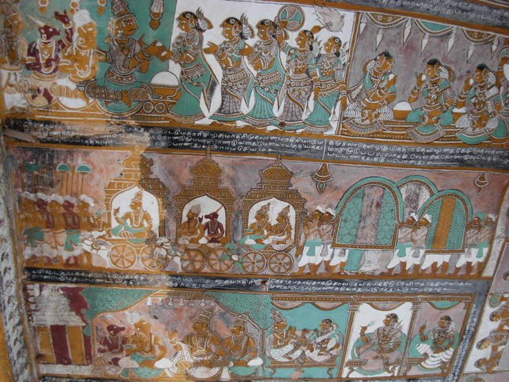 மதுரை மாவட்டத்தின் பெருமைக்குரிய கோயில்களுள் ஒன்று அழகர்கோயில். இயற்கை வளம் சூழ்ந்த இக்கோயிலில் நாளும் மக்கள் திரள்தான். தமிழ்நாட்டின் ஒரே தூய வேசர விமானத்தைக் கொண்டிலங்கும் இத்திருக்கோயிலில் பிற்பாண்டியர் கல்வெட்டுகளும் முற்பாண்டியர் காலத்தனவாகக் கருதத்தக்க துண்டாடப்பட்ட வட்டெழுத்துக் கல்வெட்டுகளும் உள்ளன. திருக்கோயில் வளாகத்தின் வலப்புறத்தே மக்கள் பார்வை படாத பகுதியில், நாயக்கர் கால வசந்த மண்டபம் ஒன்று ஒளிந்துள்ளது. இந்த மண்டபத்தைப் பார்க்கும் வாய்ப்புக் கிடைத்தபோது மகிழ்வாலும் அதிர்ச்சியாலும் உறைந்து போனோம். ![]() மண்டபத்தின் கூரை முழுவதும் மண்டபச் சுவர்களின் மேற்பகுதி உட்பட நாயக்கர் கால இராமாயண ஓவியங்கள் காட்சி விளக்கங்களுடன் திகழ்ந்தன. அண்மைக் காலத்தில் நிகழ்த்தப்பட்ட சுவர்ப்பூச்சினால் சில இடங்களில் ஓவியங்கள் அழிந்திருந்தபோதும், எஞ்சியுள்ளவை பெரும் புதையலாய் விளங்குவது உணர்ந்து அவற்றைக் காப்பாற்றுமாறு கோயில் இணை ஆணையரிடம் வேண்டுகோள் வைத்தோம். தவிர்க்க முடியாத காரணங்களால் அந்த வசந்த மண்டபம் தற்காலிகமாக வைக்கோல் க hப்பறையாகப் பயன்படுகிறது. அந்த வசந்த மண்டபக் கூரையில் காணப்படும் ஓவியத்தொடரின் ஒரு சிதறல்தான் நீங்கள் பார்க்கும்இந்தக் காட்சி. ஓர் அரச ஊர்வலம் இடைப்பட்ட காட்சியாகக் காட்டப்பட்டுள்ளது. முன்னால் அணிவகுத்துச் செல்லும் ஐந்து ஆடவர்களும் நாமம் அணிந்துள்ளனர். இடையில் மரமேறிகள் போல் மடித்துச் சுருக்கிய ஆடையும் அதை இடுப்பில் இருத்த சரிகைக் கரையிட்ட இடைத்துண்டும் தலைப்பாகையும் அணிந்துள்ள அவர்களுக்கு மேற்சட்டை இல்லை. பின்னால் வரும் மூன்று தேர்களில் முதல் தேர் தசரதரைச் சுமந்துவர, இரண்டாம் தேரில் வசிஷ்டரும் கலைக்கோட்டு முனிவரும் உள்ளனர். மூன்றாம் தேரில் இருப்பவர்கள் அமைச்சர்கள். தேர்கள் விமானம் போல வடிவமைக்கப்பட்டிருப்பதைப் பார்க்கலாம். ஒவ்வொரு தேருக்கும் நான்கு சக்கரங்களும் இரண்டு குதிரைகளும் உள்ளன. தேருக்குப் பின்னால் மூன்று மூடுபல்லக்குகள். ஒவ்வொரு பல்லக்கையும் நால்வர் சுமக்கின்றனர். மேற்சட்டை அணிந்துள்ள இவர்களின் இடைத்துண்டில் சரிகை இல்லை. பல்லக்குகள் திரையிடப்பட்டுள்ளன. முதல் பல்லக்கில் கெளசல்யாவும் இரண்டாம் பல்லக்கில் சுமித்ராவும் மூன்றாம் பல்லக்கில் கைகேயியும் பயணிப்பதாகப் படவிளக்கம் தெரிவிக்கிறது. குதிரைகளின் அலங்காரம், தேரின் அமைப்பு, அரச குடும்பத்தினரின் பயணக்காட்சி, அரசு அலுவலர்கள் தோற்றம், முனிவர்கள் பெற்றிருந்த வாழ்வு என அனைத்தும் அறிய இப்படத் தொகுப்பு உதவுகிறது. கீழுள்ள விளக்கம், 'முப்பத்திரண்டு வகை மேள வாத்தியத்துடன் இவ