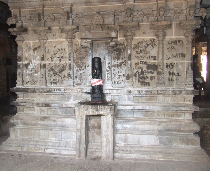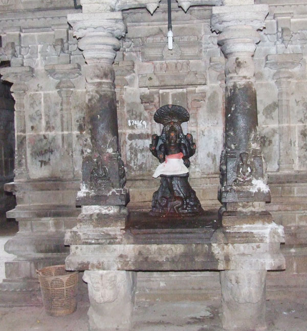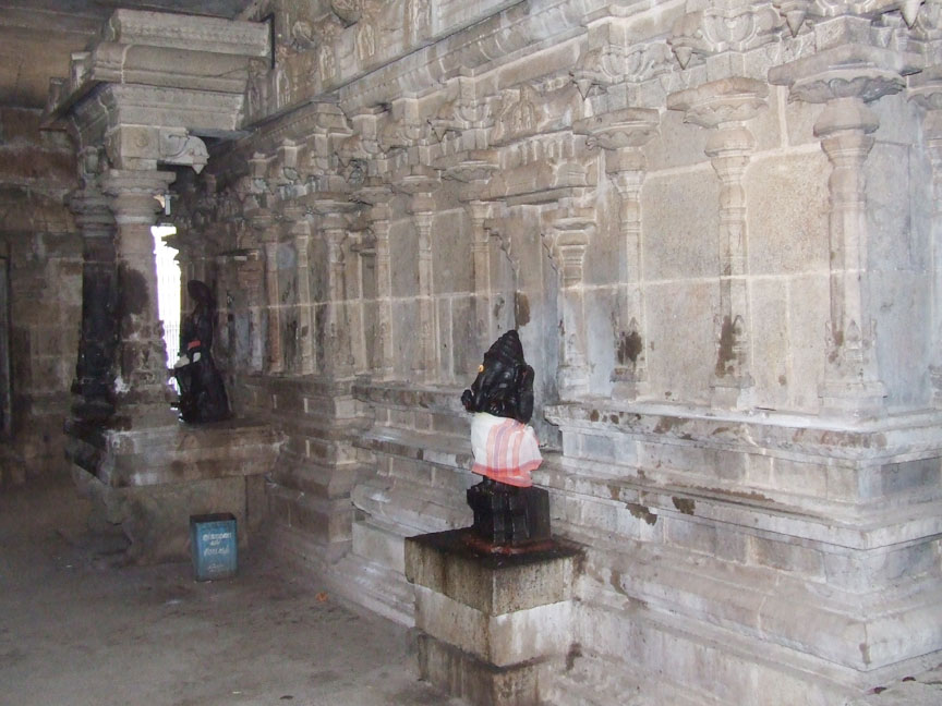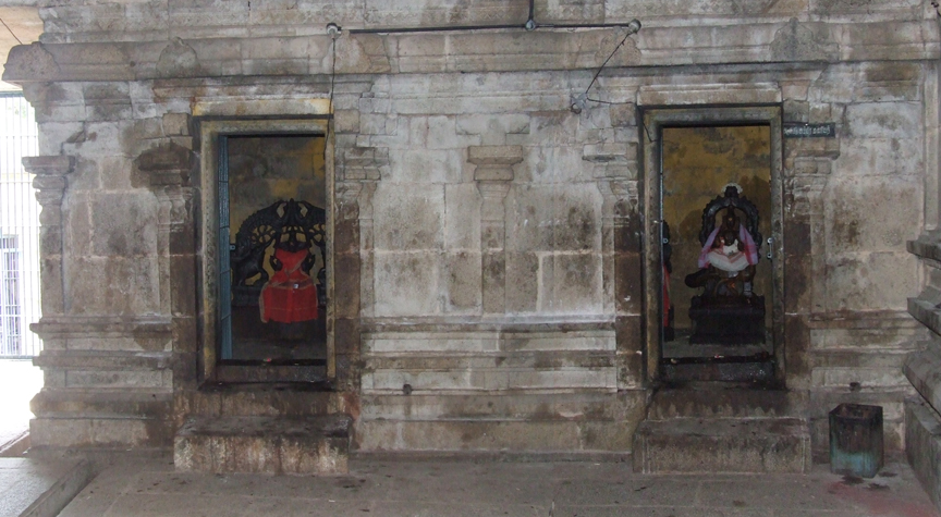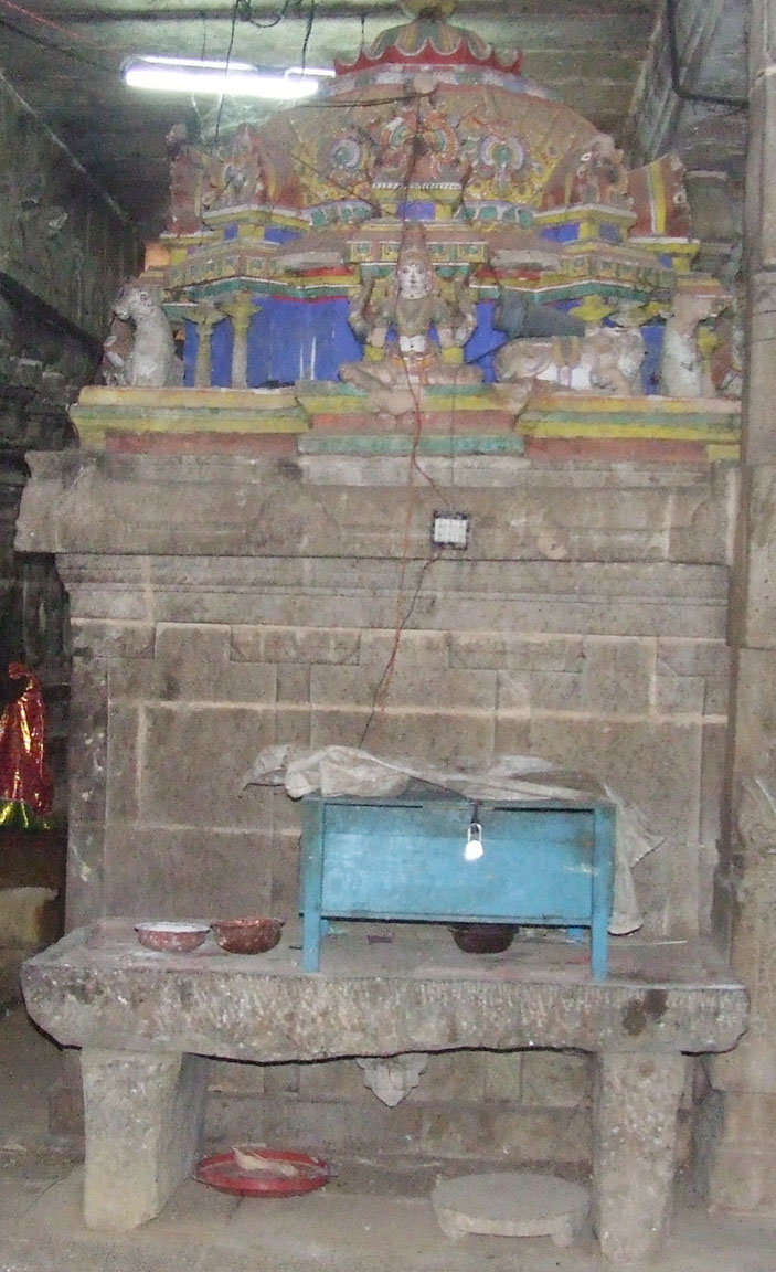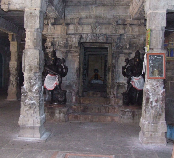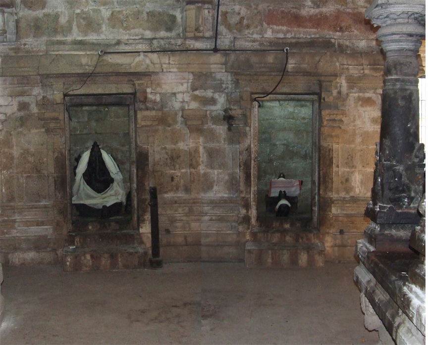 From the corridor one can reach the western side of the mandapa through the steps arranged in the front. Comparing to the eastern side the mandapa in the west is little higher in floor level and also fully closed. The Banu Umapathiswara shrine is seen in the middle facing east. Behind this shrine there are two pairs of small sanctums. The pair in the south is dedicated to Vinayaga and Siva, whereas the pair in the north houses Gajalakshmi and Subramanya. To the north of Banu Umapathiswara shrine a small shrine for Chadikeswara is seen facing south.