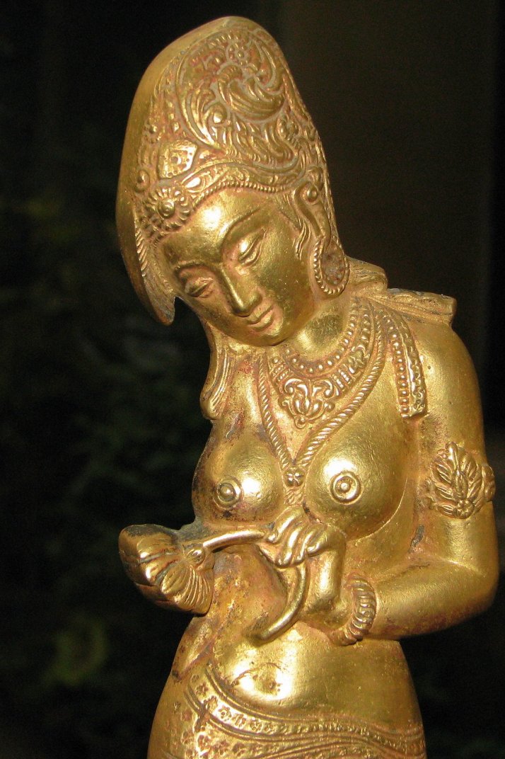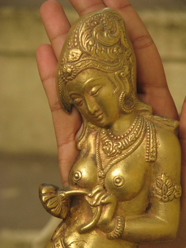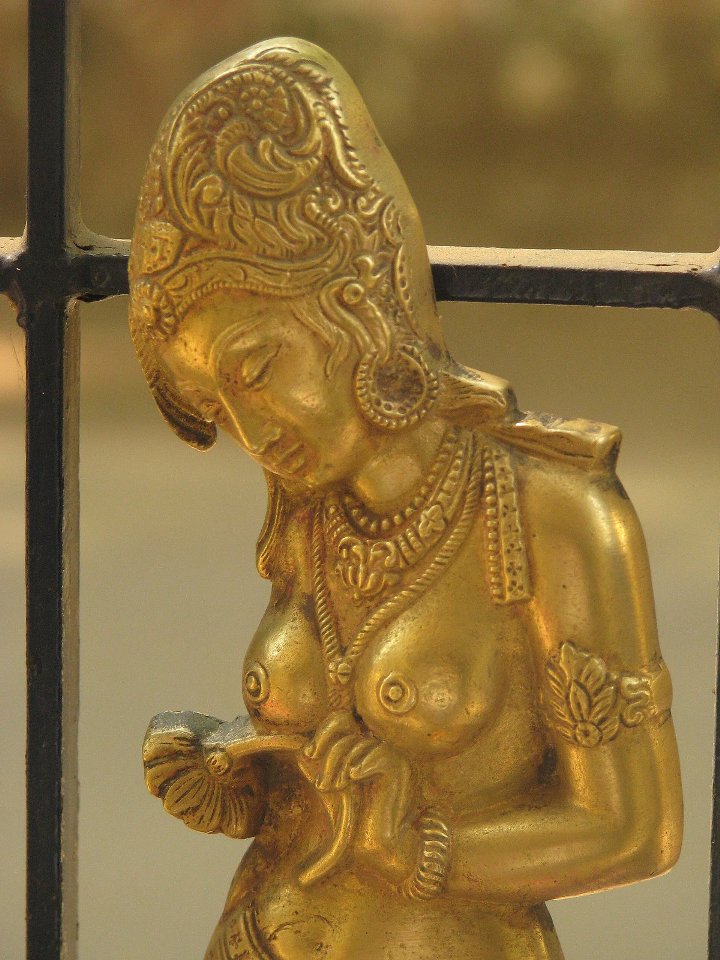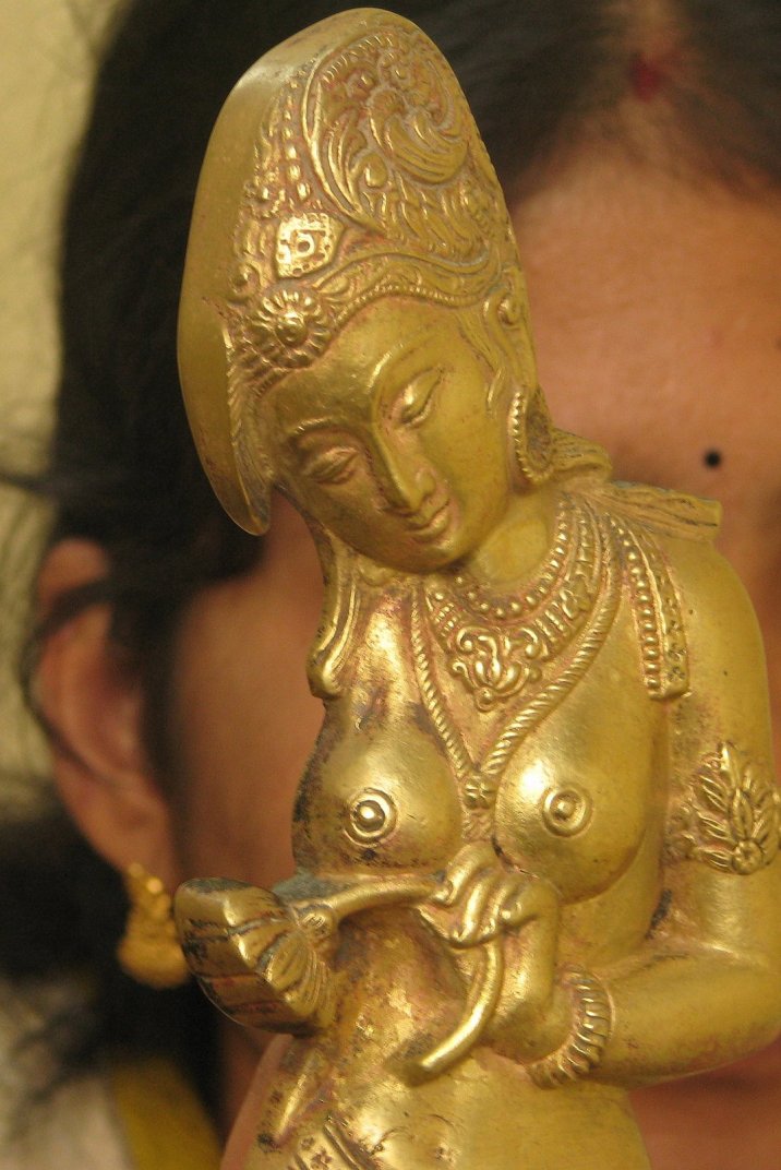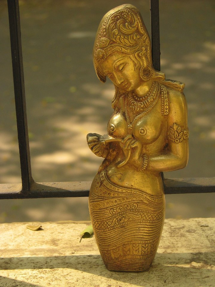 நலம்தானே? உங்களுக்கெழுதி மாதங்கள் பல ஆகிவிட்டன. எழுதுவெதென்பது என்ன என்றே மறந்து போய்விட்டது. நாம் சென்ற பயணங்களும், எழுதிய கட்டுரைகளும், கண்ட காட்சிகளும் கிட்டத்தட்ட பூர்வ ஜென்ம வாசனை போலத்தான் ஒட்டிக் கொண்டிருக்கிறது என நான் நினைத்திருந்த வேளையில், அந்த அதிசயம் நிகழ்ந்தது. என் புது மனைக்கு அழகு சேர்க்க அங்காடிக்குச் சென்றேன் மனைவியுடன். நவீனமான ஷாப்பிங் மால் அல்ல அவ்விடம். குறுகலான பாதைகளும், அரையிருள் காட்சிகளும், 'என்ன புக் சார் வேணும்?', 'இராஜராஜன் காசு பாக்றியா சார்?', 'கிட்டப்பா கிராமஃபோன் கிடைக்குமா?' போன்ற பல ஒலிகள் ஒரே சமயத்தில் நம் காதில் விழுந்தும் விழாமல் போகும் இடமது. உங்களுக்கும் பரிச்சயமான இடமாகத்தான் இருக்கும். சென்னையில் அதிகம் திரியாதவராயினும், குறைந்த பட்சம் கேள்வியேனும் பட்டிருப்பீர்கள். பழமையில் வேர்களைத் தேடும் நம் அனைவருக்கும் பிடித்த இடமாகத்தான் இருக்க முடியும் அவ்விடம். சரி சரி..போதும் பீடிகை. சென்ட்ரல் இரயில் நிலையம் அருகில் இருக்கும் 'மூர் மார்க்கெட்'-தான் அவ்விடம். வரவேற்பறையில் வழக்கமான பொம்மைகளையும், உபயோகப்படாத பீங்கான் கோப்பைகளையும் வைக்காமல், சற்றே வித்தியாசமான வகையில் ஏதேனும் வைக்கலாம் என்று மூர் மார்க்கெட்டில் உள்ள பழம்பொருள் அங்காடிக்குச் சென்றோம். உடைந்தும், கீறல் விழுந்தும், வண்ணம் உதிர்ந்தும் இருக்கும் பொருட்களுள் பல எங்கள் நெஞ்சை அள்ளின. ஆங்கிலேய ஆட்சியில் கோலோச்சிய தொலைபேசியும், இசையில் தன்னையே தொலைத்து, விரல்களை இறகாக்கி இழைவானில் பறப்பதை அற்புதமாய்ப் படம் பிடித்த உலோக படிமம் ஒன்றையும், பழைய கிராமஃபோனின் நகல் ஒன்றையும், கால்களை மடித்து ஆசுவாசப்படுத்திக் கொண்டிருக்கும் அழகிய வேலைபாடுகள் நிறைந்த மர ஒட்டகமும் வாங்கினோம். அப்போதுதான் அவள் என் கண்ணில் பட்டாள். கரியவள். தலை குனிந்தவள். அவளே கைப்பிடி. அவள் கைப்பிடித்திருந்தது ஓர் அன்றலர்ந்த தாமரையை. 7-ஐத் திருப்பிப் போட்டது போன்ற கூரான நாசியும், தெளிவான முத்து மாலையும், எழிலான சரப்பளியும் என்னைச் சுண்டியிழுத்தன. மாமல்லபுரத்தில் அர்ஜுன ரதத்தில் ஒசிந்து நிற்பவளும், ஸ்ரீநிவாசநல்லூரில் கோட்டச் சுவரில் உறுப்பிழந்தும் செழுப்பழியாது நிற்பவளும் இவளுக்குத் தூரத்து உறவாக இருப்பார்களோ என்றெண்ணி அருகில் சென்று விசாரித்தேன். அவர்கள் இவளுக்குப் பல தலைமுறைகள் முன்னால் பிறந்த (இளமை மாறாப்) பாட்டிகளாம். அந்த விரல்கள்... அற்புதக் கடக முத்திரையைக் கண்டபோதெல்லாம் காஞ்சி கைலாசநாதர் கோயில் உமையவளின் கடகக்கைகள் நினைவுக்கு வரும். இனி இவள் விரல்களும் நினைவில் வரும். மெத்து மெத்துத் தண்டினை மென்மலரால் பிடி
