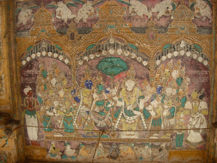 மதுரை மீனாட்சியம்மன் திருக்கோயிலில் அழிந்தவை போக எஞ்சியிருக்கும் நாயக்கர் கால ஓவியங்கள் பொற்றாமரைக் குளத்தின் மேற்குக் கரை மண்டபக் கூரையில் இன்றளவும் காணுமாறு உள்ளன. நாயக்க அரசி மங்கம்மாளும் அவருடைய தளவாய் இராமப்பரும் இடம்பெற்றிருக்கும் அங்கயற்கண்ணி சொக்கர் திருமணக்காட்சி இக்கூரையின் முதன்மை ஓவியமாய் வரையப்பட்டுள்ளது. ஓவியத்தில் இறைவனும் இறைவியும் திருமணக்கோலத்தில் நிற்கின்றனர். இறைவியின் வலக்கை இறைவன் கைத்தலம் பெற நீண்டுள்ளது. இடக்கையில் மலர்ச்செண்டு. இறைவனின் வலக்கை இறைவியின் கைமீது இருத்தப்பட்டுள்ளது. அவரது இடக்கையிலும் மலர்ச்செண்டு. இறைவனின் பின்கைகளில் மழுவும் மானும். இறைவியின் வலப்புறத்தே சங்கும் சக்கரமும் ஏந்தியவாறு நீலவண்ண மேனியராய்த் திருமால் காட்டப்பட்டுள்ளார். தேவர்கள் இருபுறத்தும் சூழ நின்று வணங்கி வாழ்த்த நிகழும் இந்தத் திருமணக் காட்சியைக் கைக்கூப்பி வணங்கிய நிலையில் வலப்புறத்தே இராமப்பரும் இடப்புறத்தே அரசி மங்கம்மாளும் கண்டு மகிழும் நிலையில் வரையப்பட்டுள்ள இந்த ஓவியம் நாயக்கர் காலப் பண்பாடு, நாகரிகம் அறியப் பெருந்துணையாகிறது. ![]() தலைப்பாகை அணிந்து வெள்ளை வேட்டியும் இடுப்பில் மடித்துக் கட்டிய பச்சைத் துண்டுமாய்க் காட்சிதரும் இராமப்பரின் கழுத்தில் இருபுறமும் தொங்குமாறு நீளத்துண்டு. கழுத்தில் முத்துமாலை. அரசி மங்கம்மாள் வெள்ளாடை அணிந்திருக்கிறார். மேற்சட்டையும் வெள்ளாடையாகவே உள்ளது. தலையலங்காரம், கழுத்தணிகள் இவை குறிப்பிடத்தக்கவை. இருவர்தம் தலைக்கு மேலே தெலுங்கிலும் தமிழிலும் அவரவர் பெயர்கள் எழுதப்பட்டுள்ளன. இராமப்பருக்கு மேலிருக்குமாறு, 'ராஜராஜஸ்ரீ தழவா (தளவாய்) ராமப்பரய்யறவர்கள்' என்றும் அரசி மங்கம்மாளுக்கு மேலிருக்குமாறு, 'மகா ராஜமாண்னிய மகா ராஜராஜஸ்ரீ மங்கம்மா அவற்கள்' என்றும் தமிழில் எழுதப்பட்டுள்ளது. this is txt file |