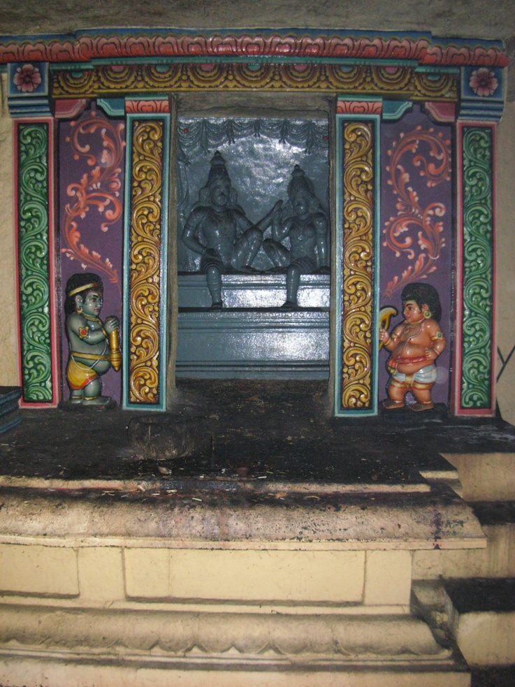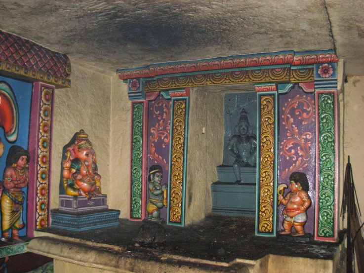 திருப்புத்தூர் சிவகங்கைப் பெருவழியில் ஒக்கூரிலிருந்து பிரியும் கீழப்பூங்குடிச் சாலை திருமலைக்கு வழிவிடுகிறது. கீழப்பூங்குடியில் இருந்து வலப்புறம் பிரியும் பாதையில் 4 கி. மீ. தொலைவு சென்றால் ஒரு கைக்காட்டியைச் சந்திக்கலாம். அதில் அளகைமாநகரி எனக் குறிக்கப்பட்டிருக்கும் திசையில் அரைக் கிலோமீட்டர் பயணித்தால் திருமலை மலைக்கொழுந்தீசுவரர் கோயில் கண்களில் படமாகிறது.1 மலையின் தாழ்வான பகுதியில் இடம்பெற்றிருக்கும் இந்தக் கோயில் வளாகத்தின் முதன்மை வாயில் கிழக்குப் பார்வையாக உள்ளது. மற்றொரு வாயில் வடபார்வையாக அமைந்துள்ளது. பாறையின் சரிவில் வெட்டப்பட்டிருக்கும் குடைவரையைப் பின்புலமாக்கி, அதன் முன்புறத்தே சுற்றுமாளிகை பெற்றுள்ள சுருங்கிய வளாகத்தில் சிவபெருமானுக்கொன்றும் பாகம் பிரியாதாள் என்றழைக்கப்படும் இறைவிக்கு ஒன்றுமாய் இரண்டு கற்றளிகள் உள்ளன. முதன்மை வாயில் எளிய இருதளக் கோபுரமாக அமைய, கீழ்த்தள ஆரவரிசையில் சாலைக்கான இடத்தில் இறைவனின் திருமணக்காட்சி அலங்கார வளைவுடன் அமைக்கப்பட்டுள் ளது. இருபுறத்தும் கர்ணகூடங்கள். கோபுரத்தைத் தழுவித் தெற்கு, வடக்கு நோக்கி நீளும் கிழக்கு மதில்சுவர் வடக்கில் விரிந்து, மேற்கில் படர்ந்து பாறையில் முடிகிறது. வாயிலின் தென்புறத்தே கிழக்குப் பார்வையில் பின்னாளைய கட்டுமானமாய் ஒருதள வேசரப் பிள்ளையார் கோயில் எழுந்துள்ளது. வளாகத்துள் வாயிலை ஒட்டி விரியும் கிழக்கு மாளிகைப்பத்தியில் வடபுறம் சந்திரனும் தென்புறம் சூரியனும் நிறுத்தப்பட்டுள்ளனர். குடைவரைக்கு அழைத்துச் செல்லும் வழிக்கு முன்னே தென்புறத்தே வடபார்வையாக நிற்பவர் மாவீரர் கருவ பாண்டியர். அடர்த்தியான மீசையுடன் கைகளைக் குவித்து வணங்கி கம்பீரமாய்க் காட்சியளிக்கும் இந்தப் பெரியவர் கோயில் காவலர்களின் முன்னோடியாம். அவரை அடுத்துக் குடைவரைக்கான படித்தளம் வளர்கிறது. ![]() வாயிலுக்கு நேர் எதிரே உள்ள மேற்கு மாளிகைப் பத்தியின் தென்புறத்தே அறை ஒன்றில் பிள்ளையாரும் அவருக்கு முன்னுள்ள நடைப்பத்தியில் மகிடாசுரமர்த்தனியும் உள்ளனர். கிழக்குப் பார்வையாக உள்ள பிள்ளையார் பிற்காலத்தவர். பின்கைகளில் பாசம், அங்குசம் பெற்று இலலிதாசனத்தில் உள்ள அவரது முன்கைகளில் இடப்புறம் மோதகம், வலப்புறம் உடைந்த தந்தம். அரும்புச்சரம், உதரபந்தம், முப்புரிநூல், கரண்டமகுடம் பெற்றுள்ள அவரது இடம்புரித் துளைக்கையிலும் மோதகம். நடைப்பத்தியில் உள்ள மகிடாசுரமர்த்தனிதான் இந்த வளாகத்துள்ள தனிச் சிற்பங்களுள் பழைமையானதாக உள்ளது. மகிடனின் தலைமீது இடப்பாதத்தைச் சமத்திலும் வலப்பாதத்தை, வலமுழங்காலை இலேசாக மடக்கிய நிலையில் திரயச்