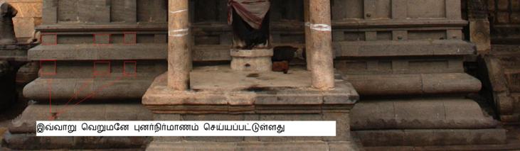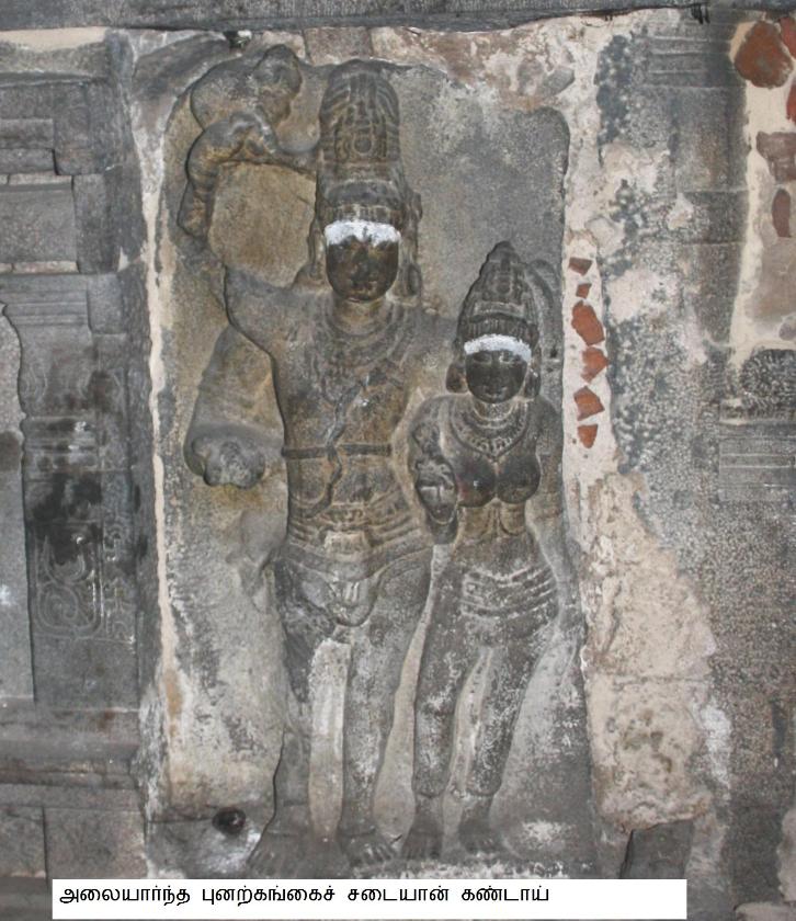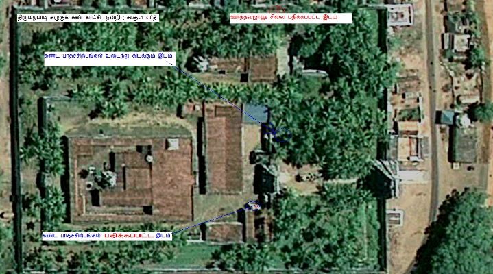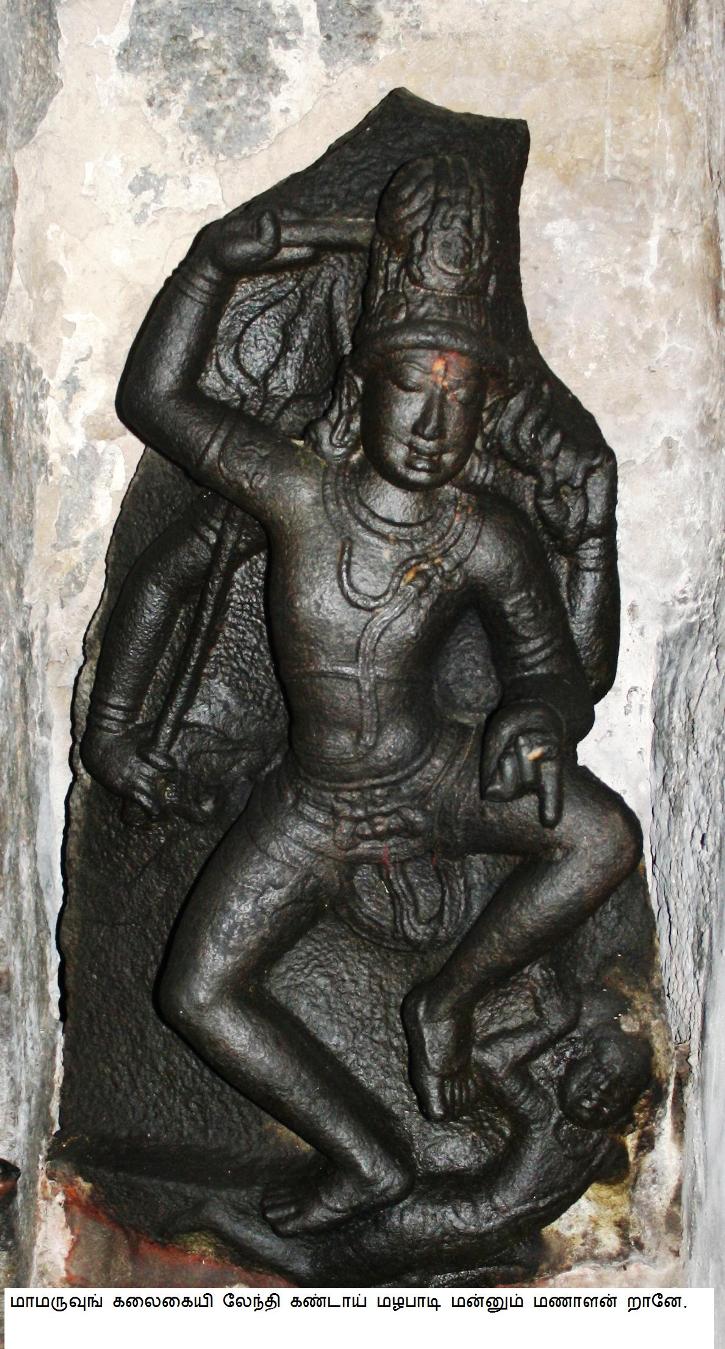 காச்சி லாதபொன் நோக்குங் கனவயி ரத்திரள் ஆச்சி லாதபளிங்கினன் அஞ்சுமுன் ஆடினான் பேச்சி னாலுமக் காவதென் பேதைகாள் பேணுமின் வாச்ச மாளிகை சூழ்மழ பாடியை வாழ்த்துமே என்று ஆளுடைய பிள்ளையார் ”மாளிகை சூழ்மழ பாடி” என்றும் இதர பாடல்களில் “மாமழபாடி” என்றும் அழைக்கிறார் இது திருவையாற்றிற்கு வடமேற்கே சுமார் 6 கி.மீ. தூரத்தில் கொள்ளிடப்பேராற்றின் வடகரை மற்றும் மேற்கரையிலும் எழிலாக அமைந்துள்ளது (படம் பார்க்க) ![]() இறைவரின் திருப்பெயர் வயிரத்தூண்நாதர் இறைவியாரின் திருப்பெயர் அழகம்மை திருநந்திதேவர் திருவையாற்றிலிருந்து எழுந்தருளி - சுயசை அம்மை யாரை மணஞ்செய்துகொண்ட தலம். சுந்தரமூர்த்தி நாயனார், திரு வாலம்பொழிலில் எழுந்தருளியிருக்க, மழபாடி இறைவன், அவரது கனவில் தோன்றி, `சுந்தரா’ என வாஞ்சையுடன் அழைத்து “மழபாடிக்கு வர மறந்தனையோ?`` என்று வினவ, உடனே சுந்தரர் பொன்னார் மேனியனே புலித்தோலை அரைக்கசைத்து மின்னார் செஞ்சடைமேல் மிளிர்கொன்றை யணிந்தவனே மன்னே மாமணியே மழபாடியுள் மாணிக்கமே அன்னே உன்னையல்லால் இனியாரை நினைக்கேனே என்று சுந்தரரும், தாமரையான் தன்றலையைச் சாய்த்தான் கண்டாய் தகவுடையார் நெஞ்சிருக்கை கொண்டான் கண்டாய் பூமலரா னேத்தும் புனிதன் கண்டாய் புணர்ச்சிப் பொருளாகி நின்றான் கண்டாய் ஏமருவு வெஞ்சிலையொன் றேந்தி கண்டாய் இருளார்ந்த கண்டத் திறைவன் கண்டாய் மாமருவுங் கலைகையி லேந்தி கண்டாய் மழபாடி மன்னும் மணாளன் றானே என்று அப்பர் பெருந்தகையும் பதிகம் பாடி வழிபட்ட மாமழபாடியாம். சேரர் கிளையினராகிய மழவர் இவ்வூரில் உறைந்தமையால் இப்பெயர் பெற்றது. சிவபெருமான் மழுநிர்த்தஞ்செய்த தலமாதலாலும் மழுவாடி ஆயிற்று என்பர். அப்பர் பெருமானின் பாடல் வரிகளுடன் இத்திருக்கோயிலின் சிற்பங்களை கண்டு இன்புறுமாறு வாசகப் பெருமக்களை அழைக்கிறோம் ![]() ![]() ![]() வழக்கத்திற்கு மாறாக உமையை வலப்பக்கம் கொண்டருளியுள்ளார் ![]() ![]() இவ்வாறு இத்திருக்கோயிலில் பழமையான கண்கவரும் சிற்பங்கள் இருந்த போதிலும் கோயிலை முழுமையாகச் சுற்றி வந்து நாம் கண்ட காட்சி நம்மை மகிழ்ச்சி கொள்ளச்செய்வதற்குப் பதில் வருத்தத்தையே ஏற்படுத்தியது. திருக்கோயில் புதுப்பிக்கப்பட்டபோது,கோயிலின் கட்டுமாணத்தை முழுவதுமாக புதியதாக மாற்றி நம்முடைய பாரம்பரிய கலைச்சின்னங்களைப் புதிய தலைமுறை கண்டு மகிழாவண்ணம் மாற்றம் செய்து விடுகின்றனர். உதாரணமாக இத்திருக்கொயிலின் அதிஷ்டானம் கீழ்க்கண்டவாறு கண்ட பாதத்தில் சிற்பங்கள் பெற்று இருந்திருக்கும். (இருந்தமைக்குச் சான்று இக்கட்டுரையிலேயே கொடுக்கப்பட்டுள்ளது) ![]() ஆனால், ![]() அப்படியானால் இங்குள்ள சிற்பங்கள் எங்குச் சென்றிருக்கும்?. 