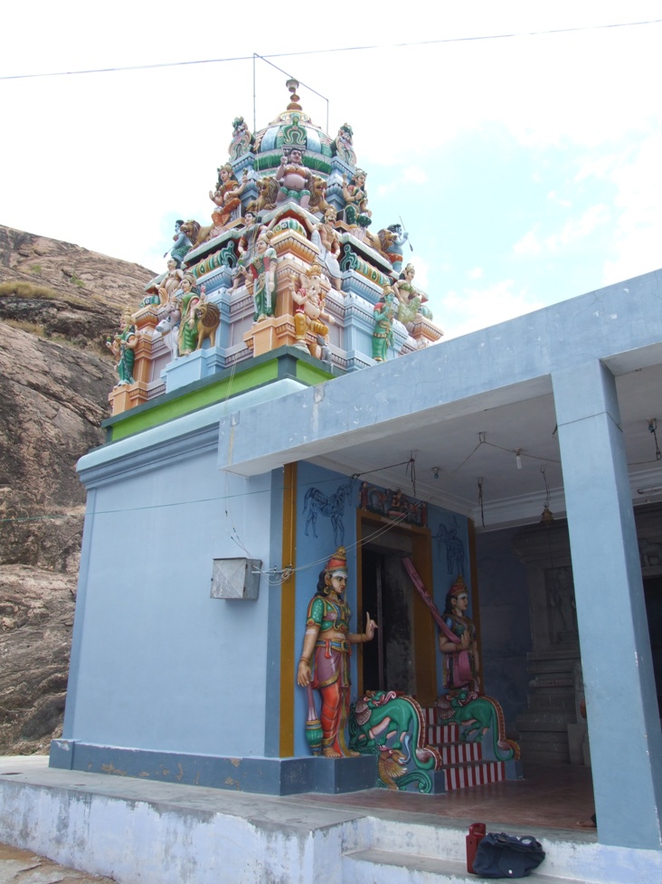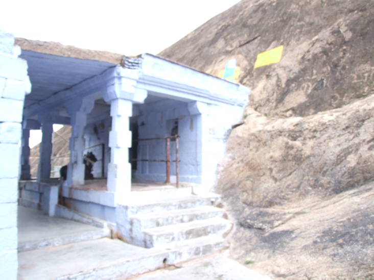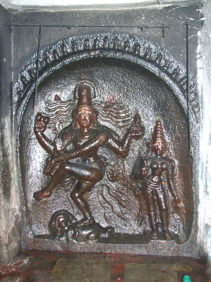 குடைவரைக்கு முன்னால் ஒரு மண்டபமும் அதற்கு முன்னால் சிறிய அளவிலான நந்திமண்டபமும் காணப்படுகின்றன. கருவறையை நோக்கி நந்தி அமர்ந்துள்ள இம்மண்டபத்தை அடைய மலைத்தளத்திலிருந்து படிகள் உள்ளன. நந்திமண்டபத் தளத்தின் தென்முகப்பிலும் அதன் மேற்கிலுள்ள மண்டப முகப்புச் சுவரின் இருபுறத்திலும் கல்வெட்டுகள் காணப்படுகின்றன. ![]() குடைவரையின் முன்னும் நந்திமண்டபத்தின் பின்னுமாய் அமைந்திருக்கும் மண்டபத்தை முன்மண்டபமாகக் கொள்ளலாம். அதன் முகப்புச் சுவர் நடுவே வாயில் காட்டப்பட்டுள்ளது. வாயிலின் வலப்புறம் உள்ள சுவர்ப்பகுதியில் பிள்ளையார் சிற்பம் உள்ளது. உட்புறத்தே இம்மண்டபம் குடைவரையோடு பக்கங்களிலும் மேலும் கீழுமாய்ப் பொருந்த இணைக்கப்பட்டுள்ளது. குடைவரை முகப்பு முழுத்தூண்களுக்கு முன்னால் இரண்டு தூண்கள் எழுப்பி அவற்றின் மேல் உத்திரம் நிறுத்தி, மண்டப முன்சுவருக்கும் இதற்கும் இடையில் கற்கள் பாவிக் கூரையாக்கியிருக்கிறார்கள். இத்தூண்கள் பின்புறத்தில் நான்முகத் தூண்களாகவும் முன்புறத்தே சதுரம், முப்பட்டை, சதுரம் என்ற அமைப்பிலும் உருவாக்கப்பட்டுள்ளன. முகப்பு, மண்டபம், கருவறை என்ற அமைப்பில் குடைவரை அகழப்பட்டுள்ளது. தென்வடலாக 5. 15 மீ. நீளமும் கிழக்கு மேற்காக 67 செ. மீ. அகலமும் உள்ள முகப்பில் இரண்டு முழுத்தூண்களும் இரண்டு அரைத்தூண்களும் சதுரம், கட்டு, சதுரம் என்ற அமைப்பில் காணப்படுகின்றன. ![]() தூண் சதுரங்களின் மேற்குத் தவிர்த்த பிற முகங்களில் மலர்ப்பதக்கங்கள் முயற்சிக்கப்பட்டுள்ளன.2 முழுத்தூண்களின் மேற்சதுர முகங்கள் இரண்டில் இவை நன்கு உருவாகியுள்ளன. இப்பதக்கங்களின் நடுவில் ஒன்றில் சிம்மமும் மற்றொன்றில் யாளியும் அமைய, வடமுழுத்தூணின் கீழ்ச்சதுரத் தென்முகத்தில் அன்னம் உள்ளது. வடிவங்கள் காட்டப்பெறாத பதக்கங்கள் தாமரையிதழ்களோடு அமையச் சிற்பங்களோடு திகழும் பதக்கங்கள் தாமரையல்லாத மலரிதழ்கள் சூழத் திகழ்கின்றன. ![]() தூண்களின் மேலுள்ள போதிகைகள் விரிகோணக் கைகளால் உத்திரம் தாங்க, மேலே கூரை. உத்திரத்திற்கும் கூரைக்கும் இடையில் வழக்கமாகக் காணப்படும் வாஜனத்தை இங்குக் காணக்கூடவில்லை. தென்வடலாக 5. 50 மீ. நீளமும் கிழக்கு மேற்காக 1. 16 மீ. அகலமும் கொண்டமைந்துள்ள முகமண்டபத்தின் தரை சிமெந்துப்பூச்சுப் பெற்றுள்ளது. மண்டபத் தென்சுவர் வெறுமையாக அமைய, வடசுவரில் தரையிலிருந்து 78 செ. மீ. உயரத்தில் 1. 25 மீ. அகல, 1. 54 மீ. உயர, 15 செ. மீ. ஆழக் கோட்டம் அகழ்ந்து, ஆனந்தத்தாண்டவச் சிவபெருமானையும் அருகில் உமையையும் செதுக்கியுள்ளனர். கோட்டத்தின் மேற்பகுதி பிறையென வளைக்கப்பட்டுள்ளது. பின்சுவரின் நடுப்பகுதியில் அகழப்பட்டுள்ள கருவறை உபானம், ஜகதி