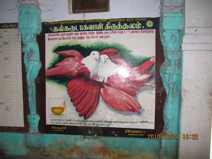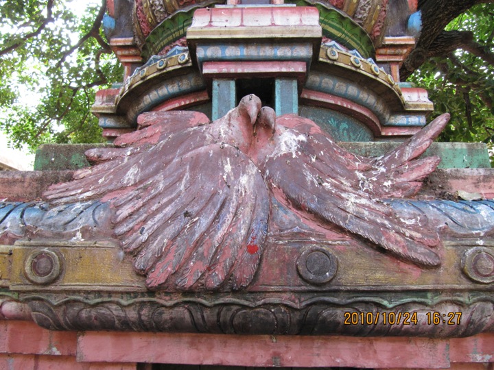 ![]() திருக்கோயில் வளாகத்தின் இரண்டாம் கோபுரத்தை அடுத்து விரியும் அரவணை அரங்கப்பையன் திருமண்டபத்தின் தென்கிழக்குச் சுவரில், இக்கோயிலுக்குப் பூசை நேரத்தில் வந்து கொண்டிருந்த இரண்டு கருடப்பறவைகள் 18. 1. 1999 தைத்திங்கள் சிரவணத்தன்று, தலமரமான மகிழமரத்திற்குக் கீழே இணையாக மோட்சமடைந்தன என்ற தகவல் எழுதப்பட்டுள்ளது. இறந்த பறவைகளின் படம் அங்கு வரையப்பட்டிருப்பதுடன், அப்பறவைகள் அடக்கம் செய்யப்பட்ட இடத்தில், 21. 1. 1999 வியாழனன்று மாலை இந்து சமய அறநிலைய ஆட்சித்துறையின் மயிலாடுதுறைப் பகுதி இணை ஆணையர் திரு. ப. தனபால் பறவைகளின் படத்தைத் திறந்து வைத்து, மோட்ச தீபம் ஏற்றி, இலட்சதீபம் கொண்டாடச் செய்தமைக்கான குறிப்பும் உள்ளது. இந்நிகழ்வின்போது கோயில் செயல் அலுவலராக இருந்தவர் திரு. எம். வேதகிரி. உதவி ஆணையராக இருந்தவர் திரு. சி. இலட்சுமணன். சுவரில் காணப்படும் ஓவியத்தை வரைந்தவர் கும்பகோணத்தைச் சேர்ந்த திரு. முத்து. ![]() இம்மண்டபத்தின் தெற்கு வாயில் வழி விரியும் இடைச்சுற்றின் தென்புறத்தே உள்ள மகிழமரத்தை ஒட்டி இறந்த பறவைகளுக்கான கருடமோட்ச நினைவகம் அமைக்கப்பட்டுள்ளது. நன்கு இதழ் விரித்த தாமரை மலர் மேல் துணைத்தளமும் நான்முக அரைத்தூண்கள் அணைத்த சுவரும் போதிகைகள் தாங்கும் உத்திரமும் தாமரை வலபியும் கபோதமும் பெற்று ஒருதள வேசர விமானமாக உருவாக்கப்பட்டுள்ள இந்நினைவகத்தின் வாயில், பக்கச் சுவர்களினும் சற்றுப் புறந்தள்ளியுள்ளது. வாயிலை ஒட்டிய தூண்களுக்கும் சுவர்த் திருப்பத் தூண்களுக்கும் இடைப்பட்ட சுவர்ப்பகுதிகள் வெறுமையான கோட்டங்களாகி யுள்ளன. கருவறையில் இறந்த பறவைகளின் ஒளிப்படம் வைக்கப்பட்டுள்ளது. முகத்தோடு முகம் சேர்ந்த நிலையில் மரத்தின் நிழலில் இருக்குமாறு போலக் காட்சியளிக்கும் அப்படம் உள்ளத்தை உருக்குகிறது. வாயிலுக்கு மேலிருக்குமாறு கபோதத்தின் தலைப்பில் பறவைகளின் சுதைவடிவக் காட்சியும் இடம்பெற்றுள்ளது. ![]() ![]() இந்நினைவகத்திற்கான கொடையாளி, தம் பெயரைத் தெரிவிக்க விழையாமல், தம்மை, 'ஸ்ரீசத்ய சாய்பாபா பக்தன்' என்று மட்டுமே அடையாளப்படுத்திக் கொண்டிருப்பது நினைவகத்தின் பெருமையை மேலும் பெருக்குகிறது. நன்றி மறவாமைக்கான நினைவகங்கள், நினைவுக்கற்கள் இவற்றைத் தமிழ்நாட்டில் பலவாகக் காணமுடிகிறது. ஆனால், தொடர்ந்து வந்த பூசைப் பங்கேற்பாளர்களுக்குக் கூட, அவை பறவைகளாக இருந்தபோதும், அவற்றின் மறைவுக்கு வருந்தி, அவை வந்து போன இடத்தில் நினைவகம் அமைத்திருப்பது புதுமையானதும் வியப்புக்குரியதுமான செயலாக அமைந்துள்ளது. இத்தகு எண்ணம் கொண்ட நல்ல உள்ளங்களையும் அந்த எண்ணத்திற்கு வடிவம் அளித்த அறநிலையத்துறை அலுவலர்களையும் வரல
